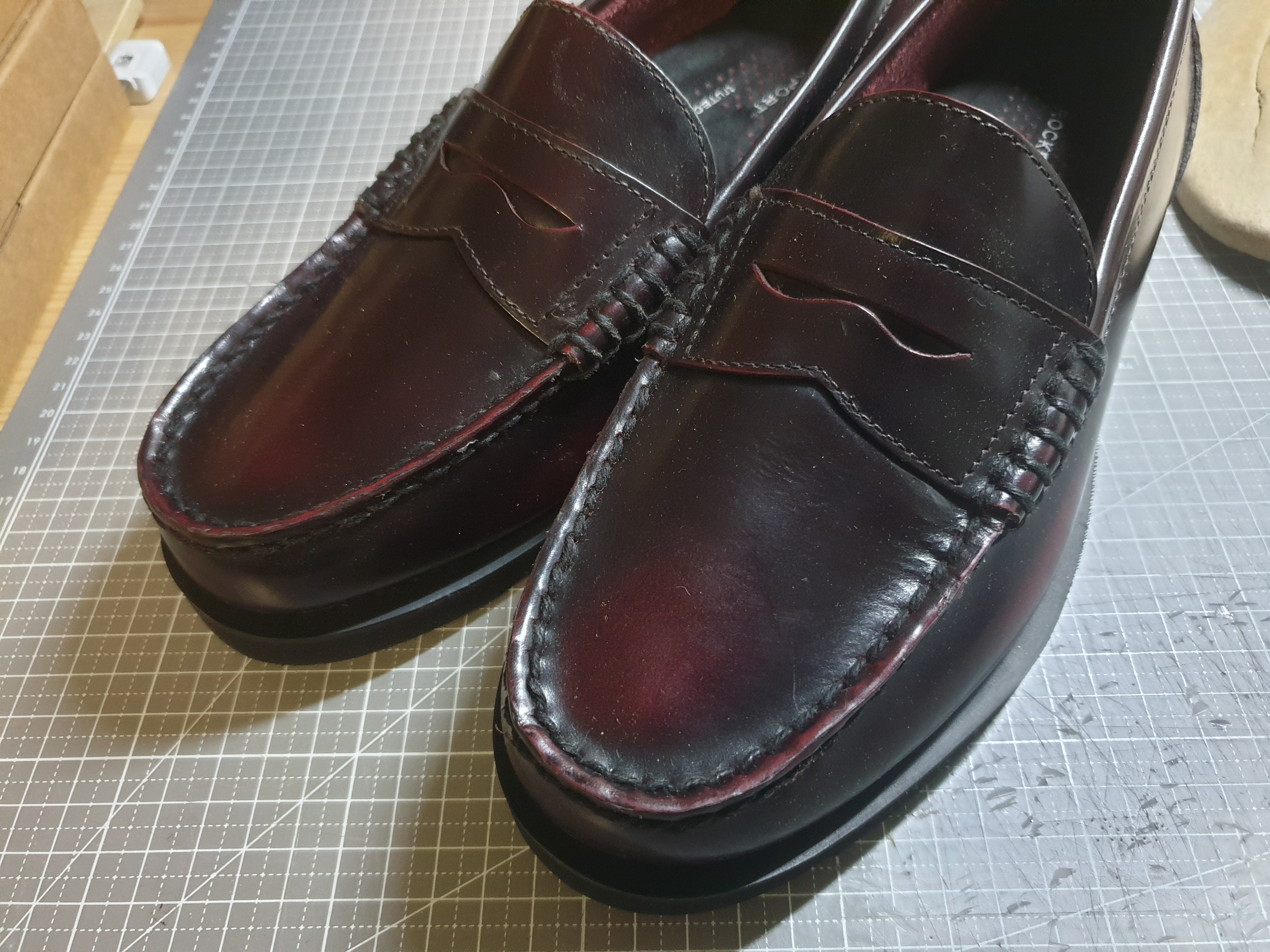 이렇게 보니 두 신발의 차이가 보인다. 구두의 앞코를 따라 둥글게 돌아나가는 부분이 낮느냐 높느냐의 차이로 볼 수 있다. 전반적으로 셰익스피어 서클로퍼가 조금더 옆라인이 살아있는 얄쌍한 느낌의 페니로퍼라는 생각이 든다.