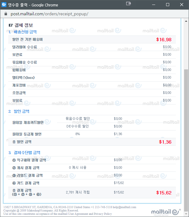 한번에 한 제품만 구입한게 아니었다. 몰테일 열차가 출발할때 다른것도 꽉 채워서 구입하느라 아래의 배송비 책정은 무게와 부피가 더해져 나오므로 어디까지나 참고용으로만 봐주시기를 부탁드린다.