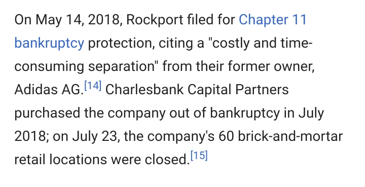 2018년에 실제로 경영이 어려워져 챕터11 파산방지 프로그램에 들어가서 파산 절차를 진행하다가 아디다스 그룹과 결별하고 찰스뱅크 캐피탈 파트너즈 사모펀드의 소속이 되었다. 이후는 안정적인 상태를 유지하고 있는 것 같다.