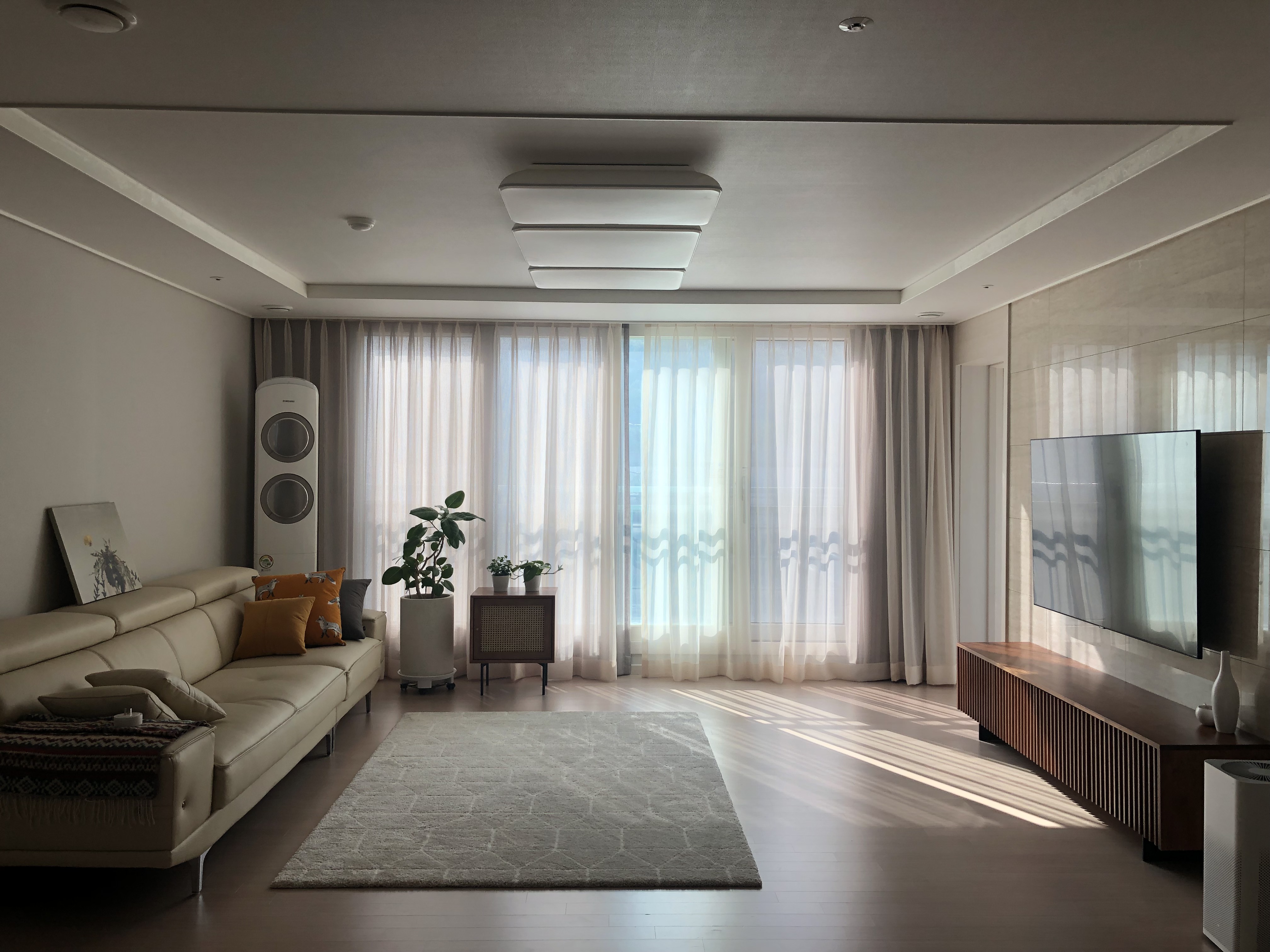 거실을 연출하는 다양한 방법이 있다. 소파와 테이블 놓기, 소파와 카페트 놓기, 아니면 요즘 유행하는 TV를 없애고 식탁놓기. 에디터는 신혼 살림을 준비할때, TV를 포기할 수 없었다. 도전적인 시도도 하고 싶지 않았다. 그냥 깔끔하고 최대한 넓어보이는 거실을 연출하고 싶었다. 깔끔하고 심플하고 "따뜻하게" 만들고 싶었다.