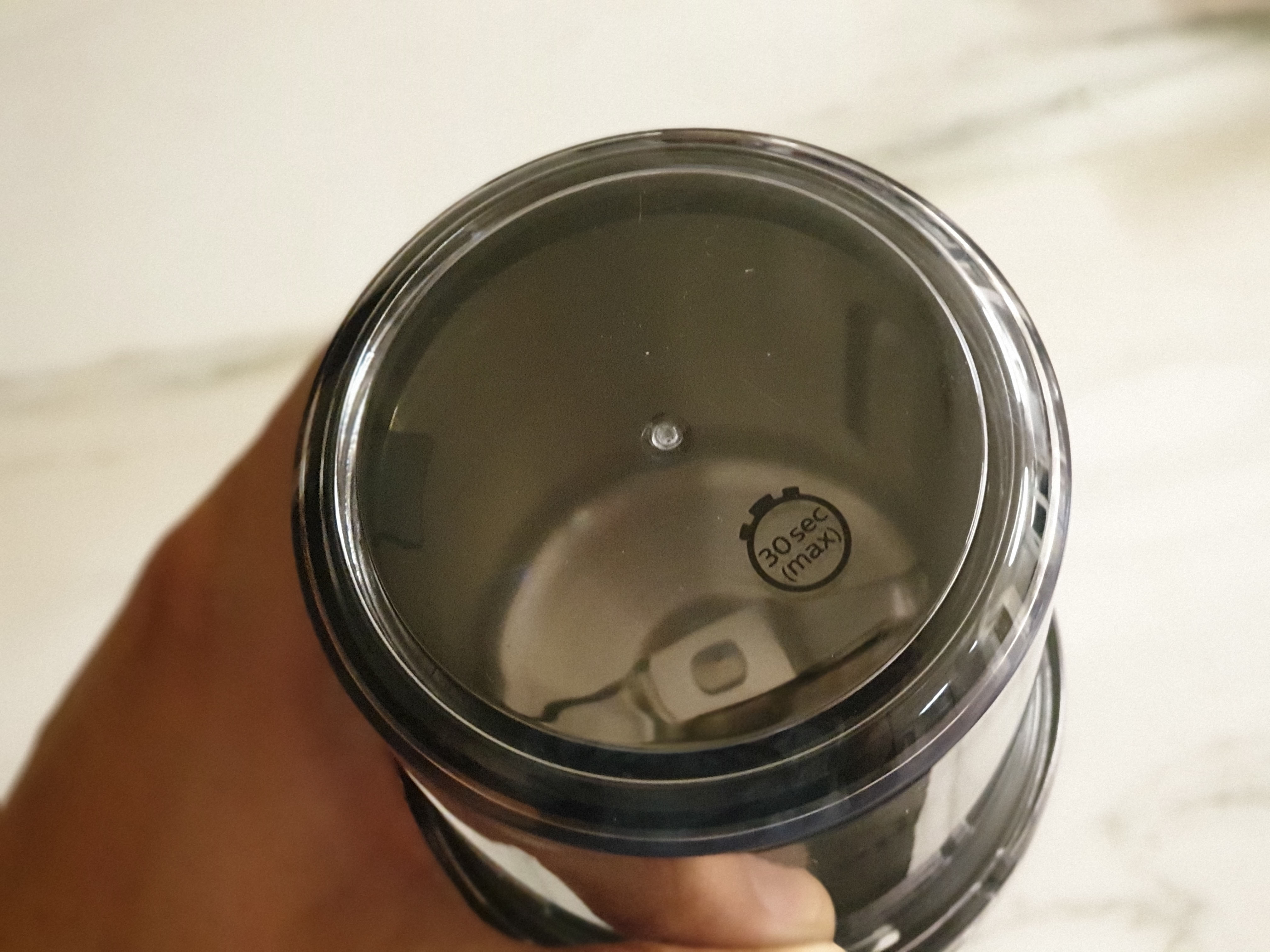 여기보이는 이 용기를 보여주고자 한다. 이건 마른 재료를 갈때 쓰는 작은 용기인데, 여기서 갈 수 있는 재료는 마늘/양파등의 채소류, 콩 등의 견과류를 갈 수 있다. 곱게 갈릴때까지 마음껏 돌리고 스트레스를 풀도록 하자.