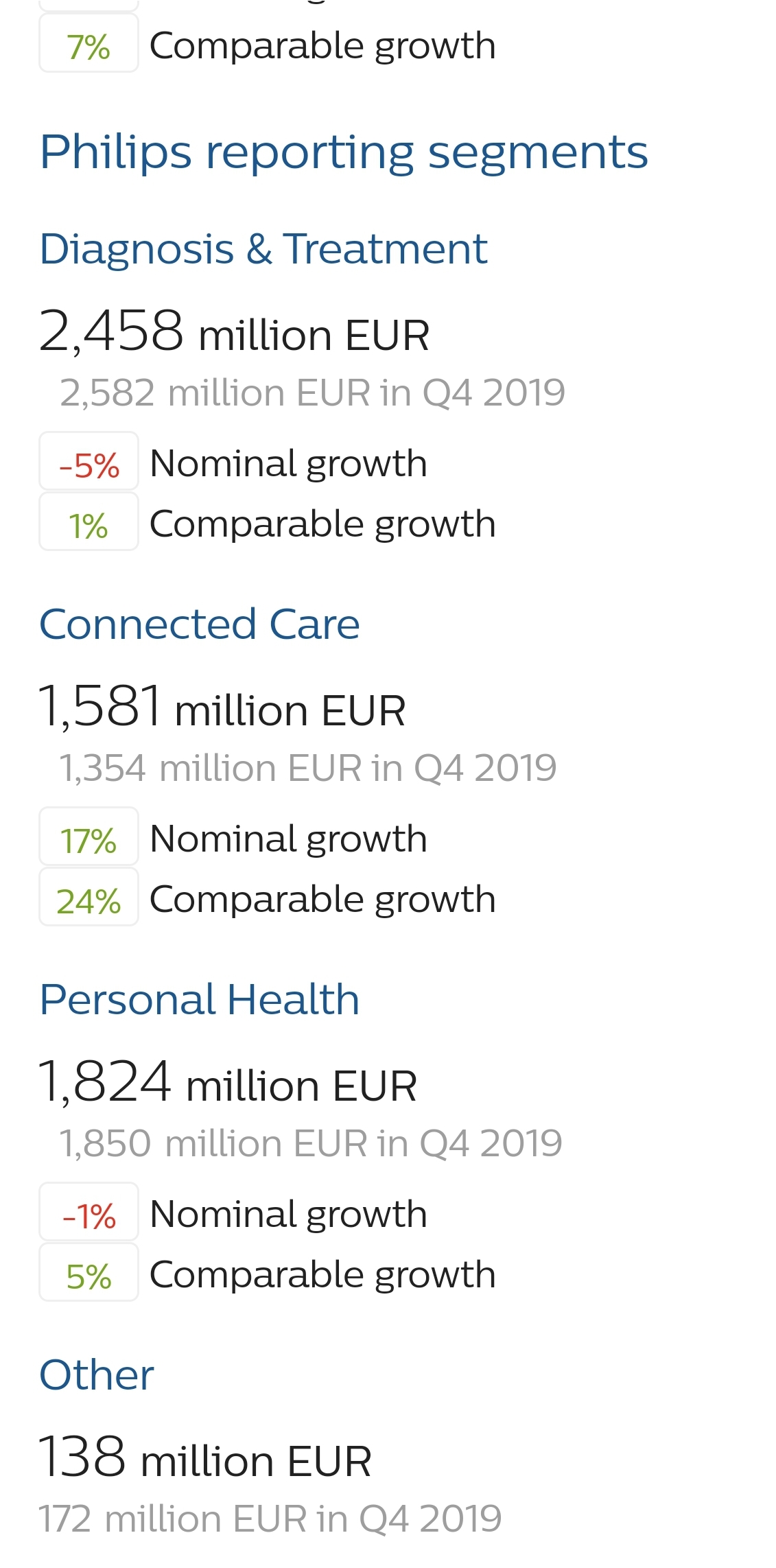 이미지로 깔끔하게 정리된게 2014년 자료라서 2020년 자료를 홈페이지에서 발췌했다. 2020년 4분기 전체 매출은 60억유로다. 의료기기와 연결서비스, 개인 헬스케어에서 매출의 대부분이 발생하고 있다. 그렇다면 과거의 영광을 상징하는 가전사업의 매출은? 그룹 전체 매출의 2.29퍼센트. 3퍼센트가 채 되지 않는다.