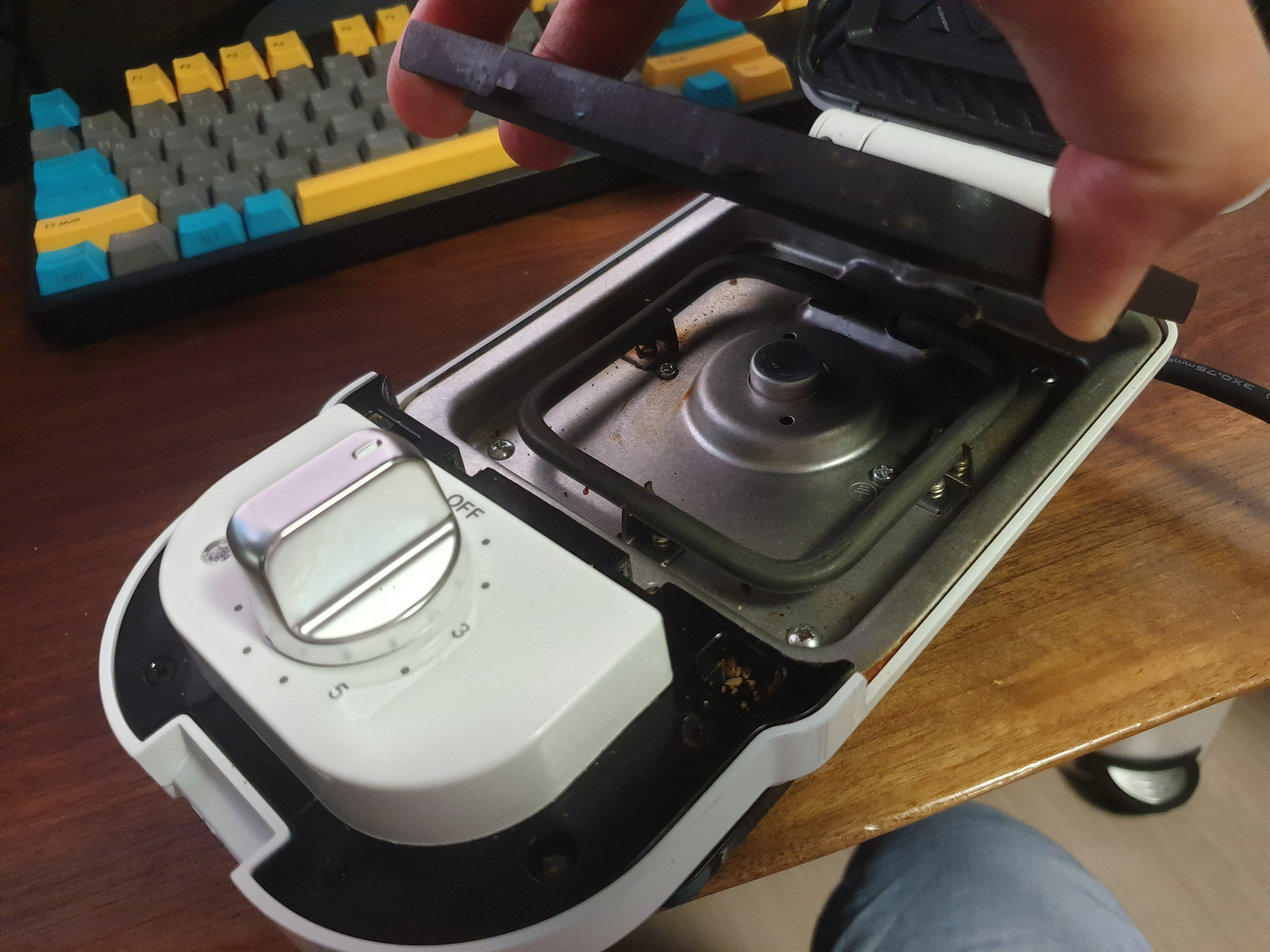 사용을 마친 샌드위치메이커는 위와같이 철판을 분리하는 레버를 이용해 철판을 분리해서 분리세척할 수 있다.