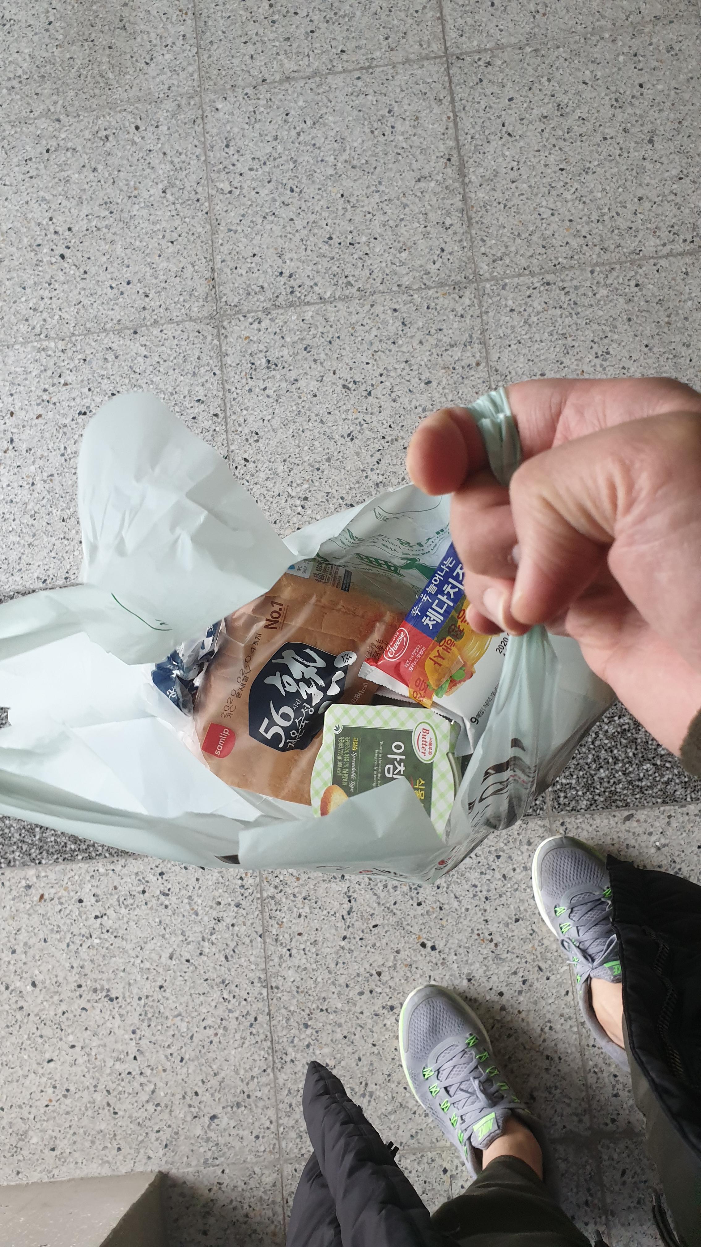쓰레기 봉투에 담아서 다녀온건 비밀. 식빵과 체다치즈, 버터를 사왔다.