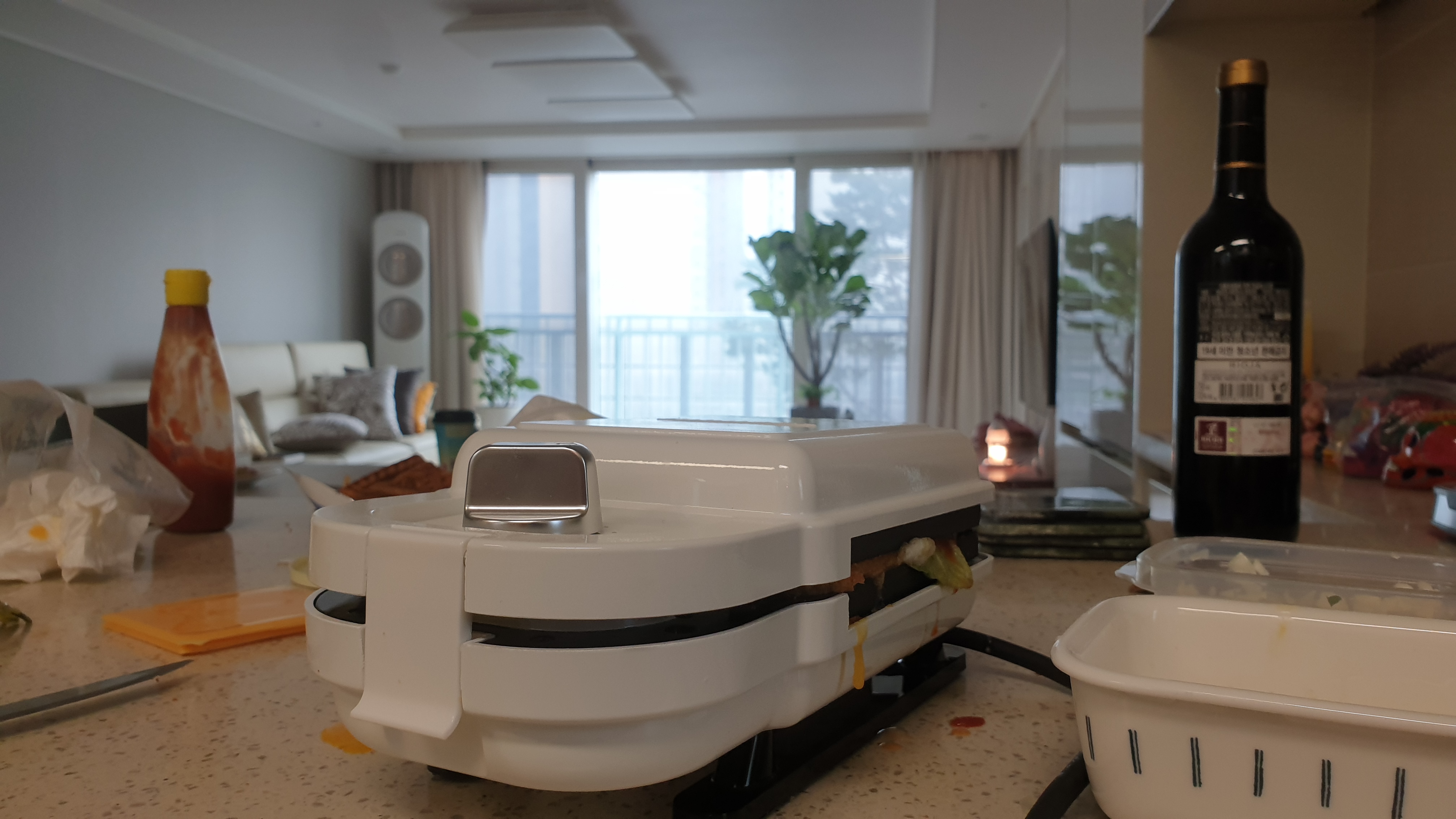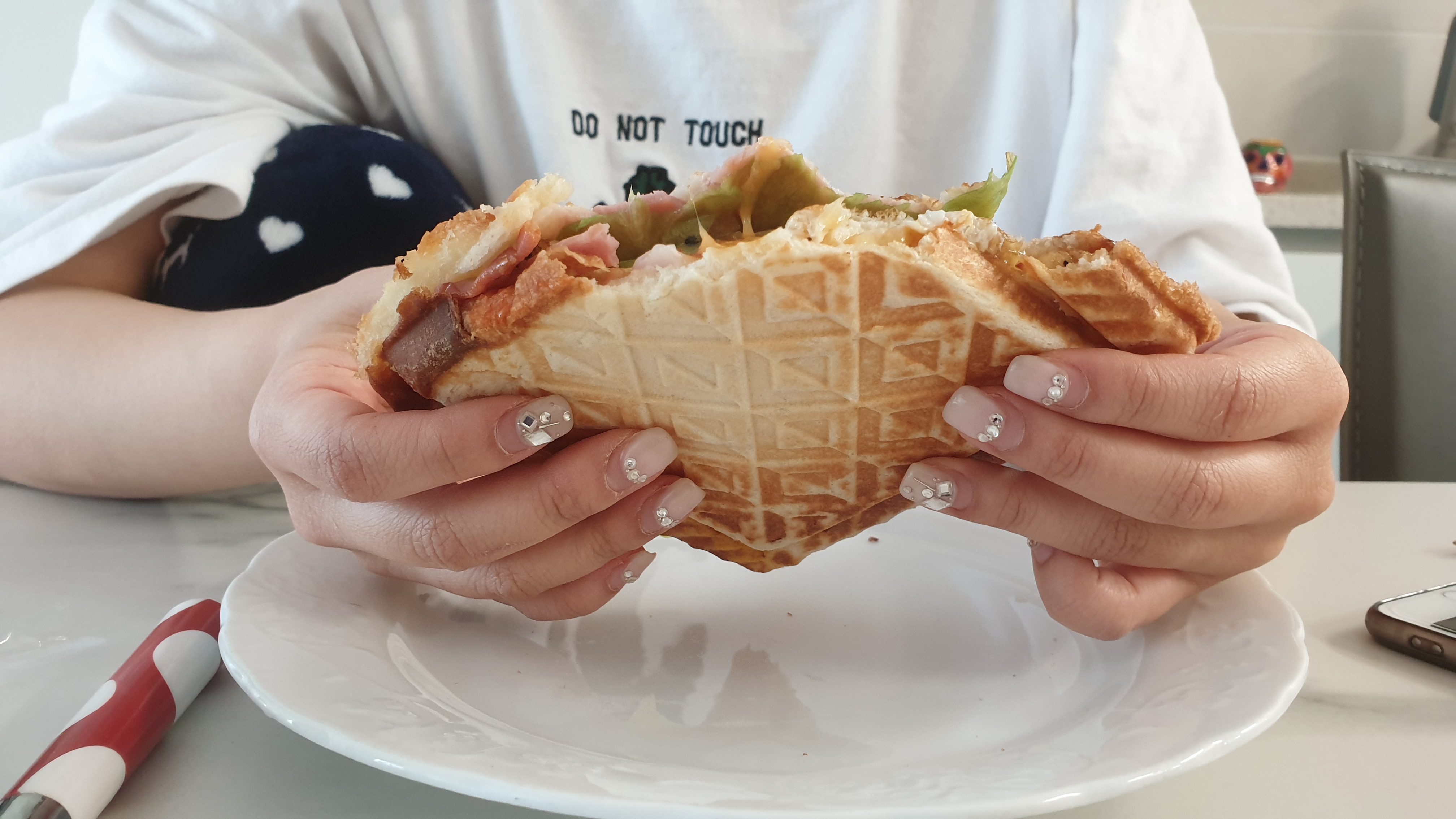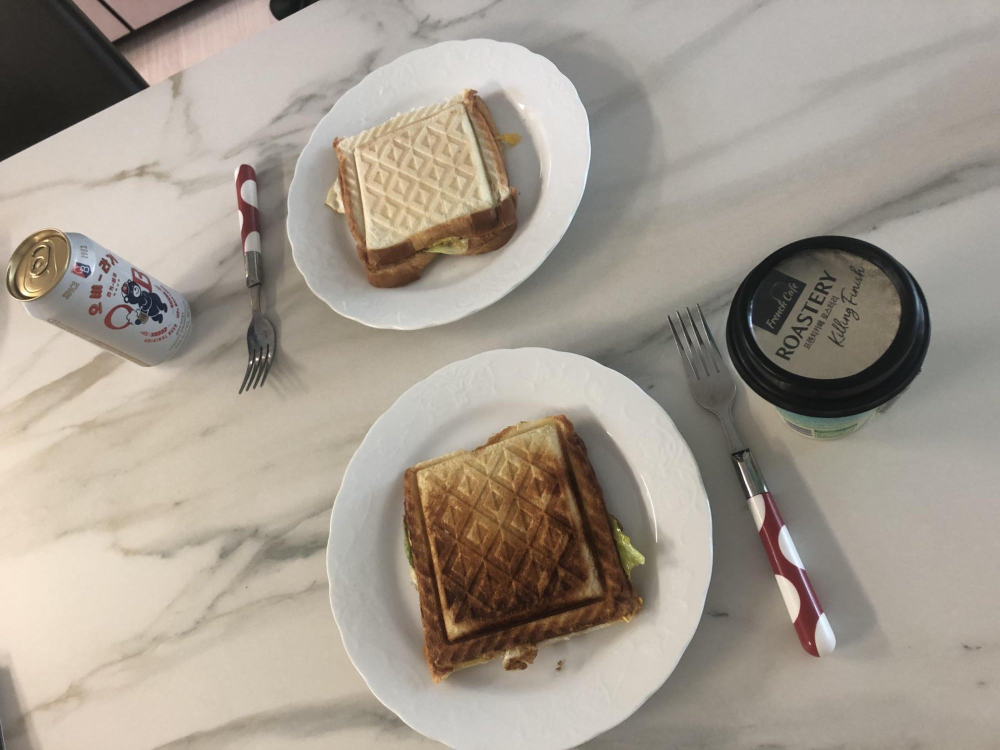 벌창을 만들면서 두번째 샌드위치를 만들어본다. 아까보다 케찹 라인 뿌리는 솜씨가 향상되었다. 이번에도 힘껏 눌러서 잠금장치를 잠궈준다. 그리고 타이머를 돌리면 고소한 냄새가 나면서 완성된다.