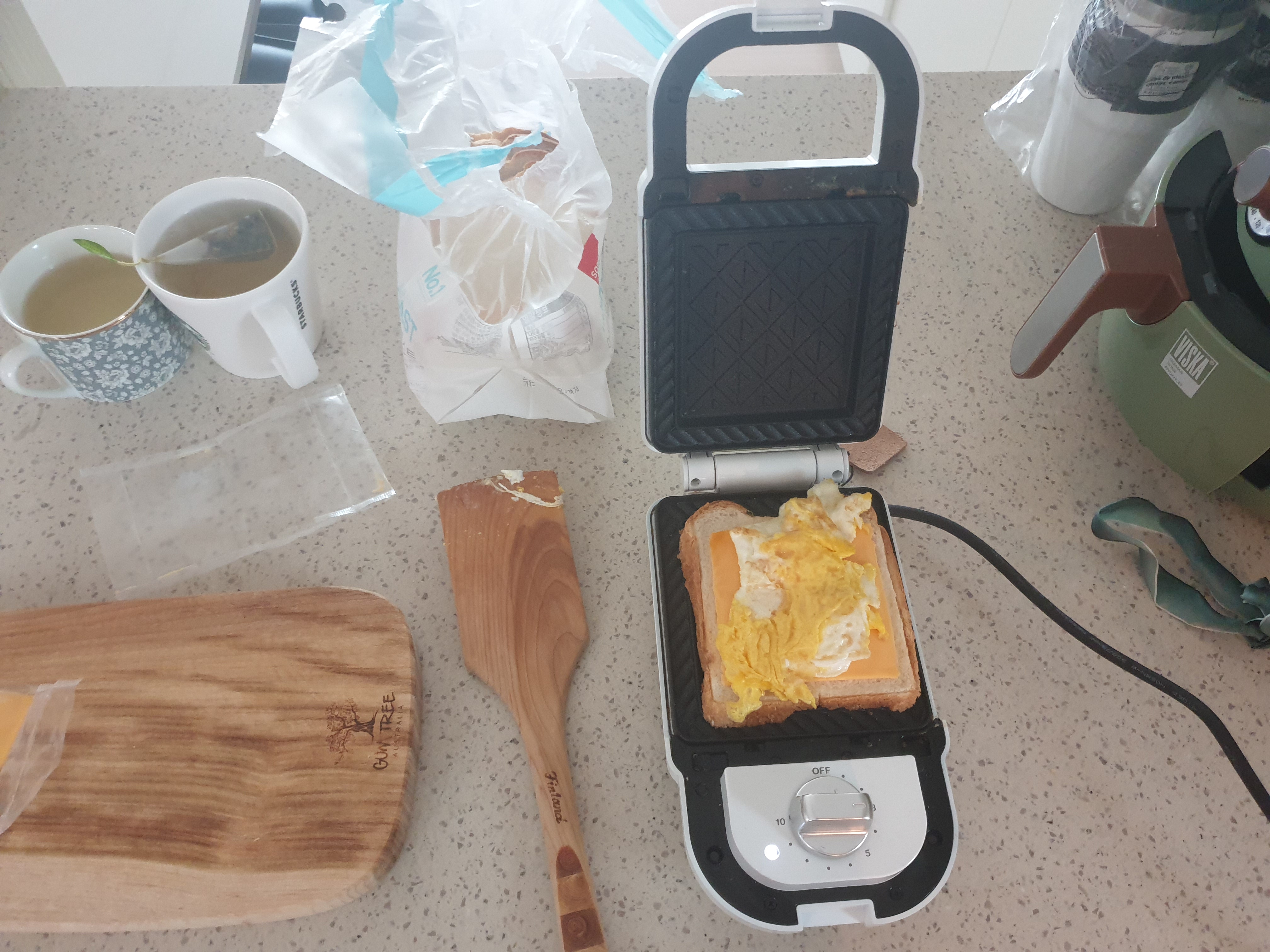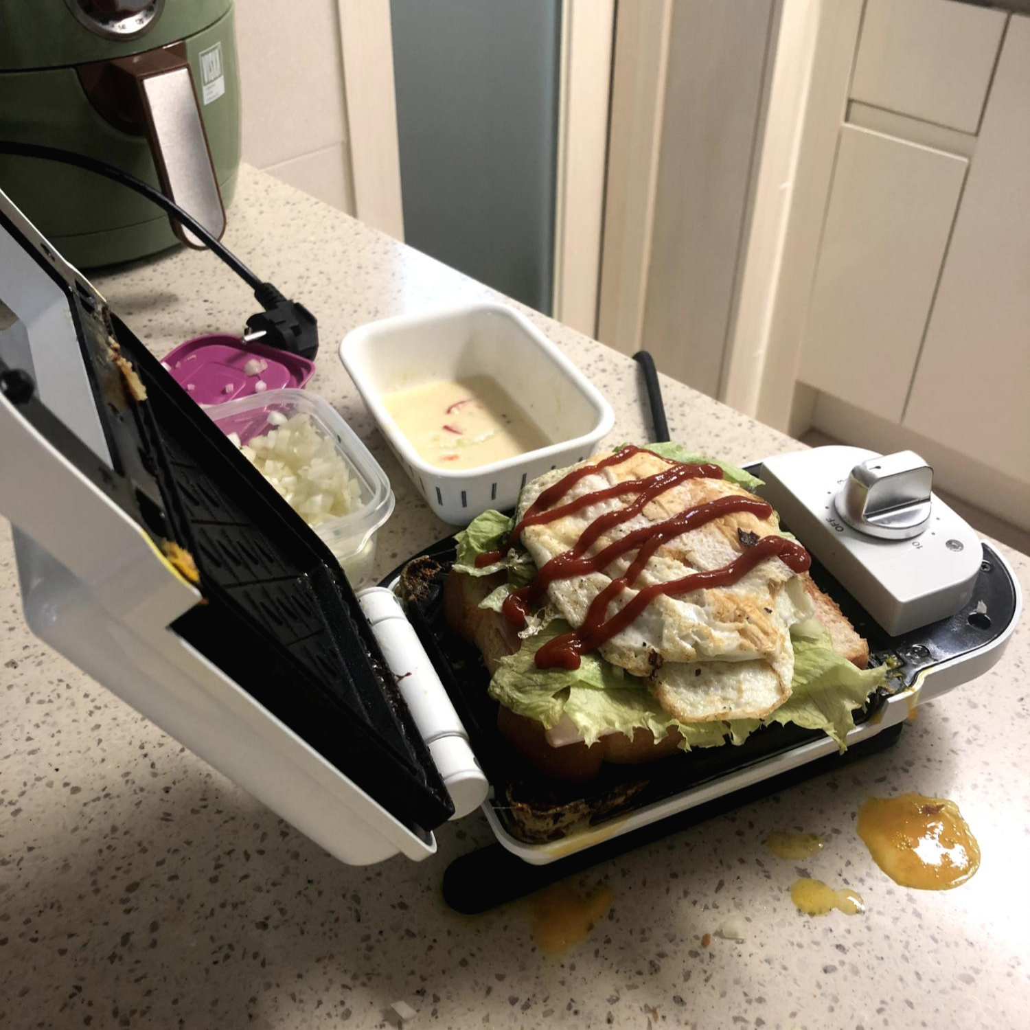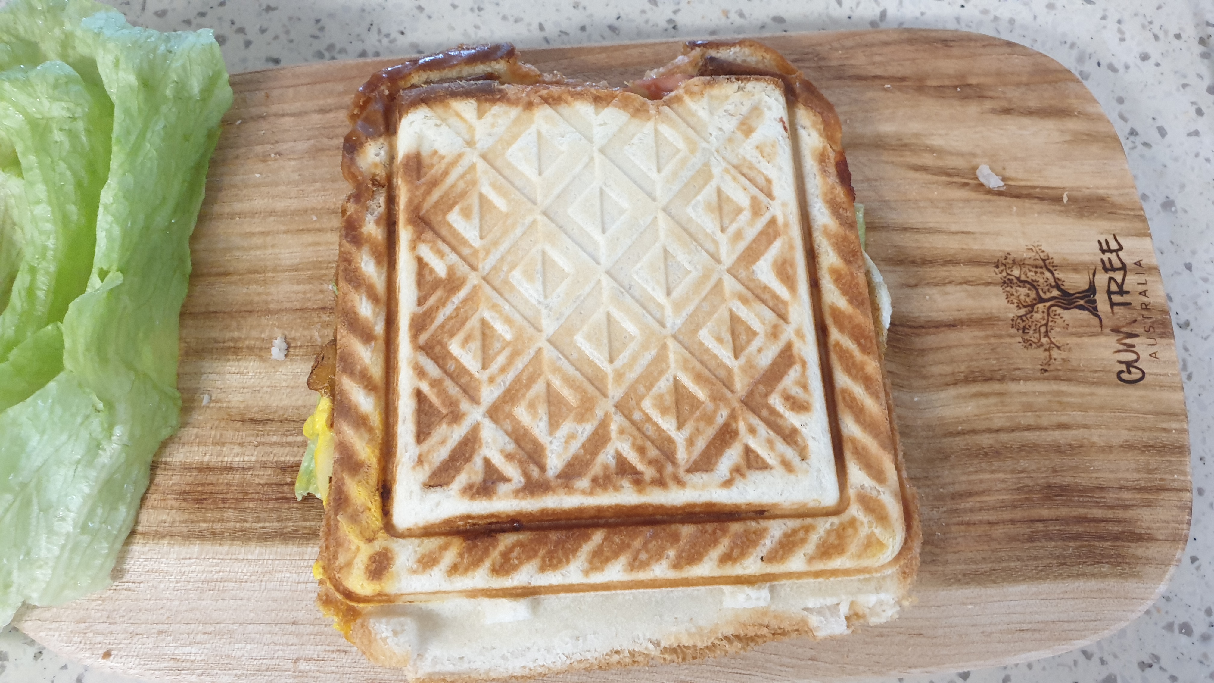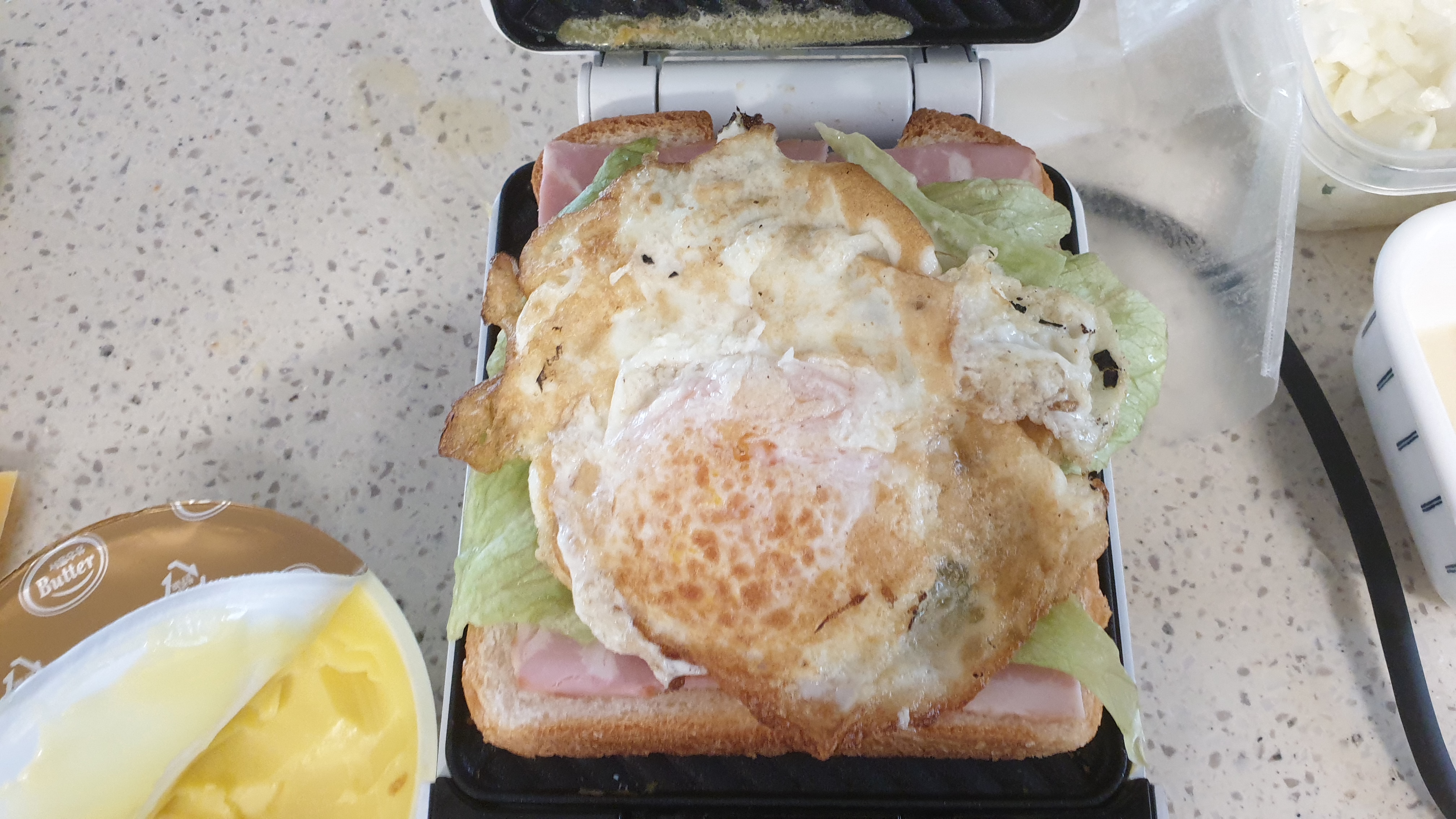 벌창을 만들면서 두번째 샌드위치를 만들어본다. 아까보다 케찹 라인 뿌리는 솜씨가 향상되었다. 이번에도 힘껏 눌러서 잠금장치를 잠궈준다. 그리고 타이머를 돌리면 고소한 냄새가 나면서 완성된다.