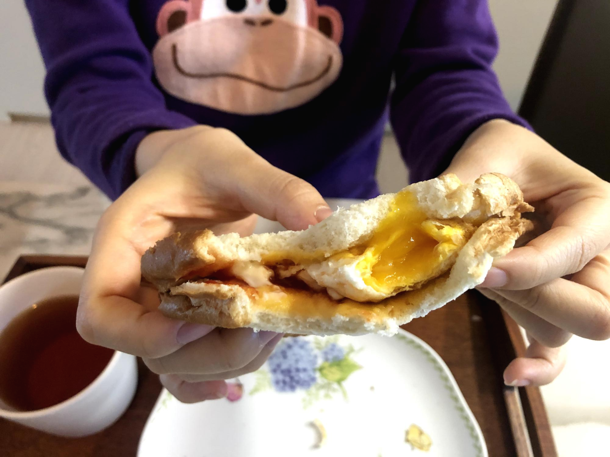 빵을 펼치고, 버터를 바르고, 베이컨을 올리고, 계란후라이 올리고.