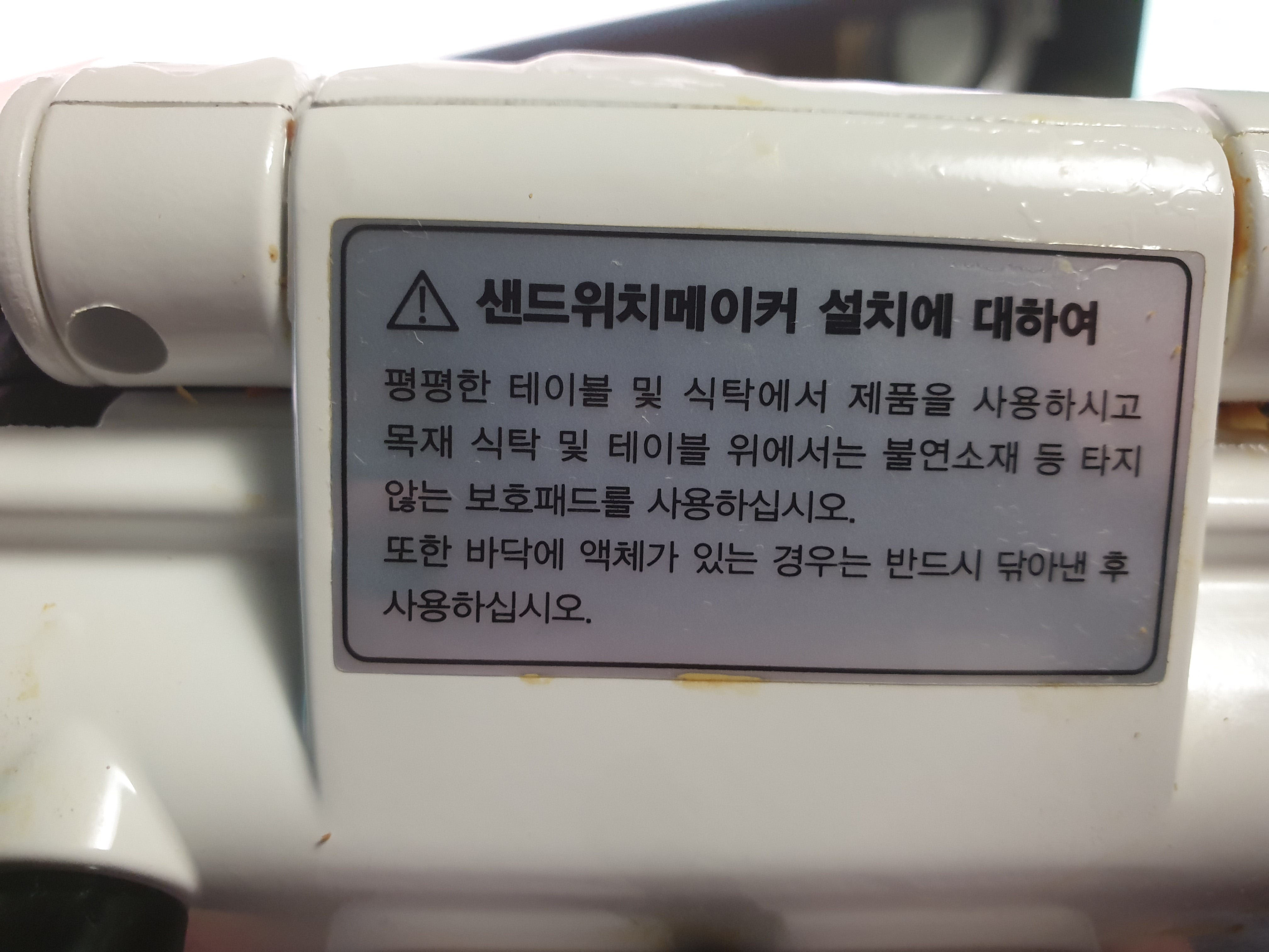 후면엔 경고문이 붙어있는데, 본 샌드위치메이커를 설치할때는 평평한 테이블이나 식탁에서 사용하고, 목재 식탁이나 테이블 위에서는 보호패드를 사용하라고 되어있다. 사진을 찍기위해 우드슬랩 위에 놓았는데, 하마터면 불타버릴 뻔 했다. 바닥에 액체가 흐르지 않는 곳에서 하라는 것도 당연한 말이다.