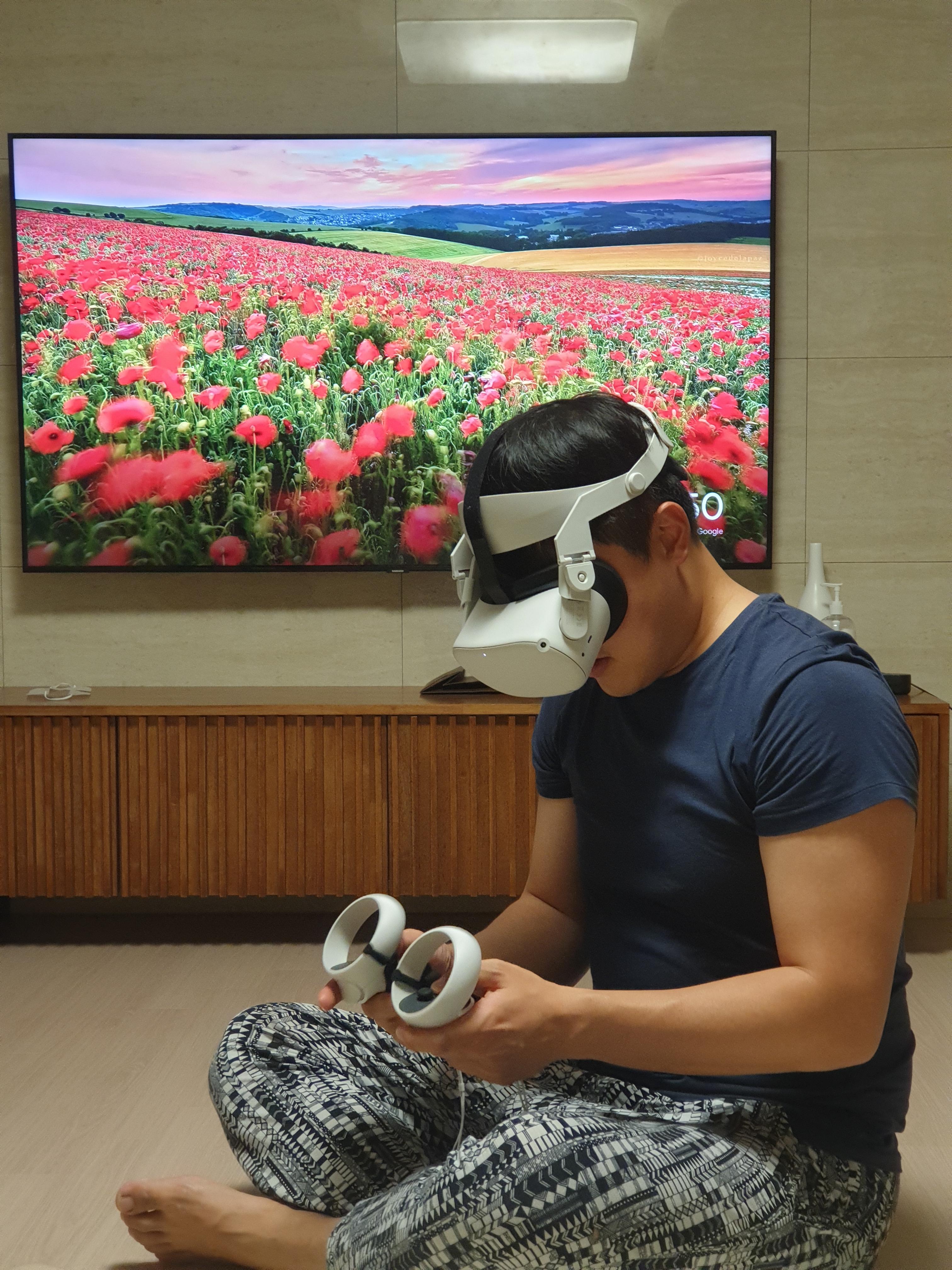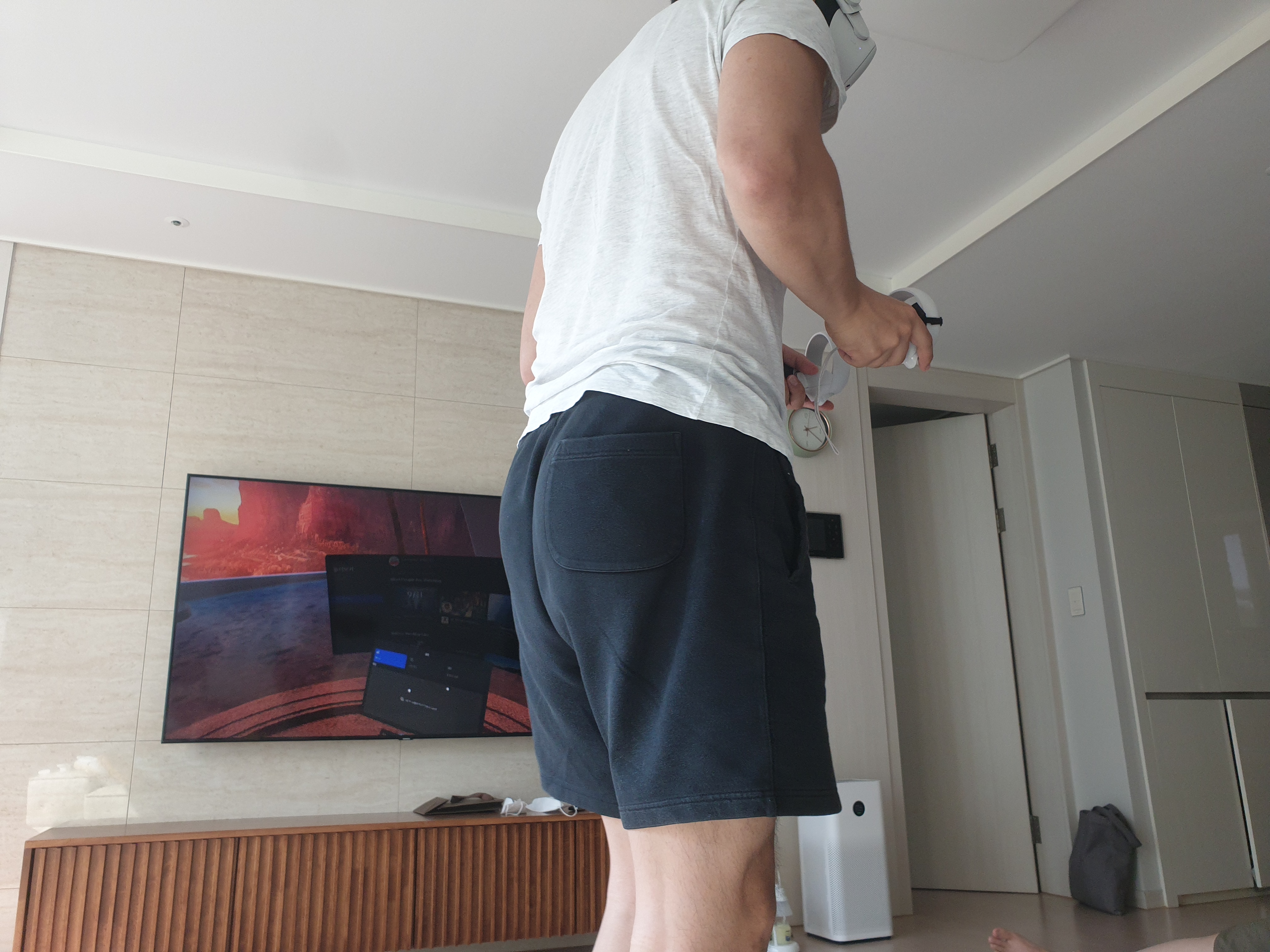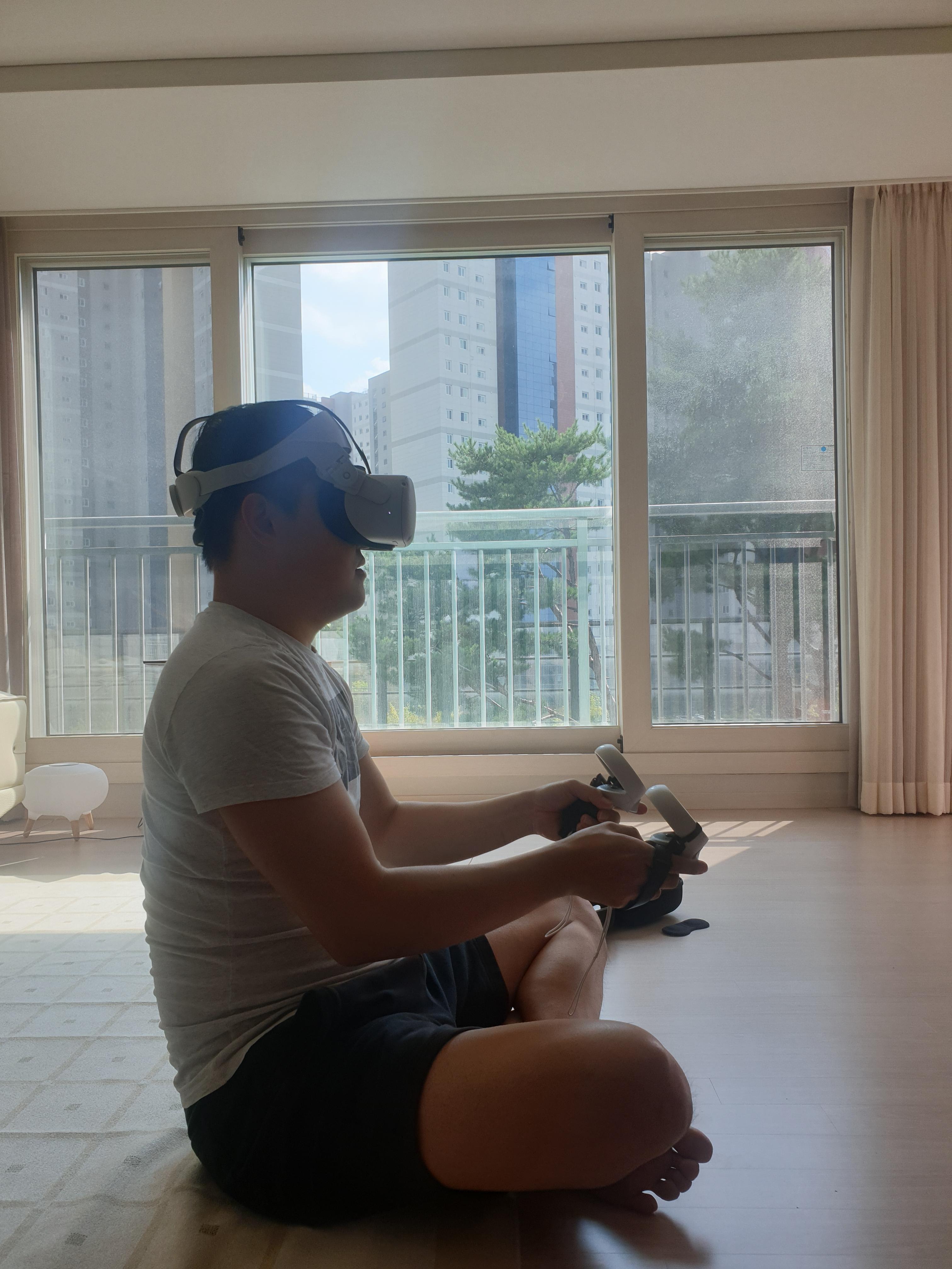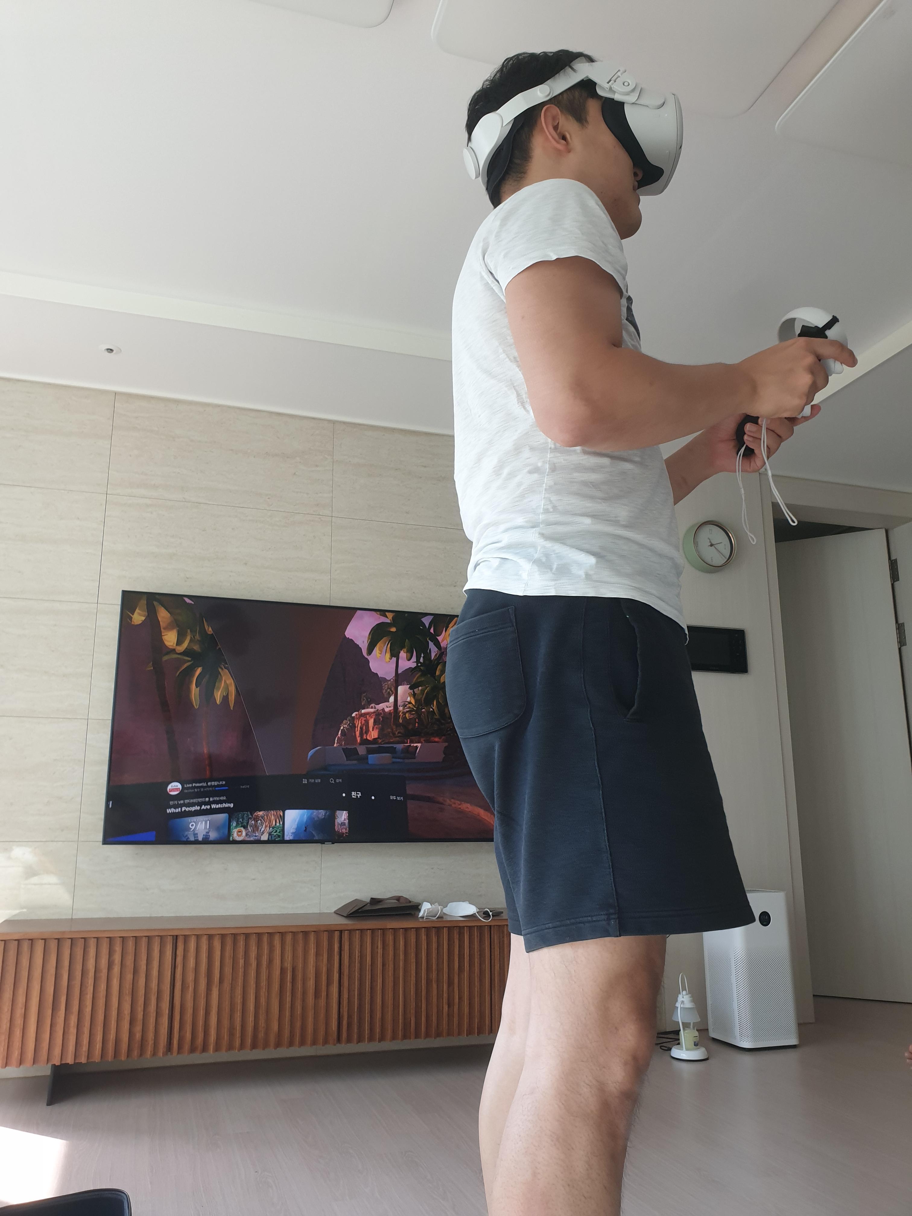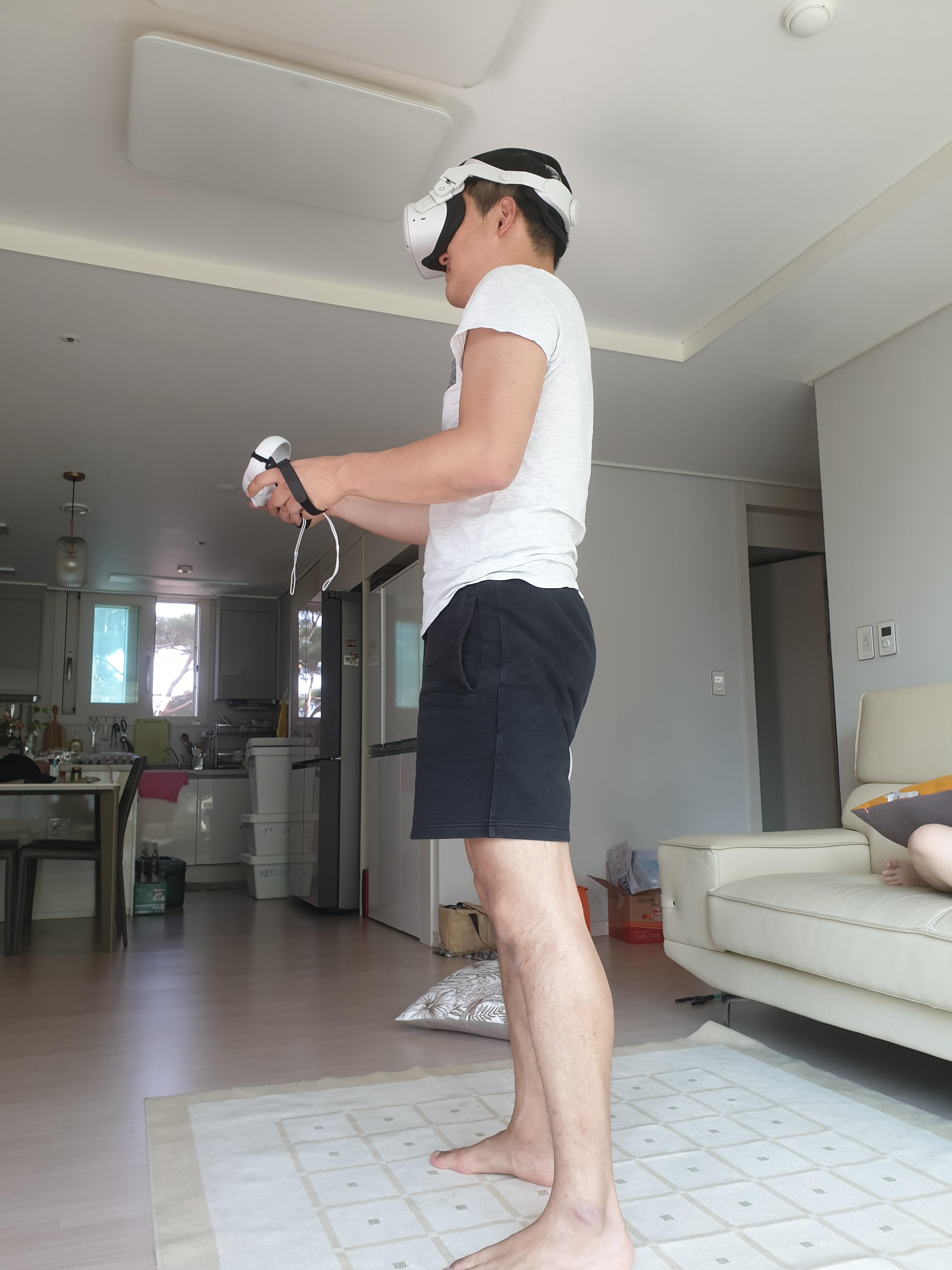 오큘러스 퀘스트2는 서서 할 수도 있지만, 앉아서 할 수도 있다.