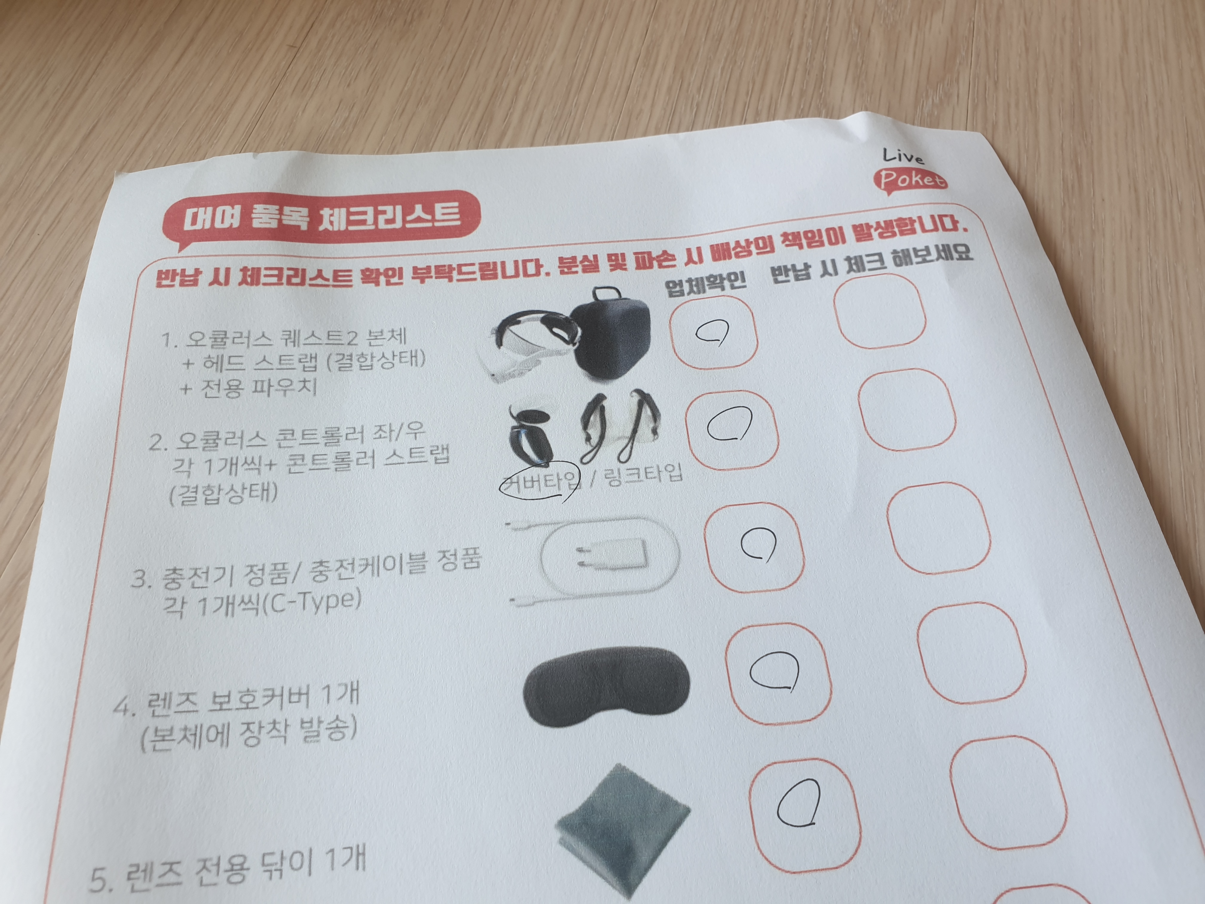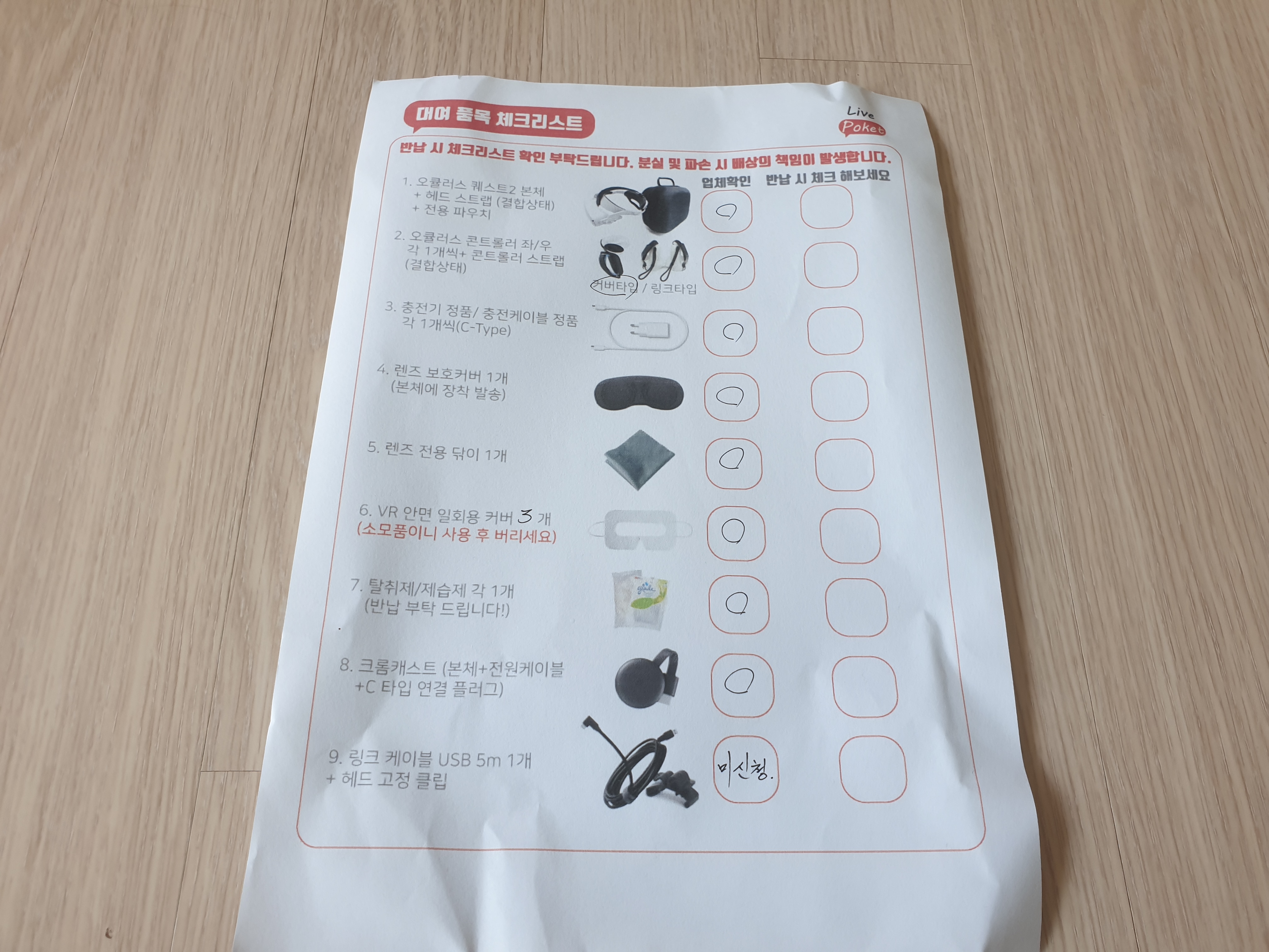 대여 품목 체크리스트였다. 내가 구입시 신청한 옵션에 동그라미가 쳐져있고, 신청하지 않은 제품엔 미신청이라고 쓰여있어서 불필요한 오해를 받지 않는데 도움을 준다.