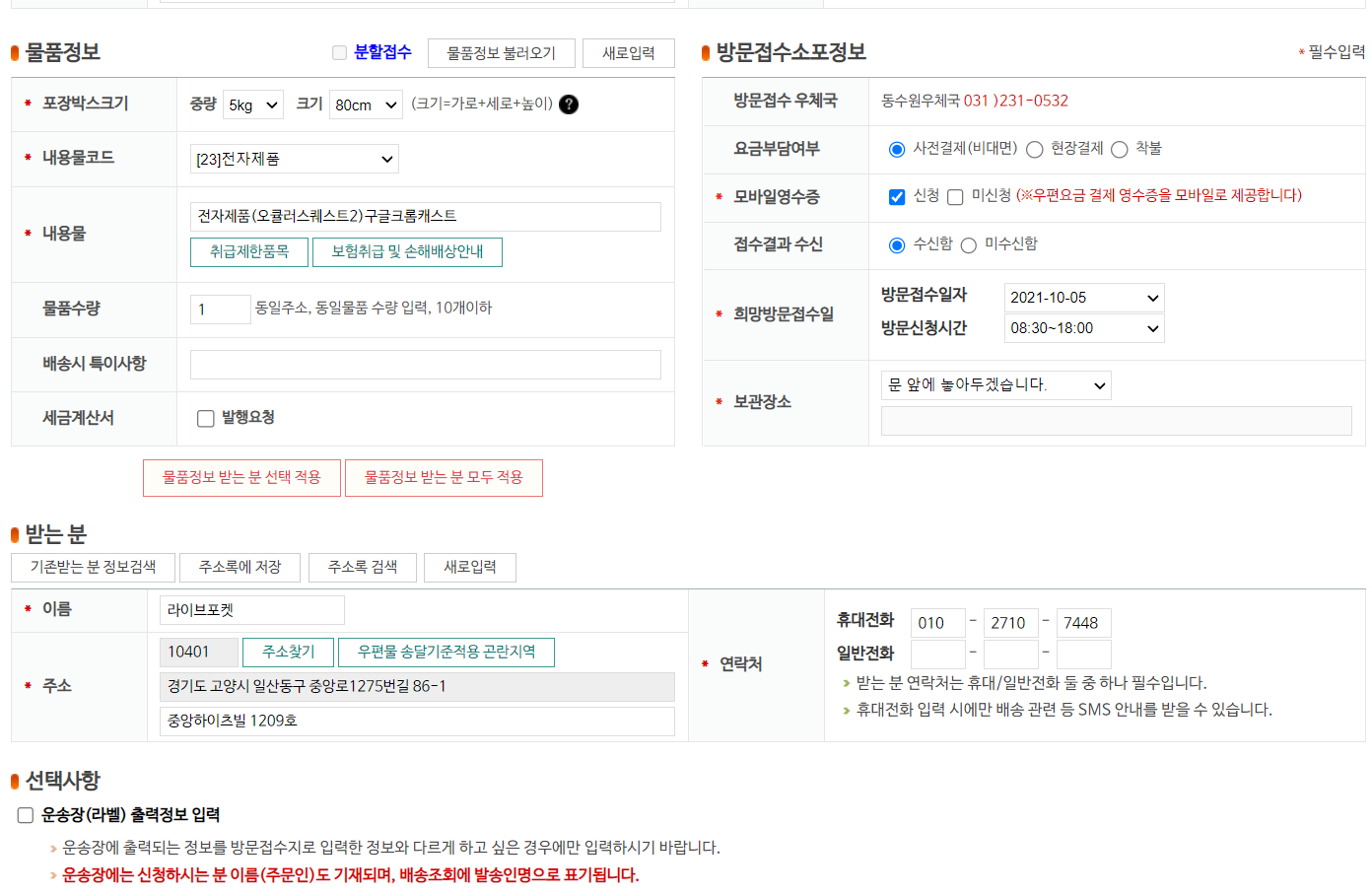 우체국 택배라서 호두를 시켜서 에게 부탁해서 "내일 우체국가서 VR좀 발송해줘~" 라고 했는데, 찾아보니 우체국도 방문택배접수 서비스를 하고있네?