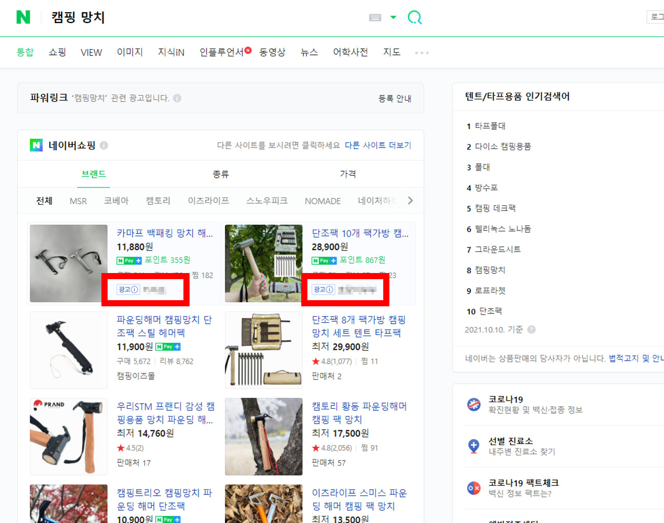 네이버에 캠핑 망치를 검색하고 네이버 랭킹순 결과를 신뢰한다.