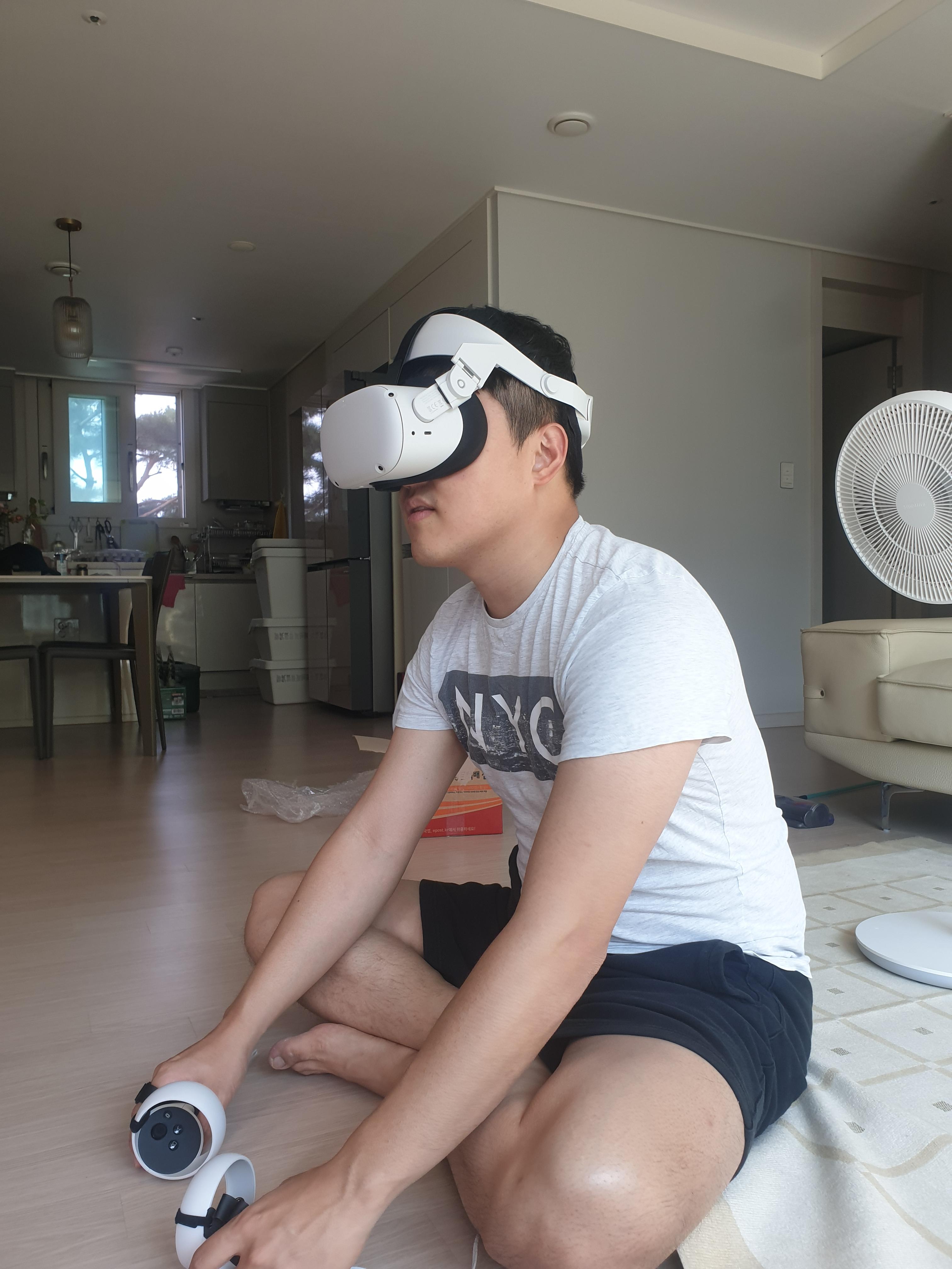오큘러스 퀘스트2는 서서 할 수도 있지만, 앉아서 할 수도 있다.