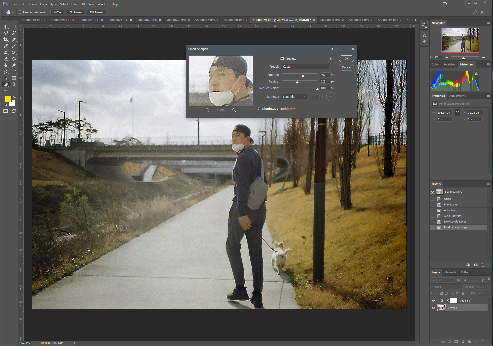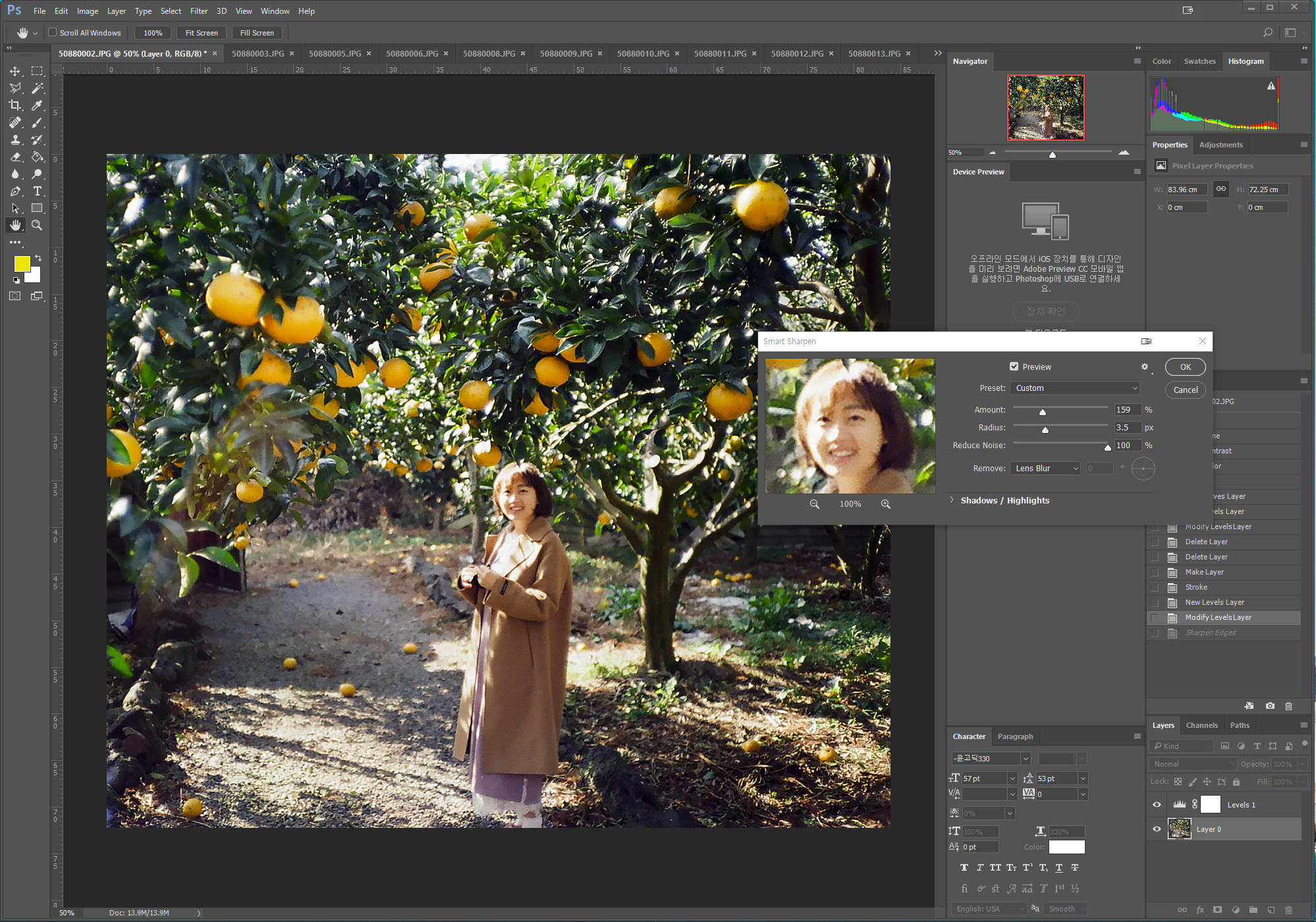 좌측을 크롭했다. 그리고 히스토그램을 켜서 현재 상태를 확인해보았다. 한쪽으로 쏠리지는 않았는지 확인한다. 그리고 레벨을 조심스럽게 조절해본다. 오! 맘에드는 상태로 변해간다. 마지막으로 핀(초점)이 살짝 나간 모델을 위해 샤픈 Sharpen 기능을 써서 살짝 잡아줘보았다.