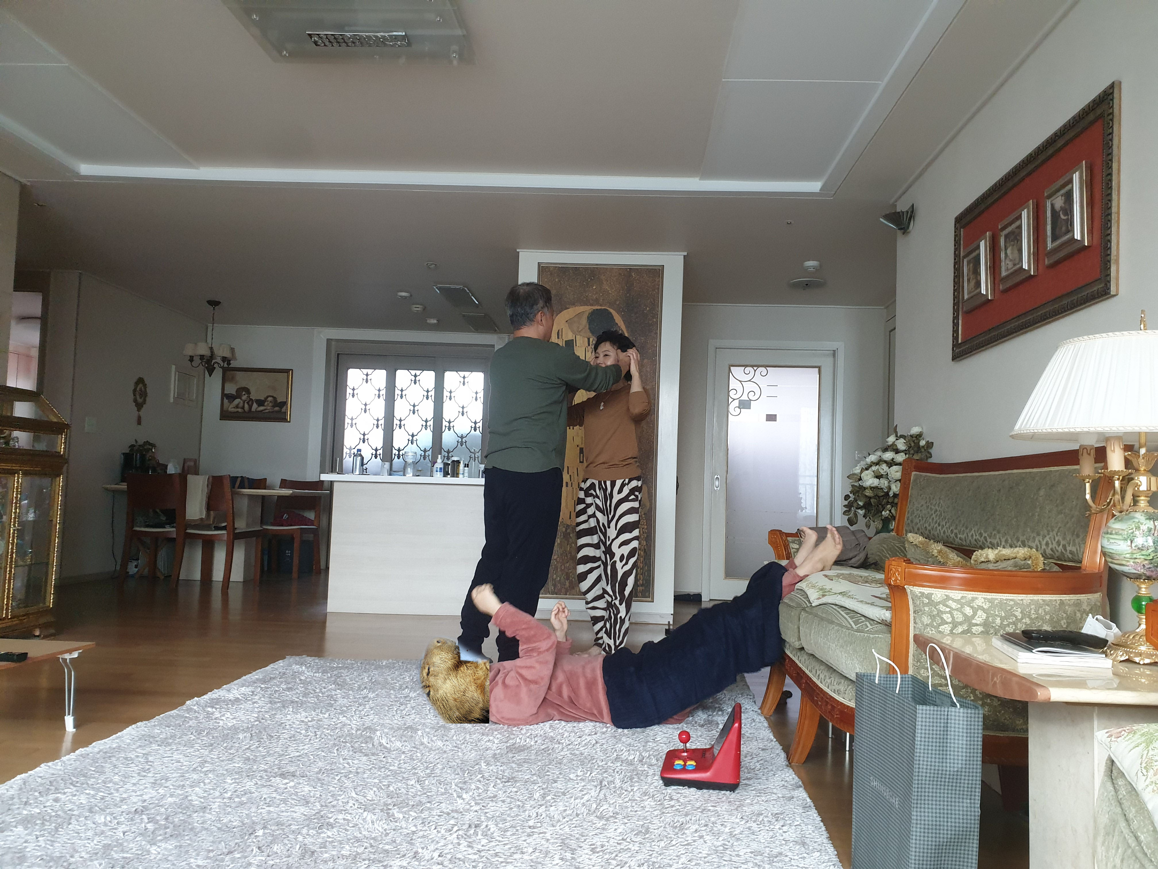 아버님이 어머님한테 씌워주고, 어머님은 아기처럼 좋아하고, 호두도 누워서 흥겨워하고.