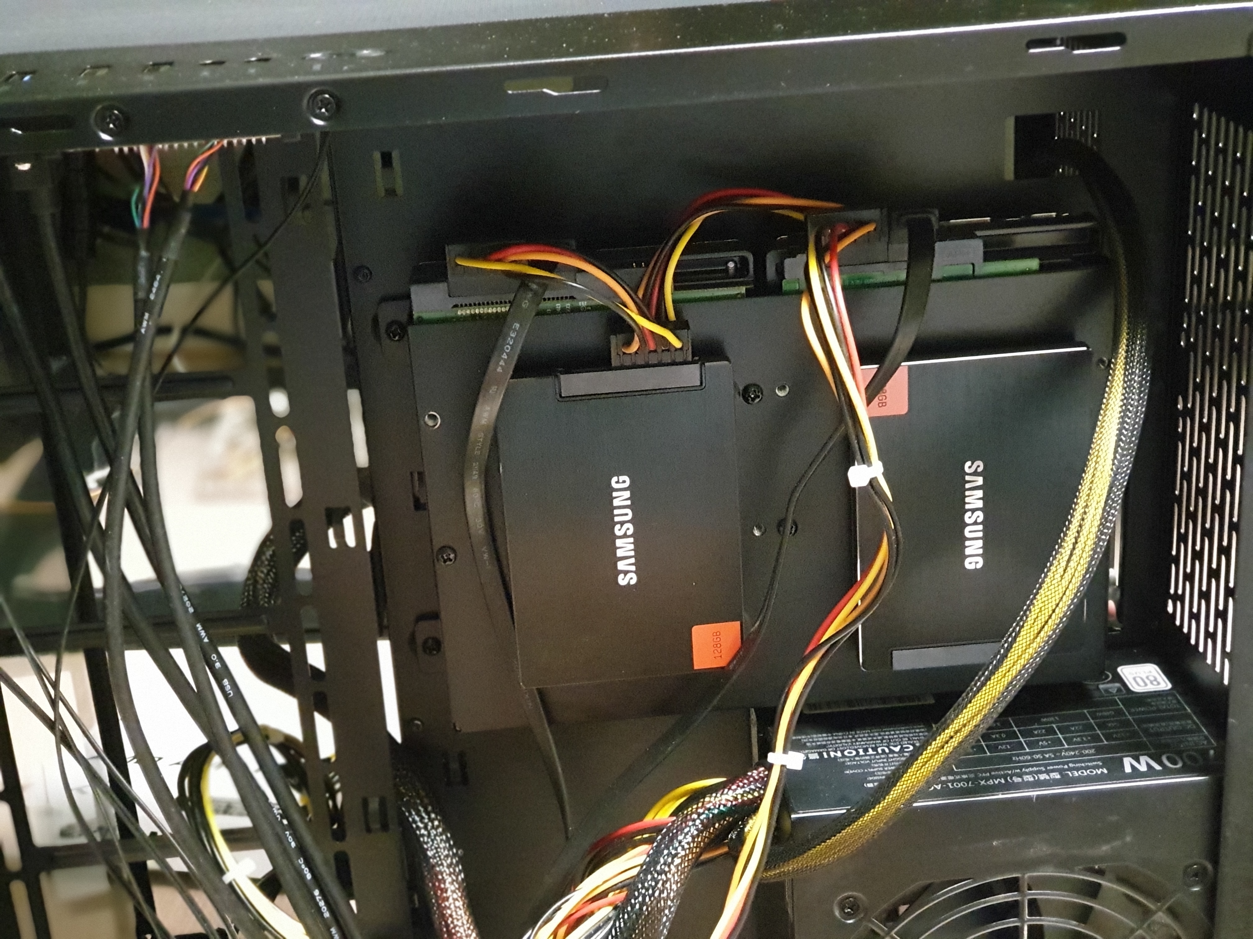 SATA방식의 SSD는 이렇게 하드디스크를 장착한 철제 크래들의 바깥쪽에 설치하게된다. 그래서 가려지는 뒤쪽에 위치하게되어서 깔끔한 느낌을 줄 수 있다.