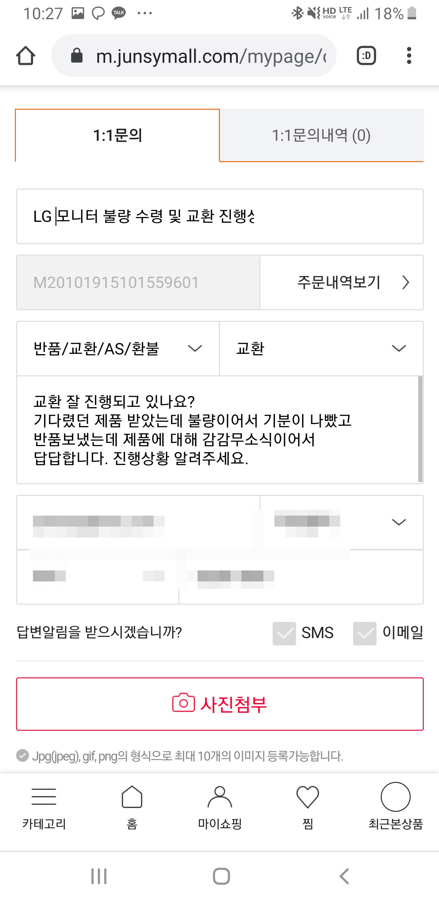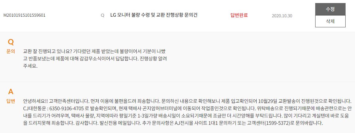입고를 시키고, 배송기사님이 제품을 다시 수거해가시고, 그다음에 AJ전시몰 사이트의 My Page상 좀처럼 update가 없었다. 자연스럽게 내 마음은 불편해질 수 밖에 없었다. AJ전시몰, 왜 응답이 없지?