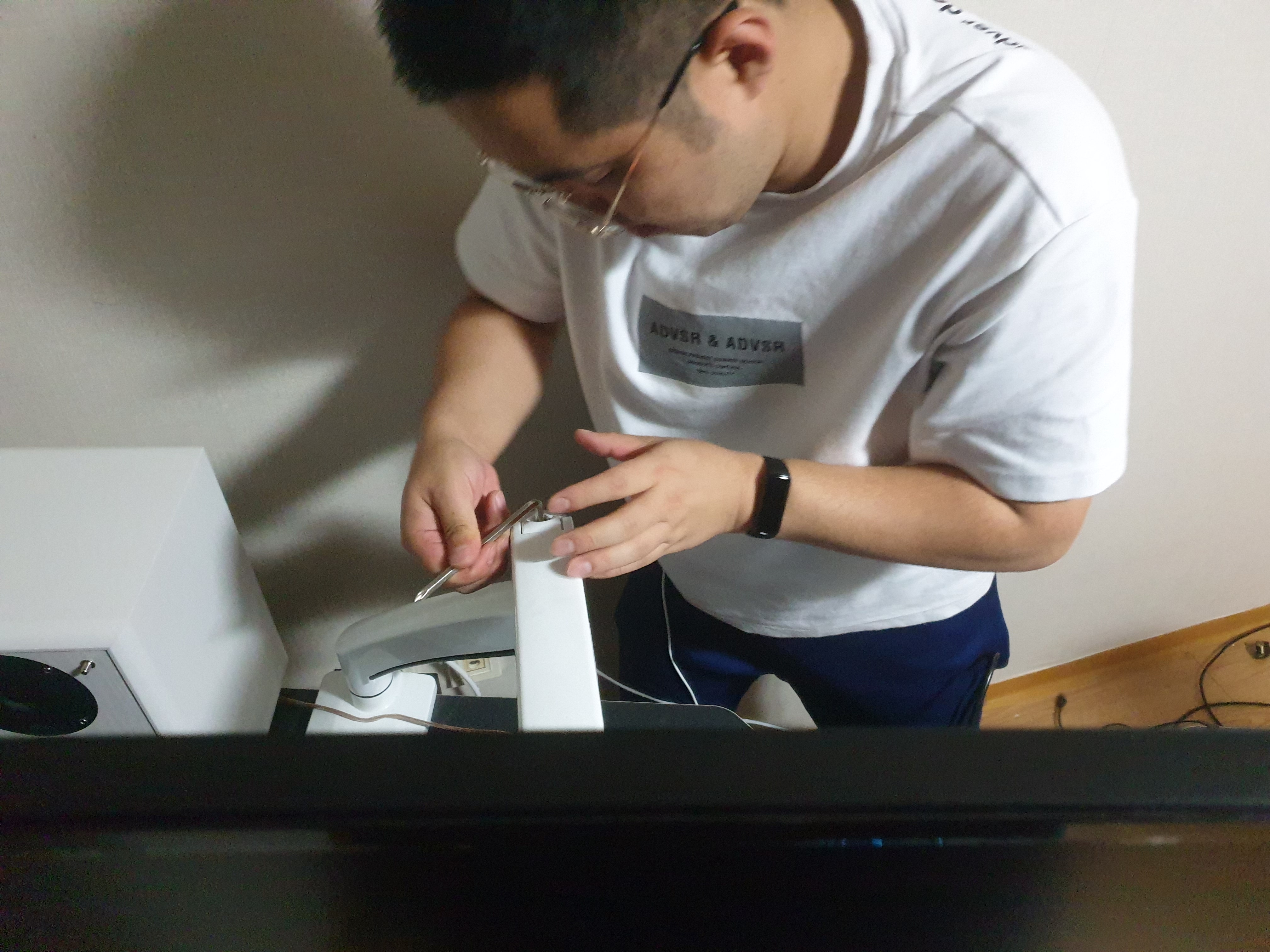 11킬로가 넘는 엄청나게 무거운 모니터를 지지하려면 모니터 암을 최대한 조여줘야 한다.