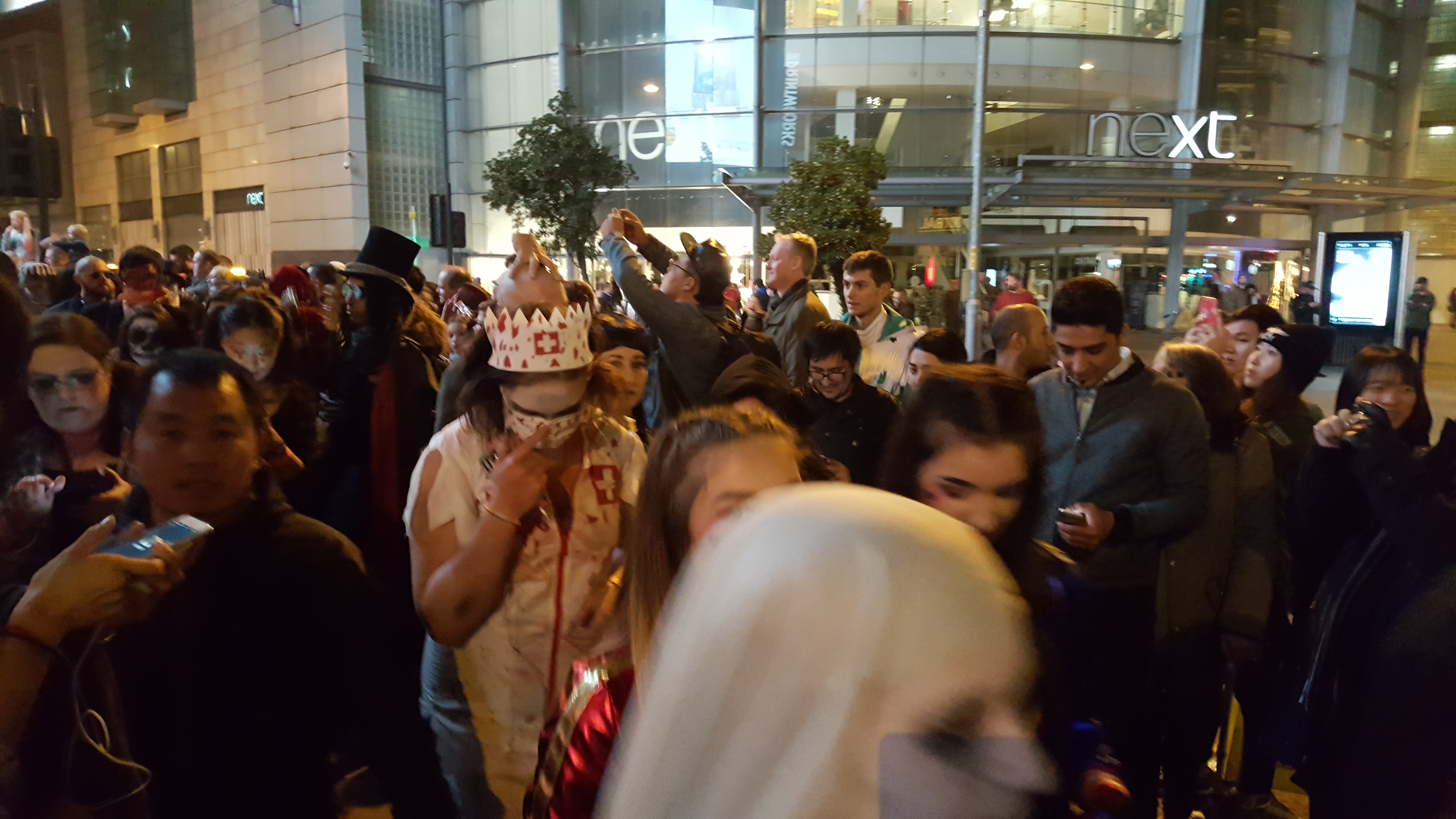 분장한 많은 사람들이 오픈형 아케이드에서 쏟아져나왔다.