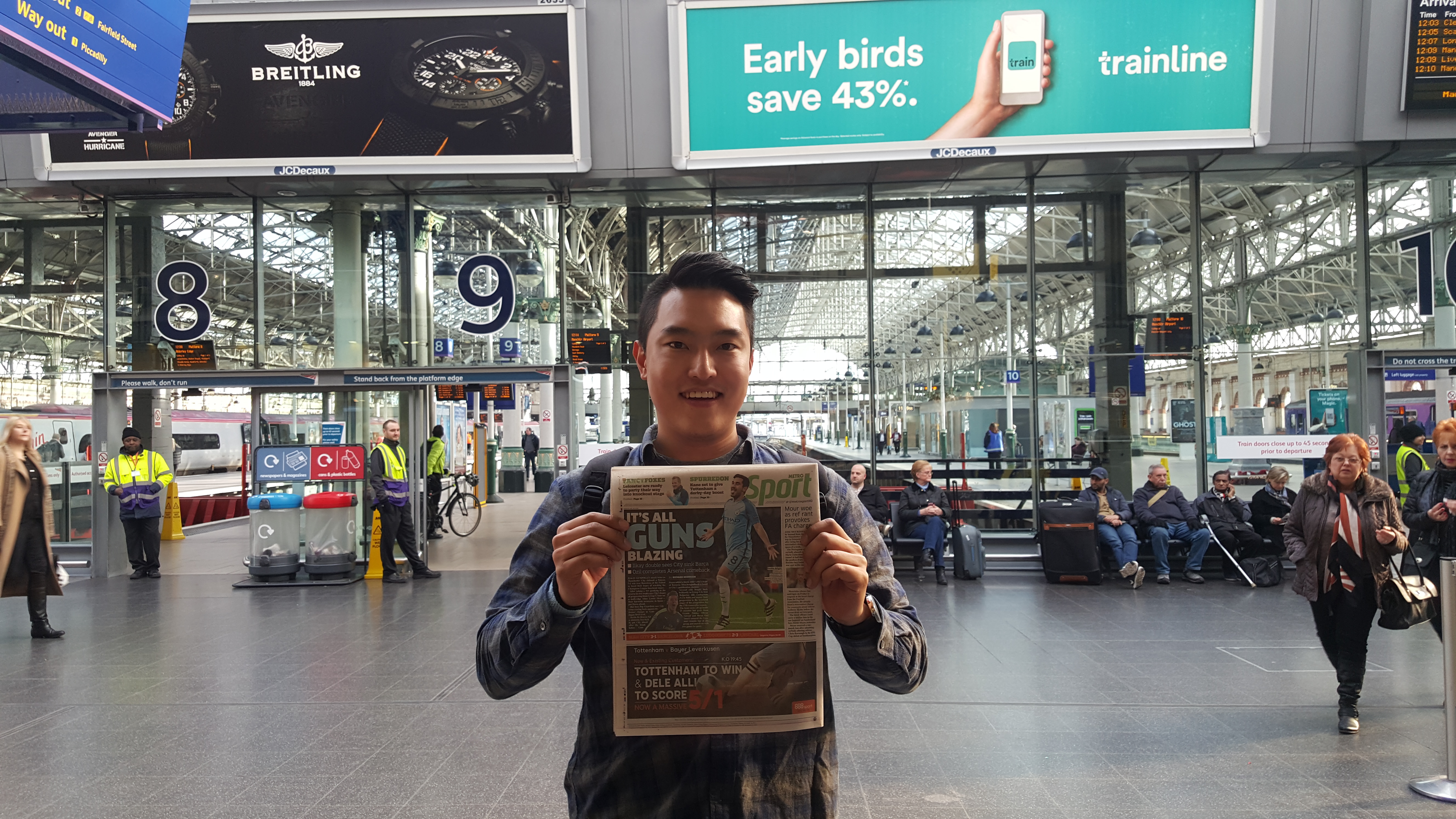 다음날 맨체스터를 떠나는 기차역에서 신문을 들고 사진을 찍어달라고 했다.