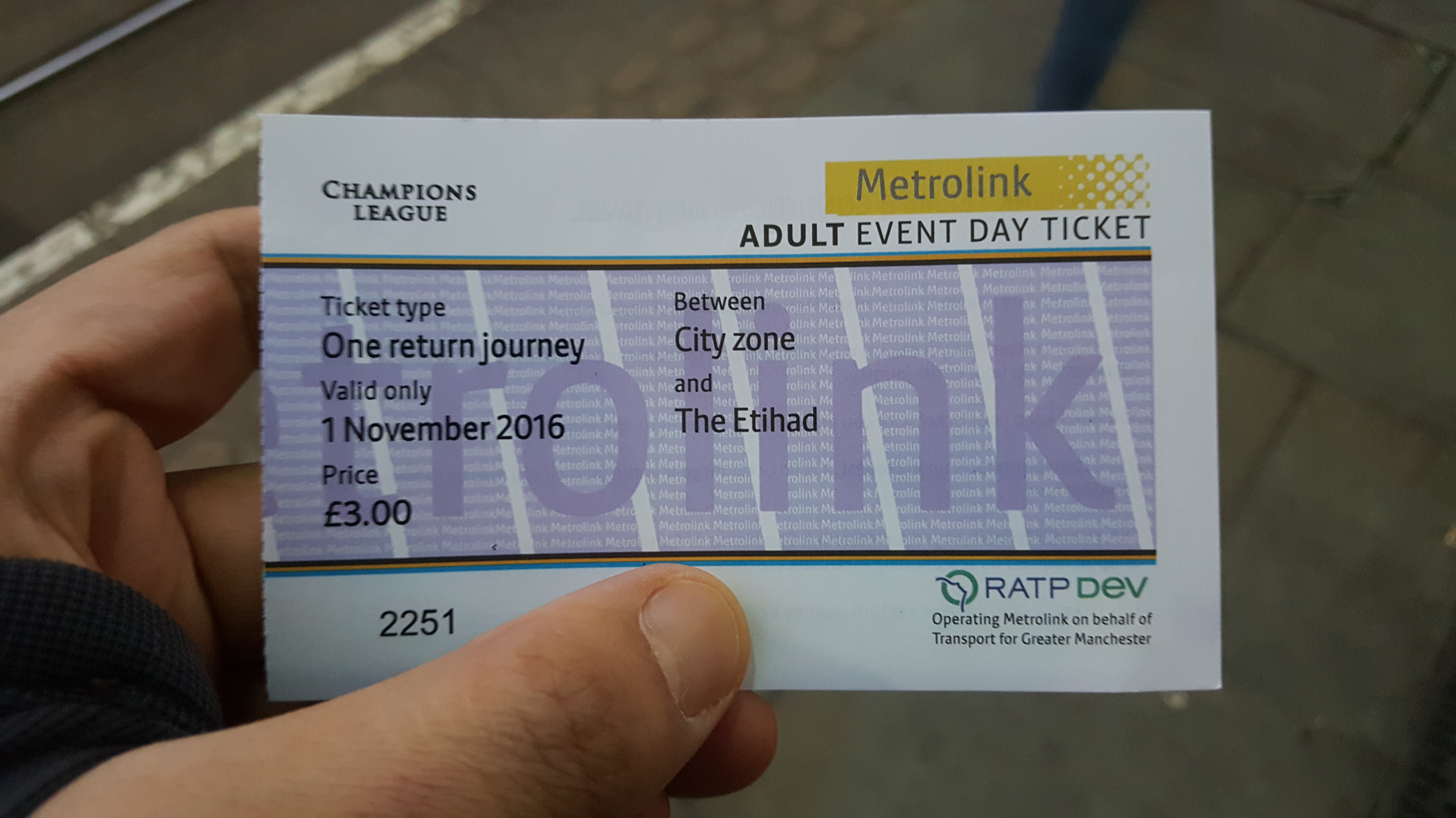 트램을 타고 이동해보자. 챔피언스 리그가 열리는 날의 티켓. 이용요금은 3파운드 되겠다.