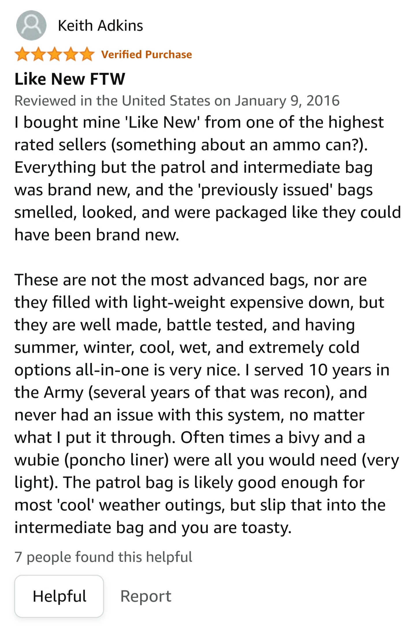 제품의 스펙을 중시하는 캠퍼, 가격대 성능비를 챙기는 분들 그리고 군용의 감성을 아는 사람들에게는 이 제품은 훌륭한 선택이 될 것이다. 단, Used나 Used Like New등급의 중고의 경우가 해당될 것 같다. 새 제품은 굉장히 비싸니까.