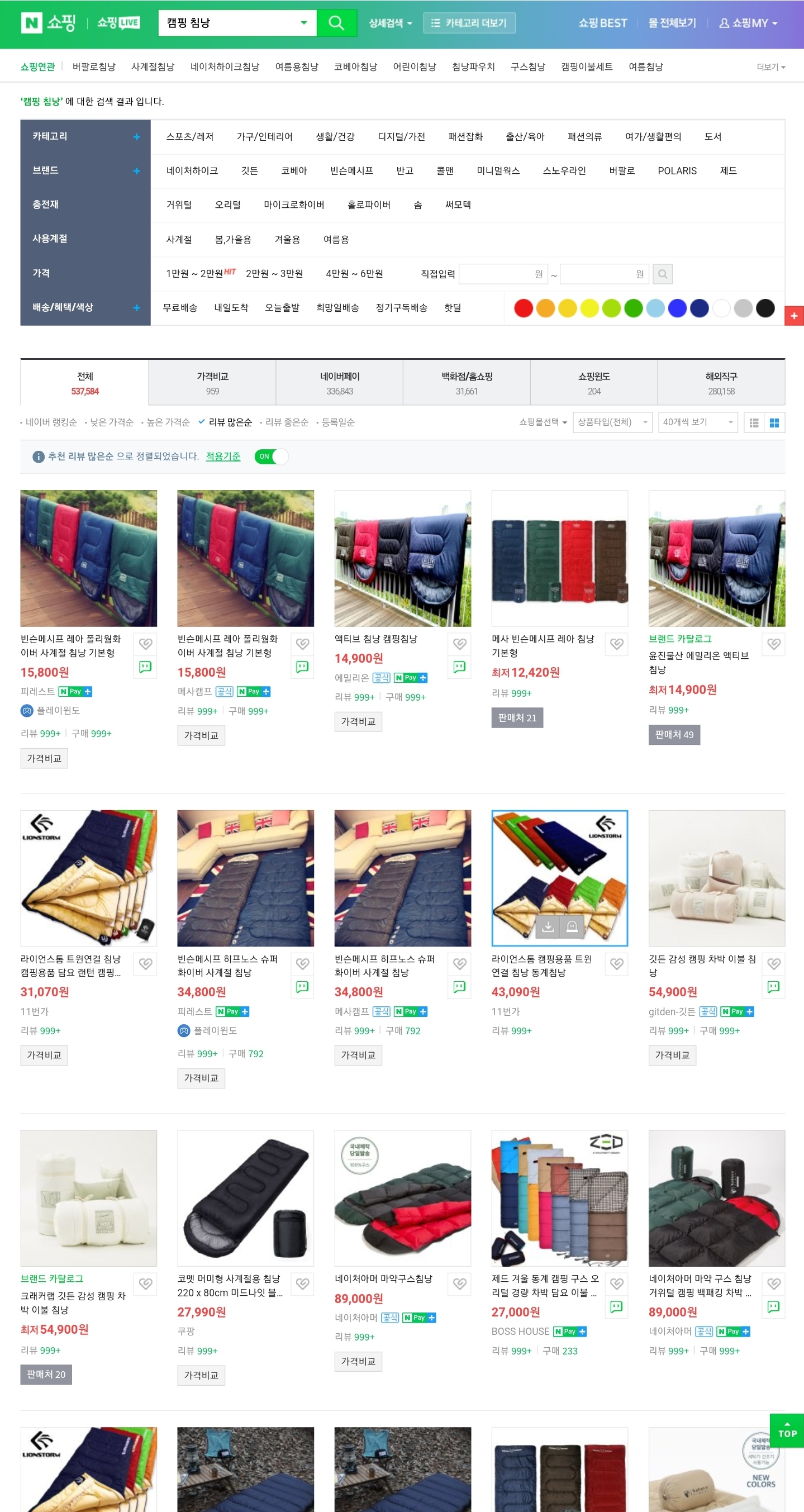 이런 분류로 종류별로 판매중이다. 판매중인 제품수와 가격대를 살펴보니 대세는 확실히 오리털/거위털이라는 걸 확인 가능했다.