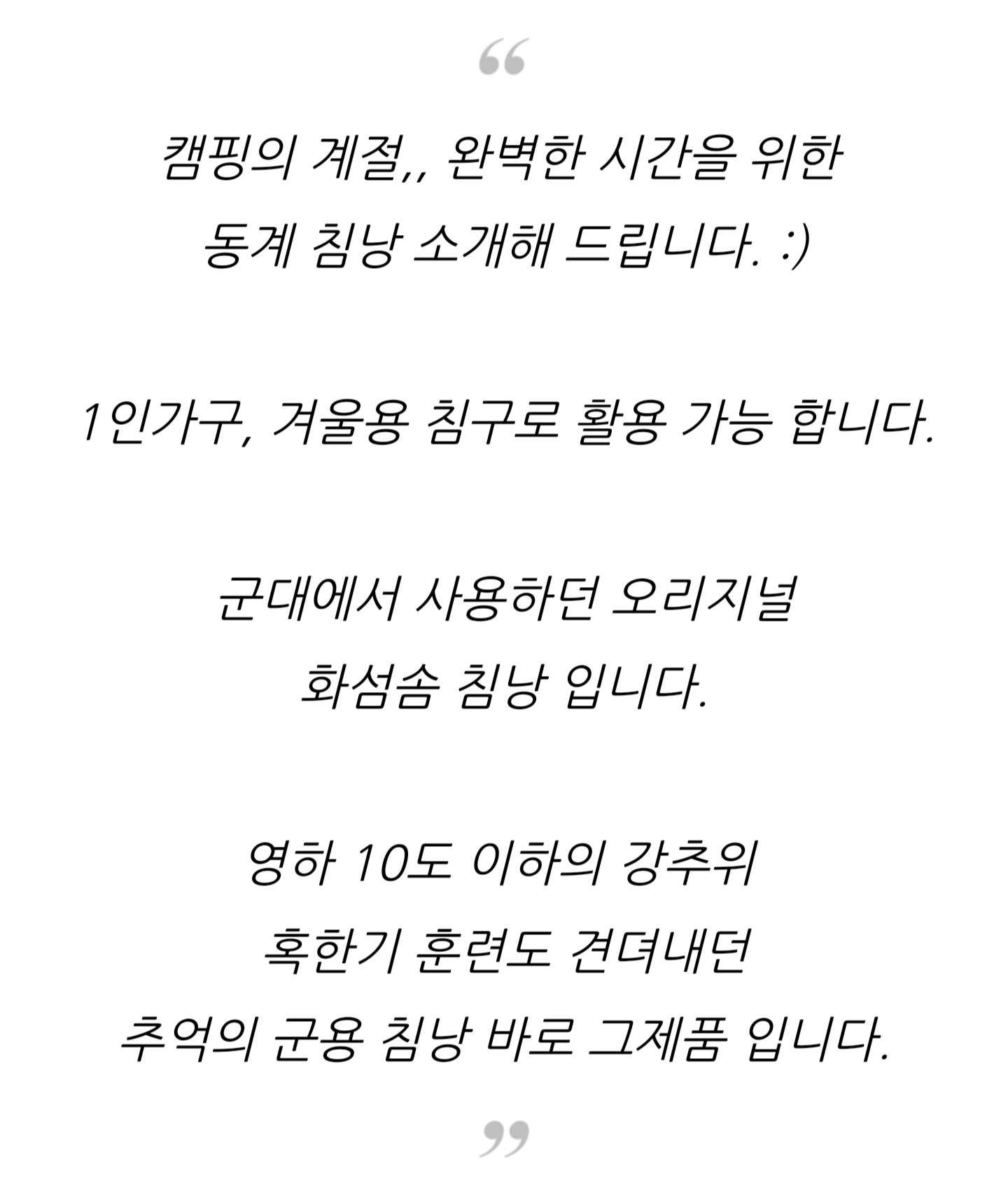 육군에서 군생활을 할때 보급받았던건 솜의 풀이 반쯤 죽은 군용 화섬 침낭이었다. 당시 스물두살로 어려서몸이 추위를 몰랐기 때문이었던걸까? 아니면 침낭이 너무 따뜻해서였을까?