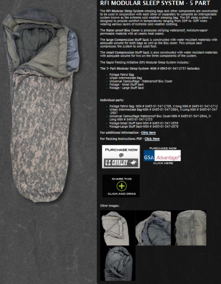 The RFI Modular Sleep System sleeping bags and other components are constructed to be used in conjunction with each other or separately to complete an interoperable system known as the extreme cold weather sleeping bag.The RFI sleep system is designed to provide comfort in temperatures ranging from 50°F to -50°F when wearing various layers of extreme cold weather clothing