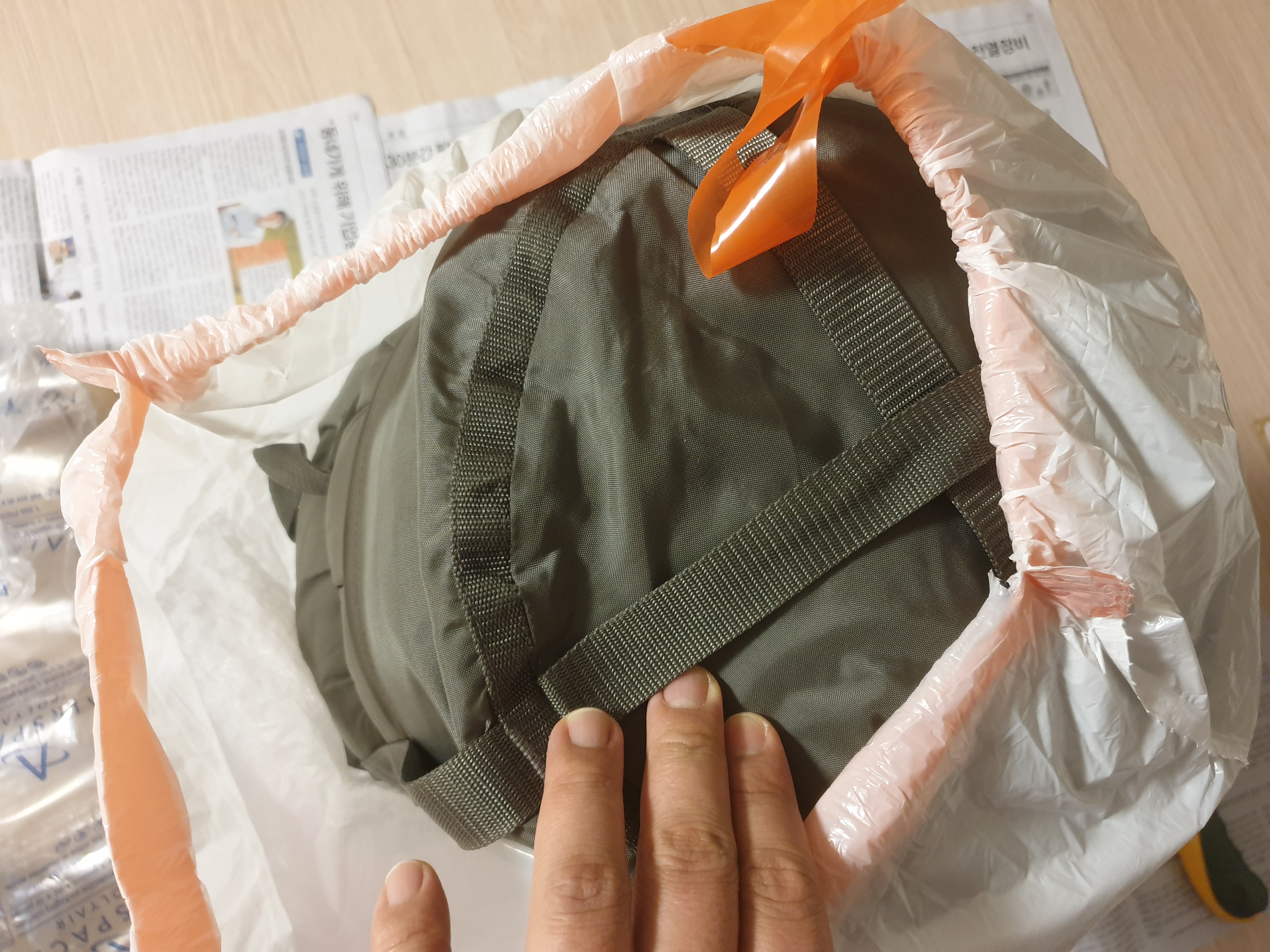 백을 열어보니 담겨있는 침낭. Sleeping bag의 Carring Pouch에 아예 담겨서 배송되어온 제품.