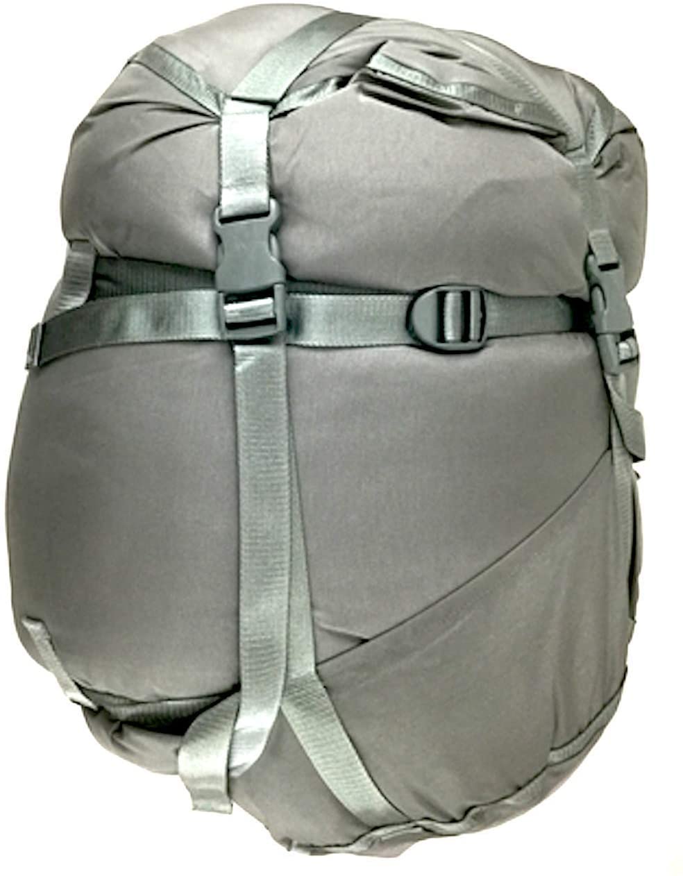 Measures 85 by 28 by 35 Inch. Compress Stuff Sack Constructed of water resistant materials. Compressible to one cubic foot.