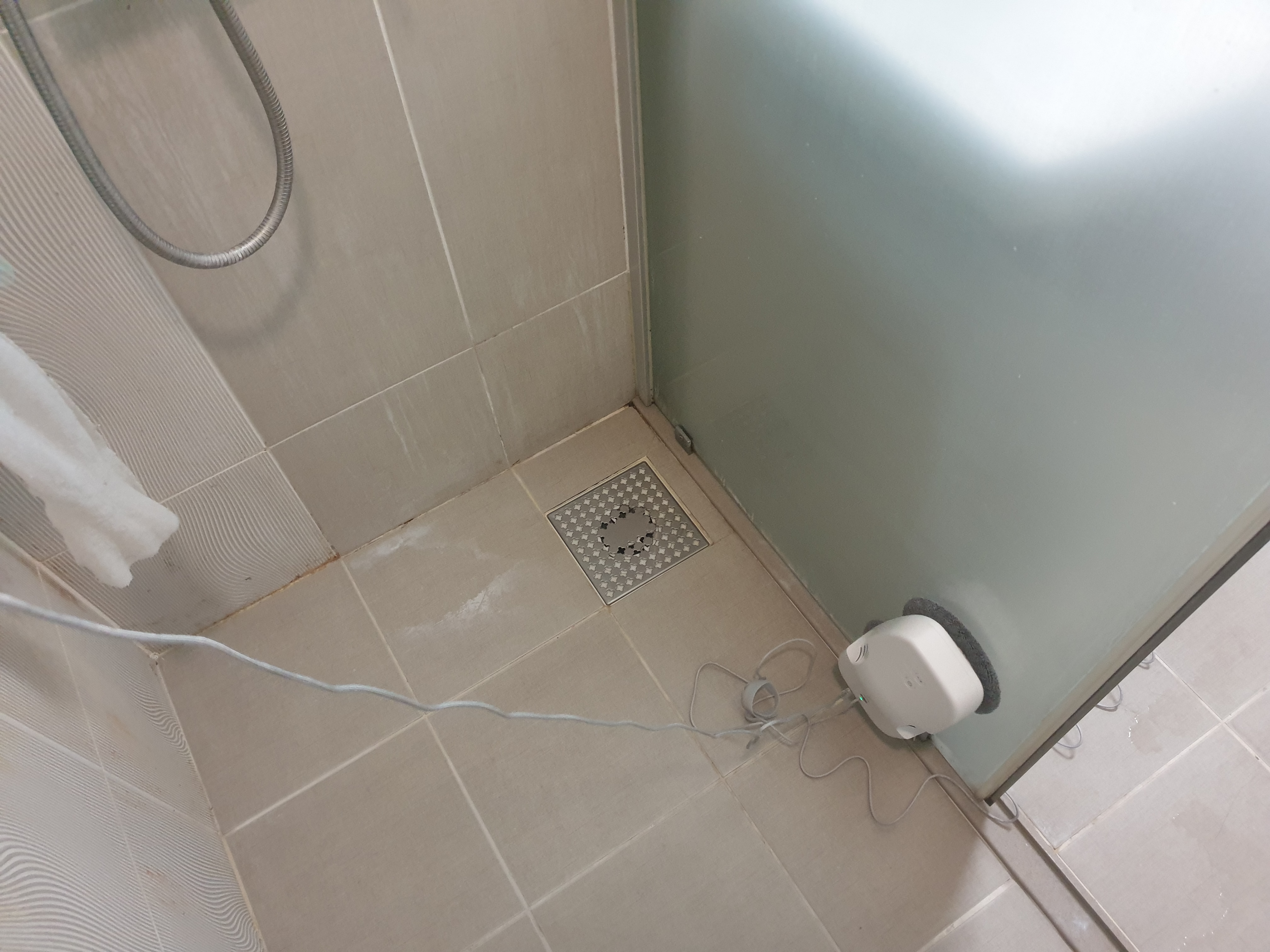 화장실 샤워부스. 유리벽에 잘 붙어있는 것이 확인된다.