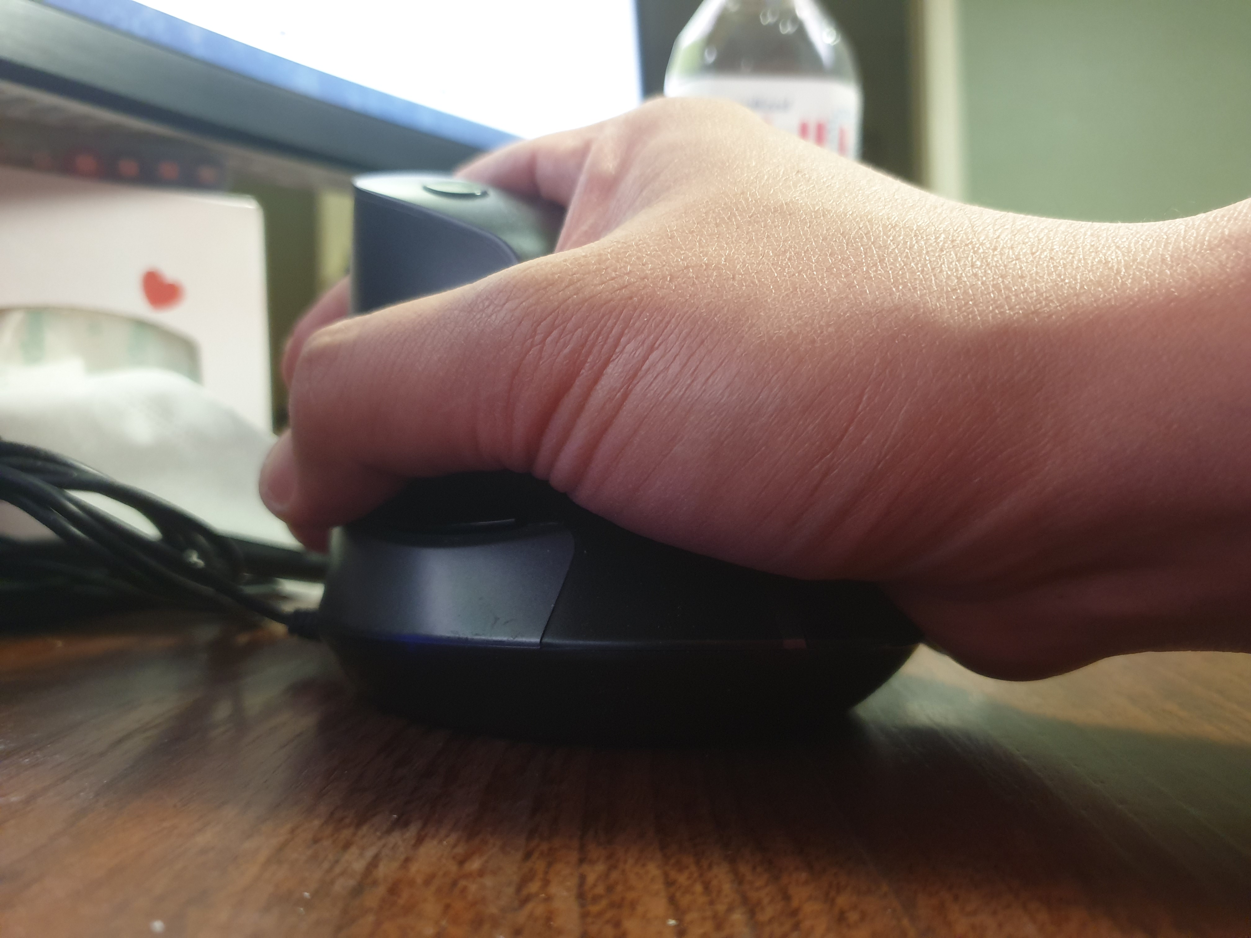 하지만 위 사진에서처럼 본 에디터가 파지시, 손목부터 팔꿈치에 이르는 부분까지가 바닥에 닿지않고 뜨는 현상을 볼 수 있었다. 장시간 안정적인 마우스 사용을 하기에는 다소 무리가 따르는 것, 그것이 다른 마우스를 찾아나서게 된 계기가 되었다.