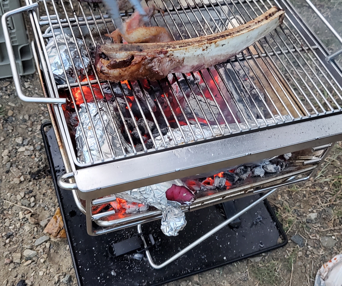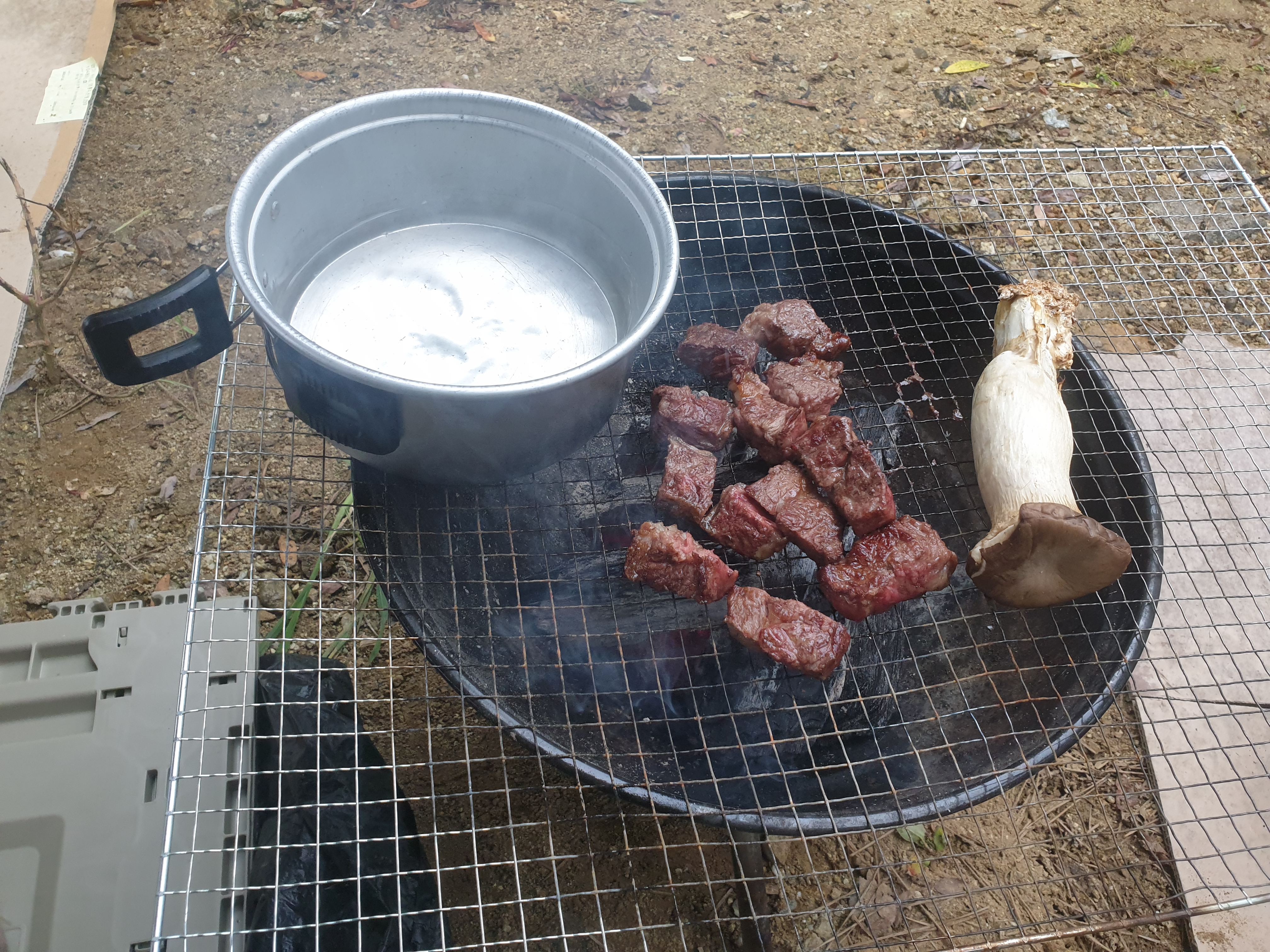 숯이 아직 완전히 붙지 않았지만 가만히 있을 수 없었다. 고기를 구웠다.