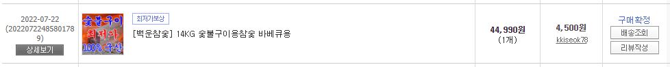 14kg 숯불구이용 참숯을 주문했다. 가격은 45000원으로 상당한 편이며, 배송비 역시 무게때문인지 4500원으로 다소 비싸다.