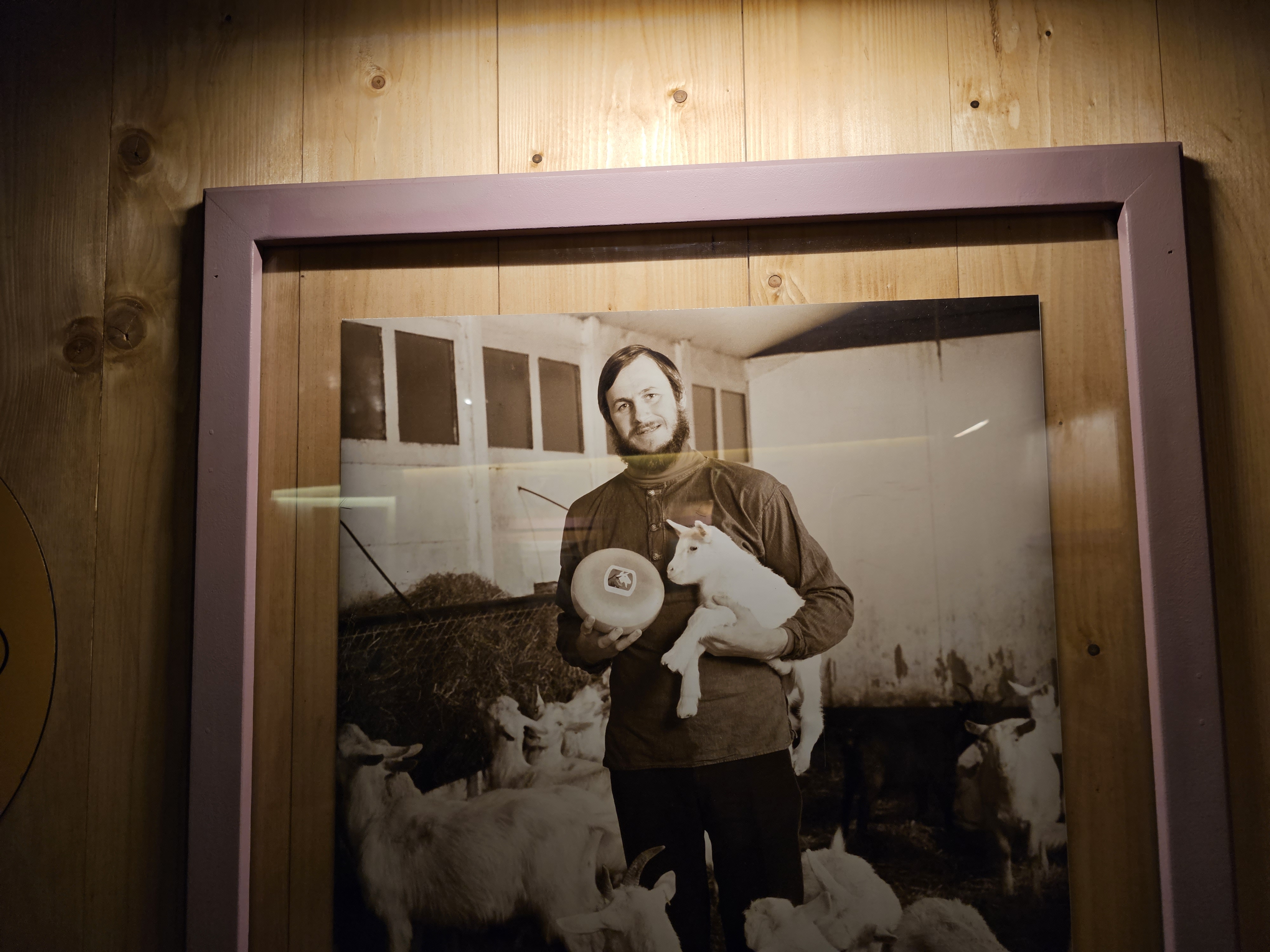 사진 속 남성은 웃으며 염소 한 마리를 품에 안고 있으며, 한 손에는 무언가 둥근 물체를 들고 있다. 이 남성이 헨리 윌리그이리라. 배경에는 염소들이 있는 축사 내부가 보인다.