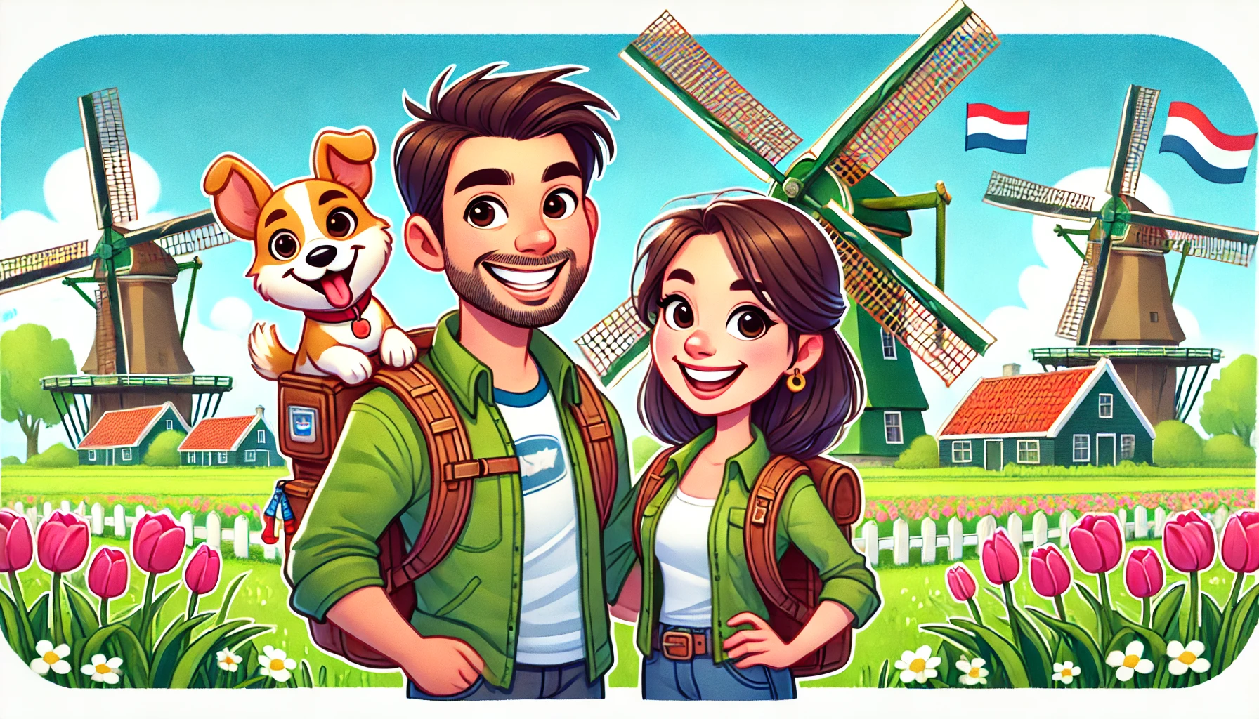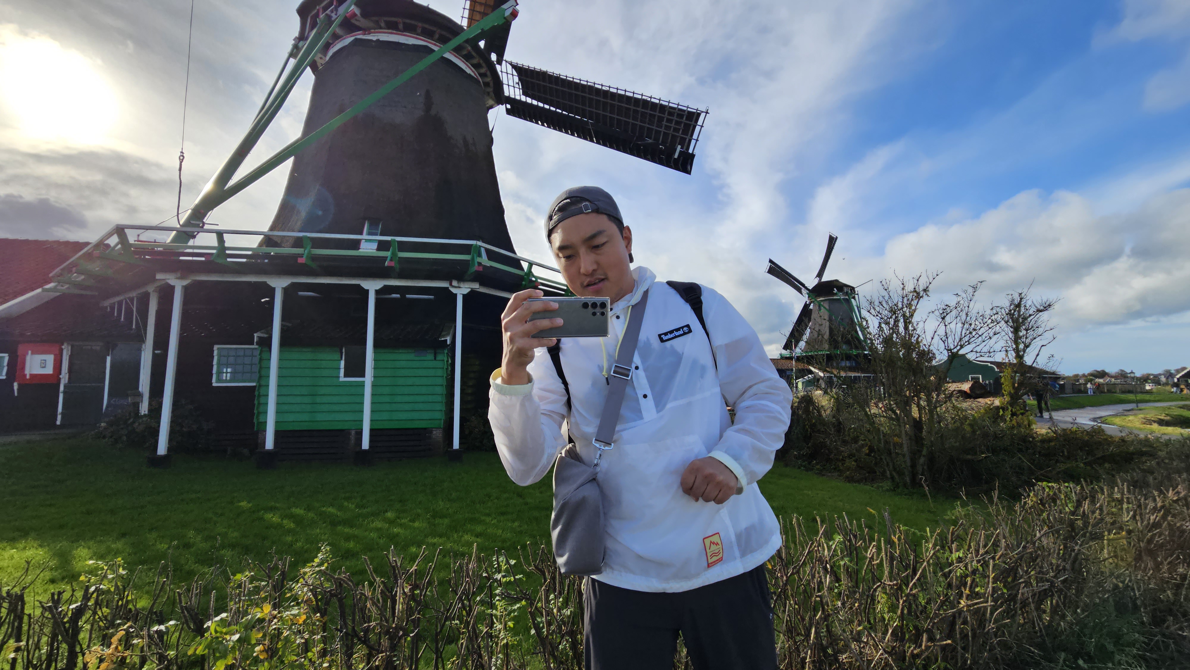잔세스칸스는 전통 풍차와 가옥들로 유명한 마을로, 이런 독특한 건축물들이 네덜란드 전통 문화를 대변한다. 호두의 캐주얼한 복장이 전통적인 배경과 대비를 이루며, 건물의 크기와 분위기를 더욱 부각시키는 역할을 한다.