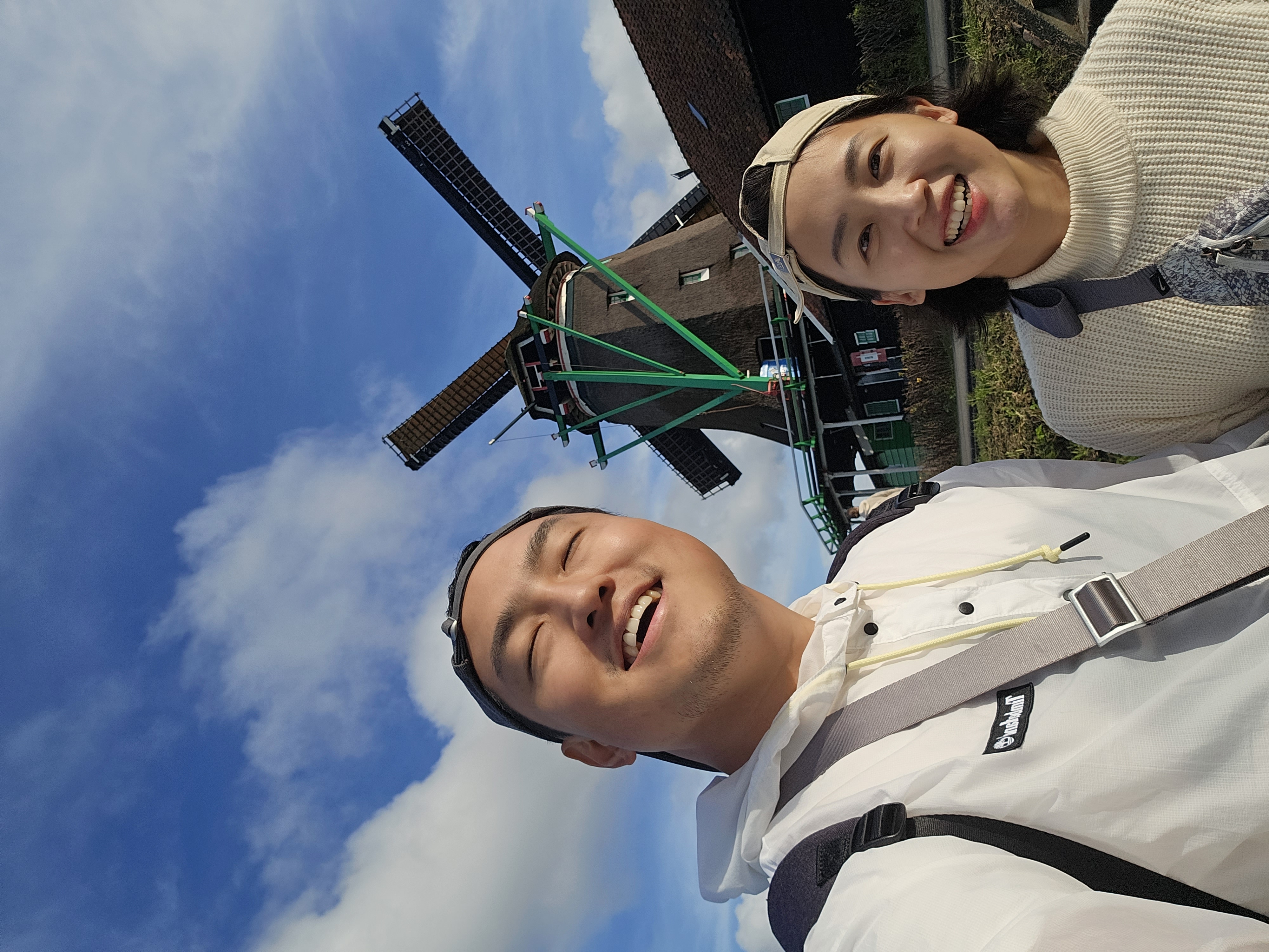 우리 모습이 행복해 보인다. 풍차와 맑은 하늘이 확실히 유럽의 여행지 느낌을 준다. 바람이 조금 불었는지 내가 바람막이를 입고 있었다. 서로를 찍어주다 함께 찍은 사진.