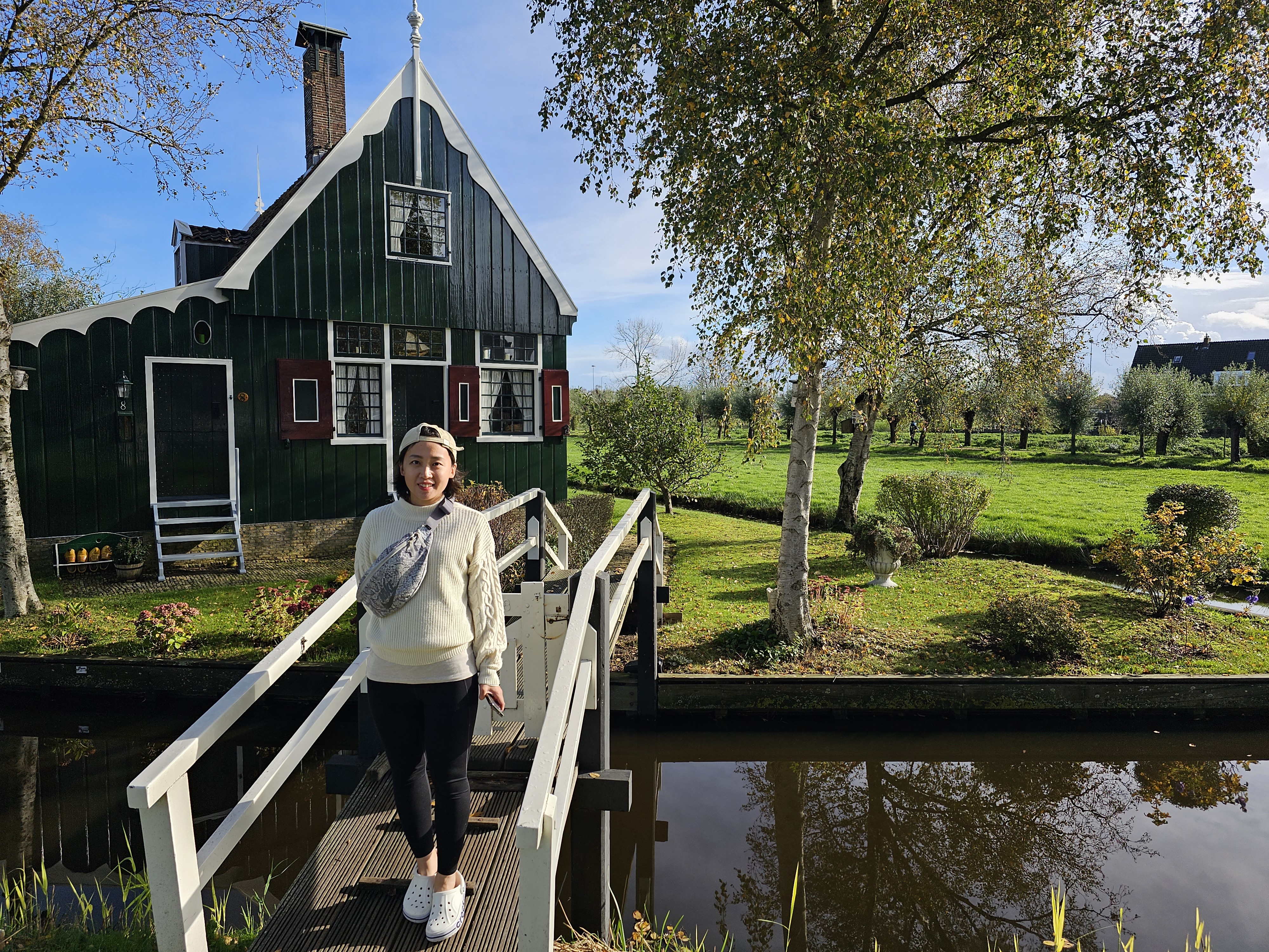 잔세스칸스는 전통 풍차와 가옥들로 유명한 마을로, 이런 독특한 건축물들이 네덜란드 전통 문화를 대변한다. 호두의 캐주얼한 복장이 전통적인 배경과 대비를 이루며, 건물의 크기와 분위기를 더욱 부각시키는 역할을 한다.