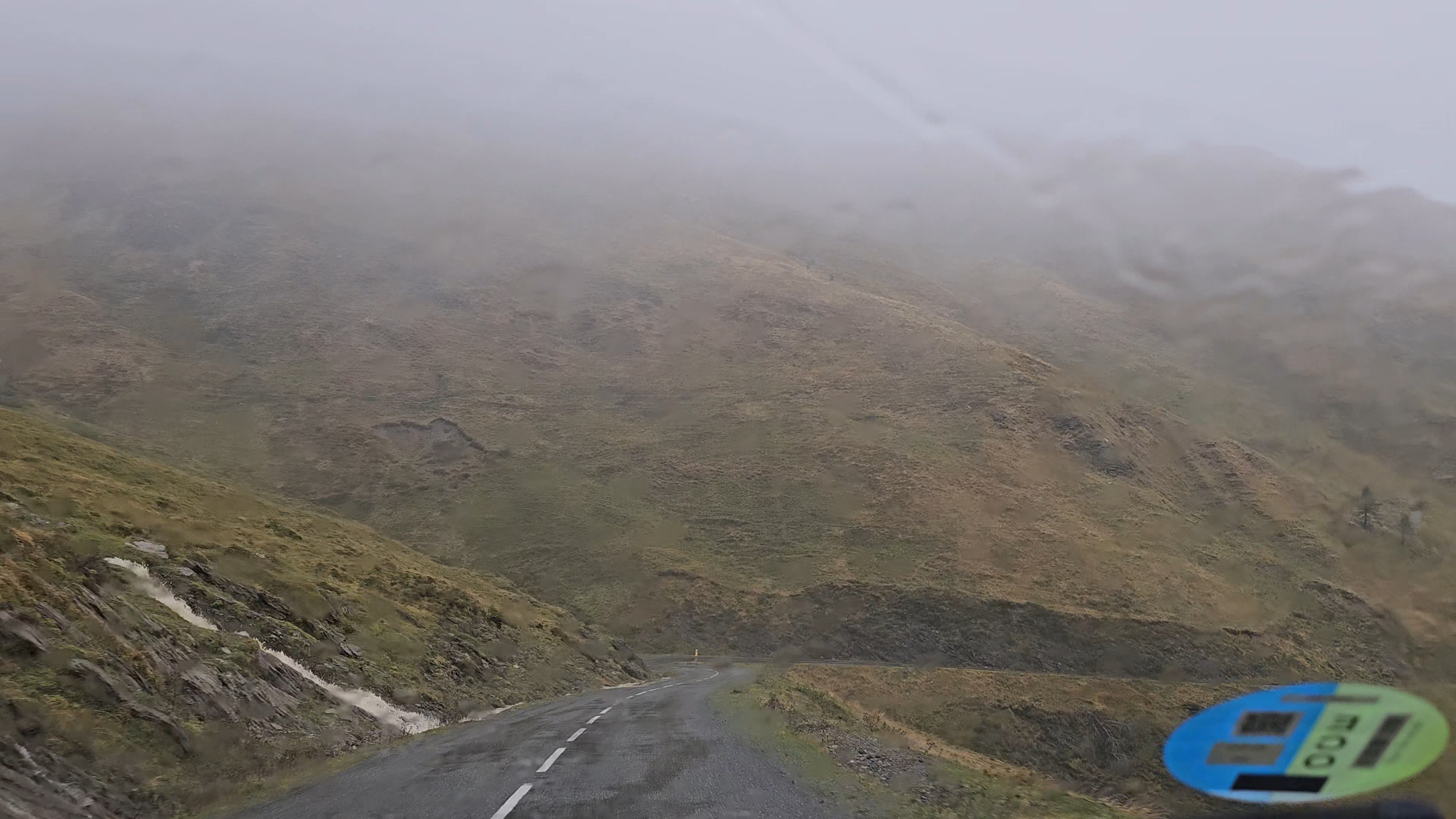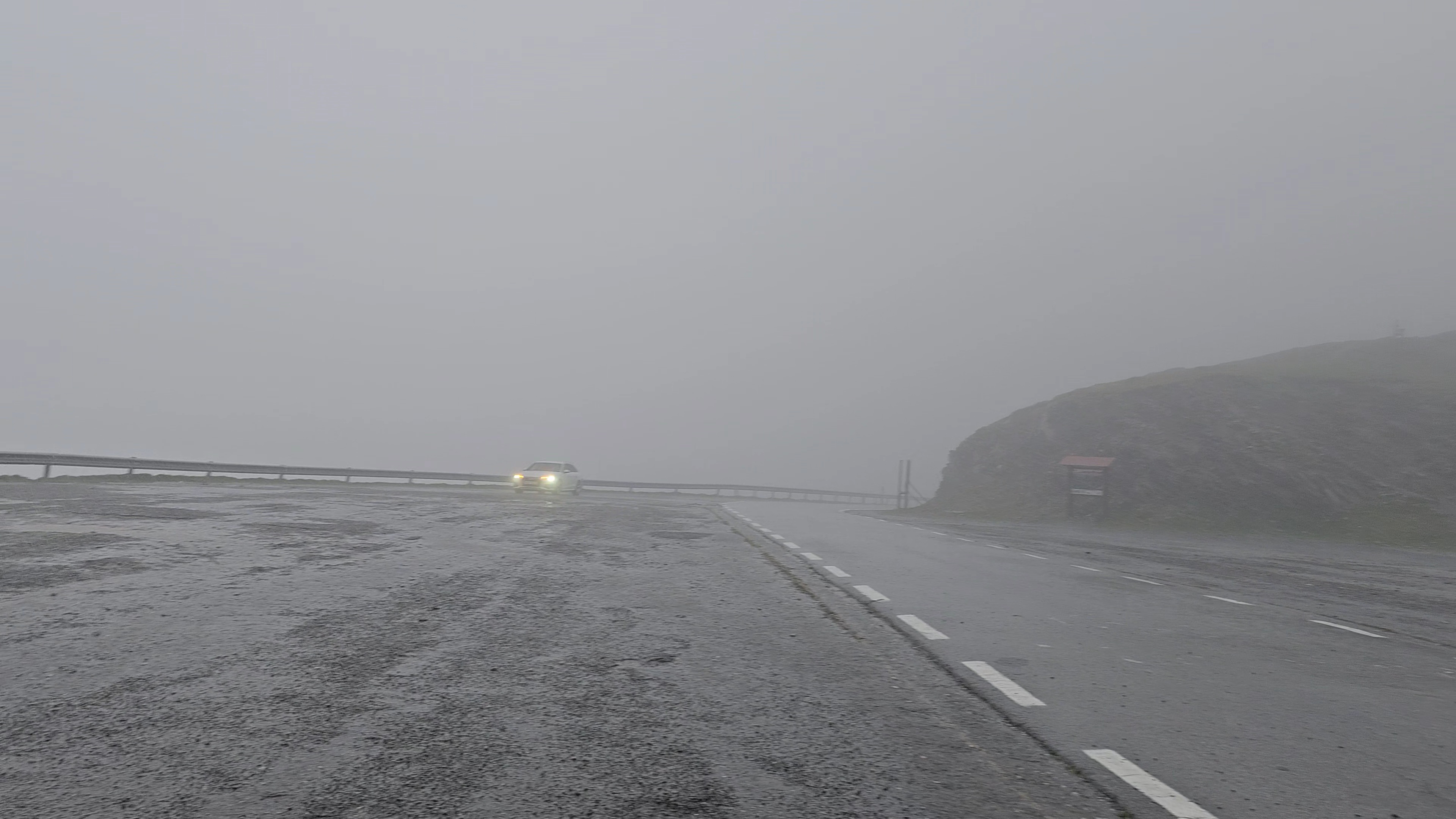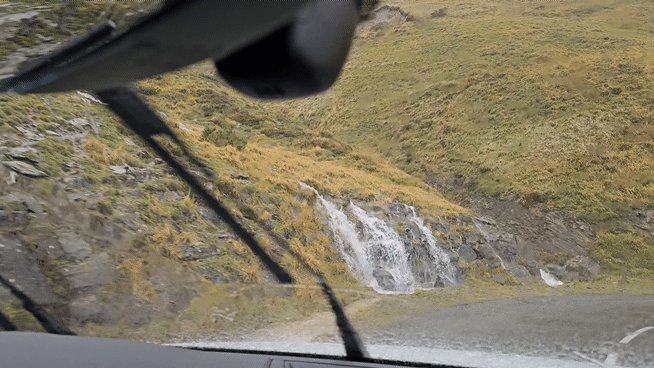 국경을 통과하는 길로 올라가는 중. 내리는 비가 폭포가 되서 흘러내린다. 아무 건물도 없고 굽어올라가느라 양옆엔 야트막한 언덕높이의 위협적이지 않은 지형을 지나간다. 비는 많이 오지만 한낮이라 밝아서 기분좋은 주행이 계속된다.