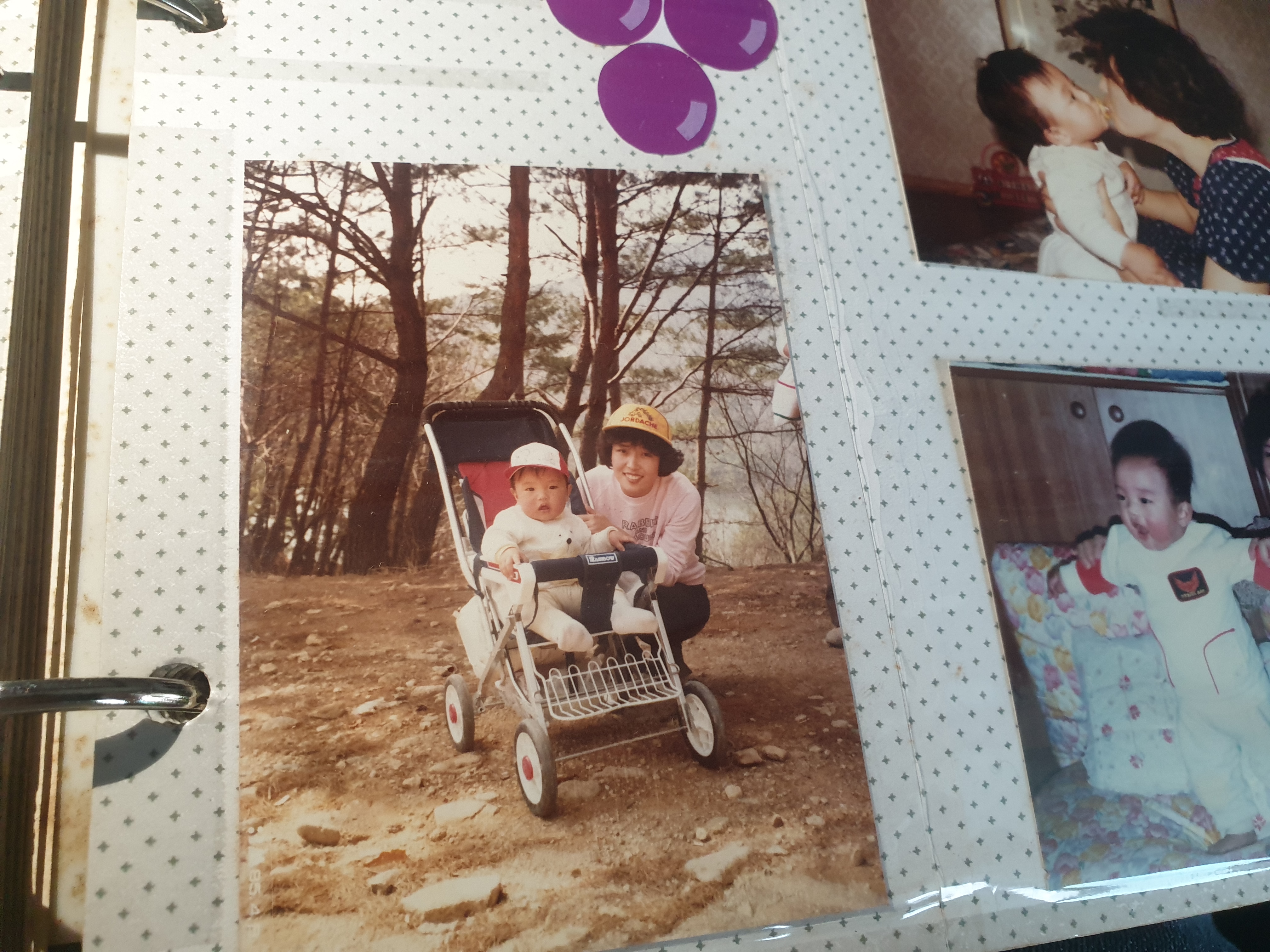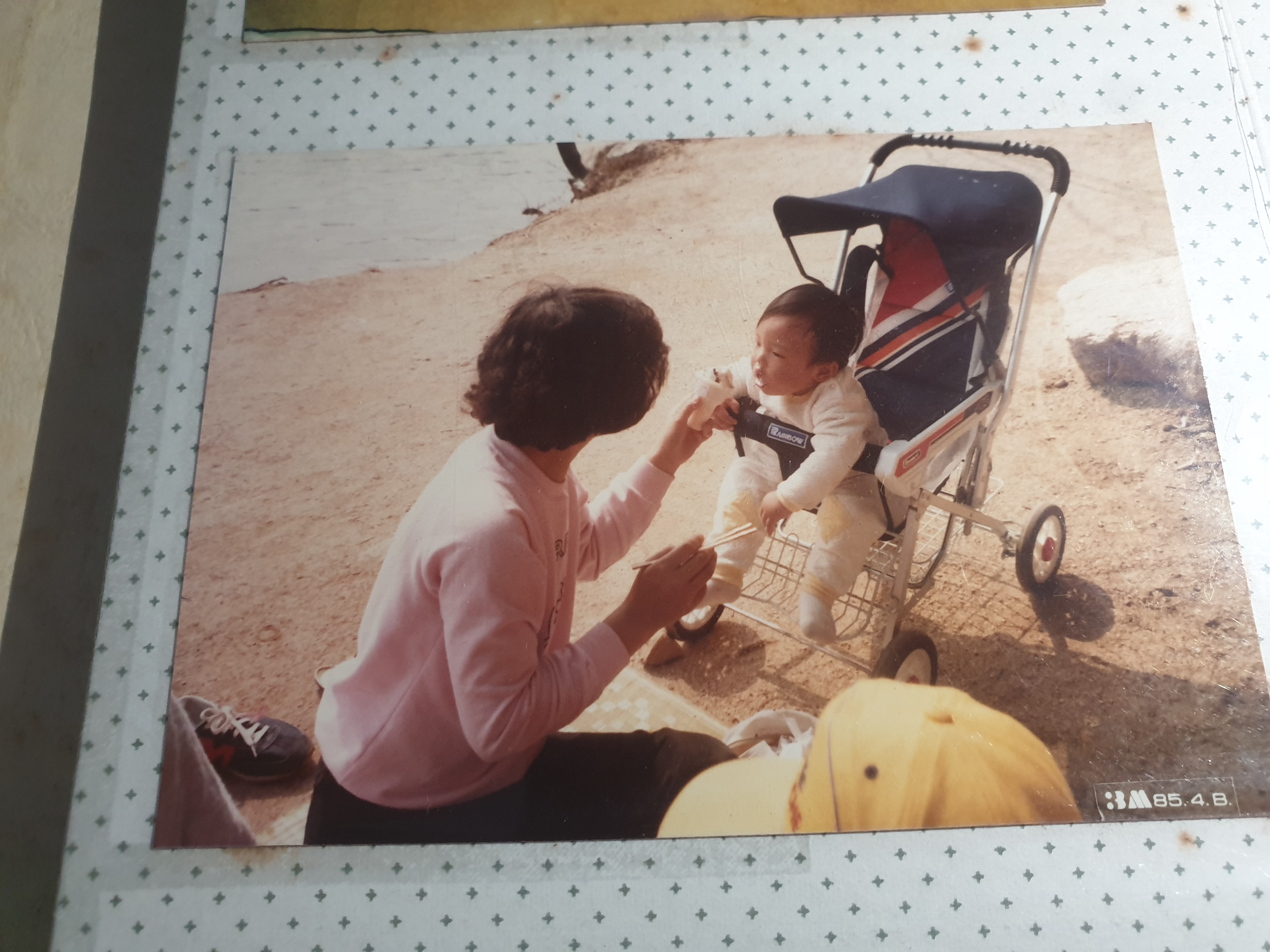 아기가 태어나기 전에 본 앨범이라서 이당시엔 감흥이 덜했지만 지금에 와서보니 참 많은 것이 보이는 사진이다. 요즘의 유모차보다 안락함이 떨어져보이는 시트로 되어있다는 것이 그렇고, 엄마도 저당시의 나를 키울때는 맘편히 식사하지 못했겠구나 하는 느낌도 받았다.