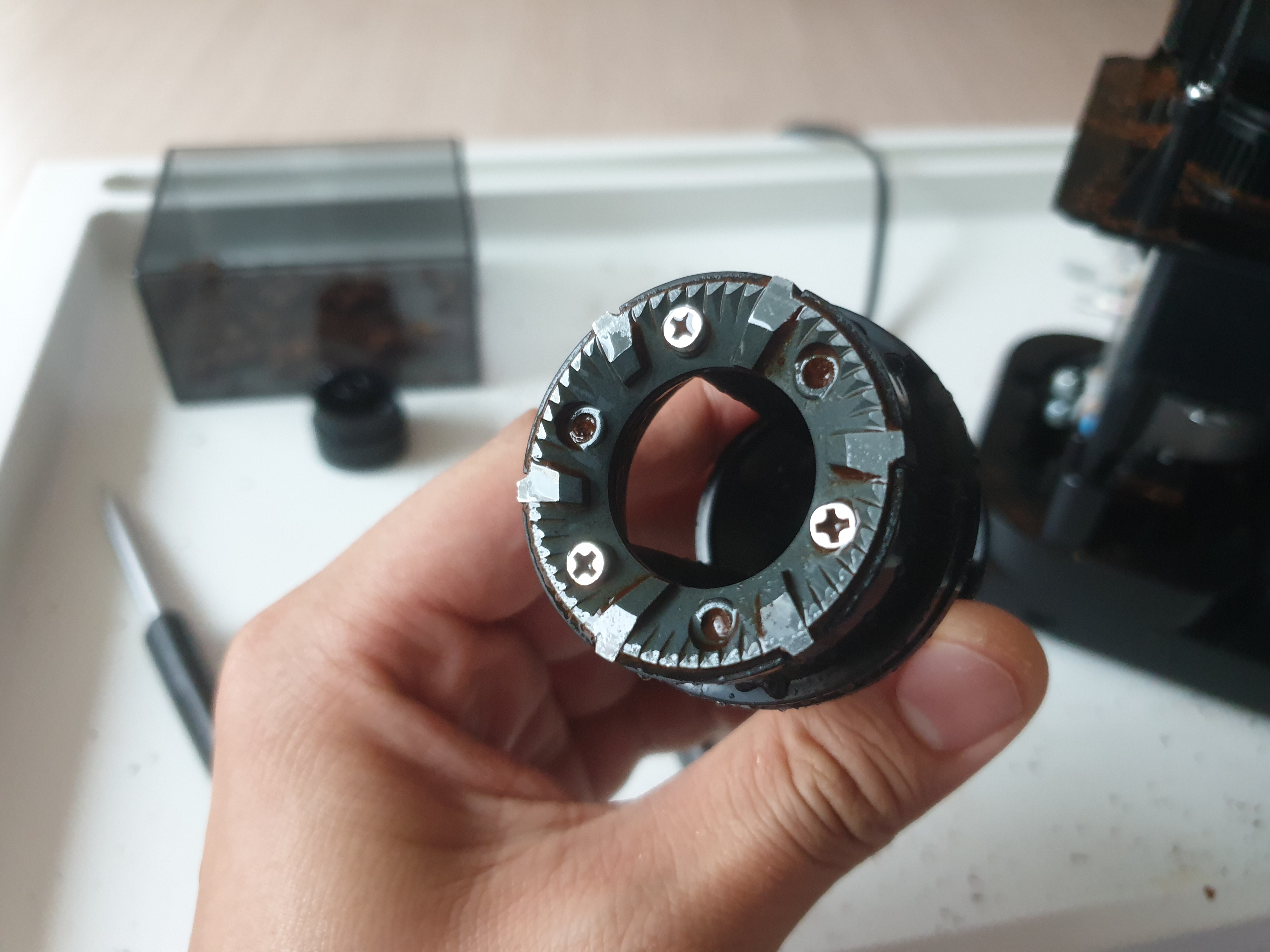 커피 원두 그라인딩 (갈기) 라는게 별게 없긴하다. 이 멧돌(Burr)이 (마찬가지로) 같은 성질의 frame과 맞물려 돌면서 그 사이에 낀 커피원두를 갈아내는 것이다. 두 파츠가 얼마나 밀착되어서 도는지에 따라 분쇄가루의 곱기가 결정되는 것이고.