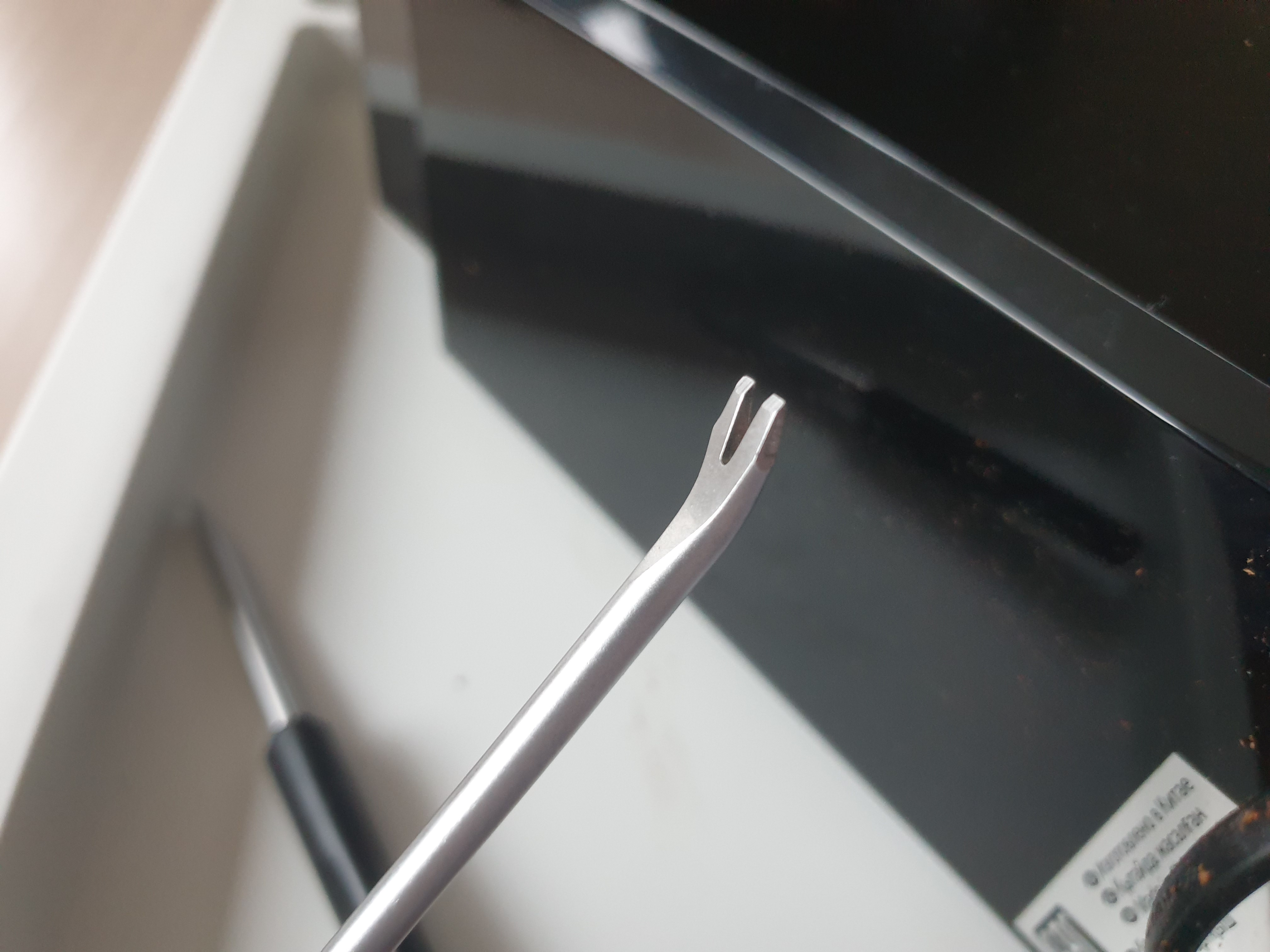 6. 요 틈에 또 드라이버나 니퍼를 밀어넣는다. 제품에 손상이 가지 않도록 살짝만 틈을 벌려주고 아래로 당기면 되겠다. 우선 네 면을 한번씩 작업해주자