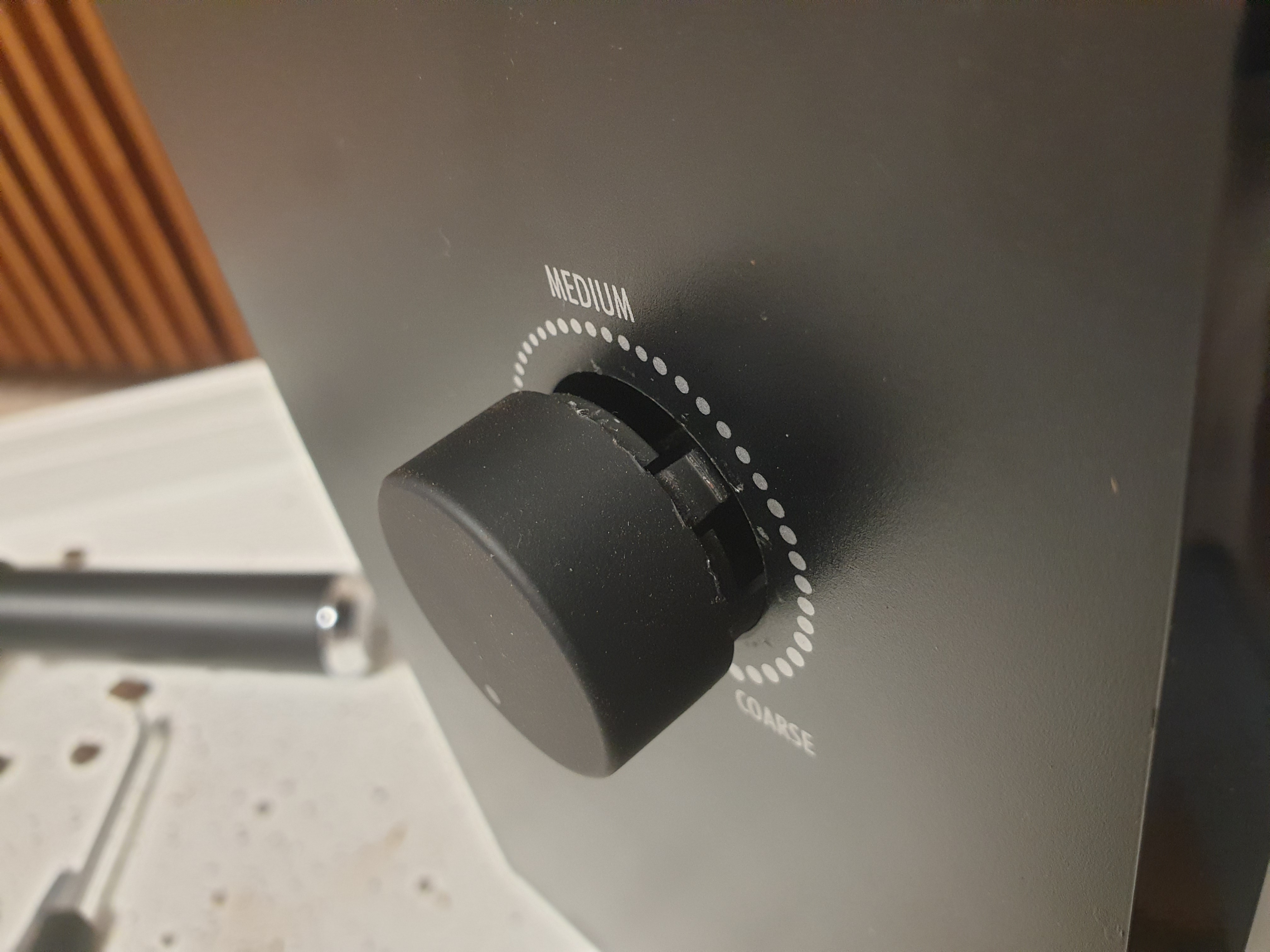 KG-79에는 두개의 다이얼이 있다. 정면에는 원두의 분쇄량을 조절하는 다이얼. 제품의 좌측에는 원두 분쇄의 입자크기 (고운 정도)를 조절하는 다이얼. 우리가 주로 주목할 다이얼은 좌측의 다이얼이다.