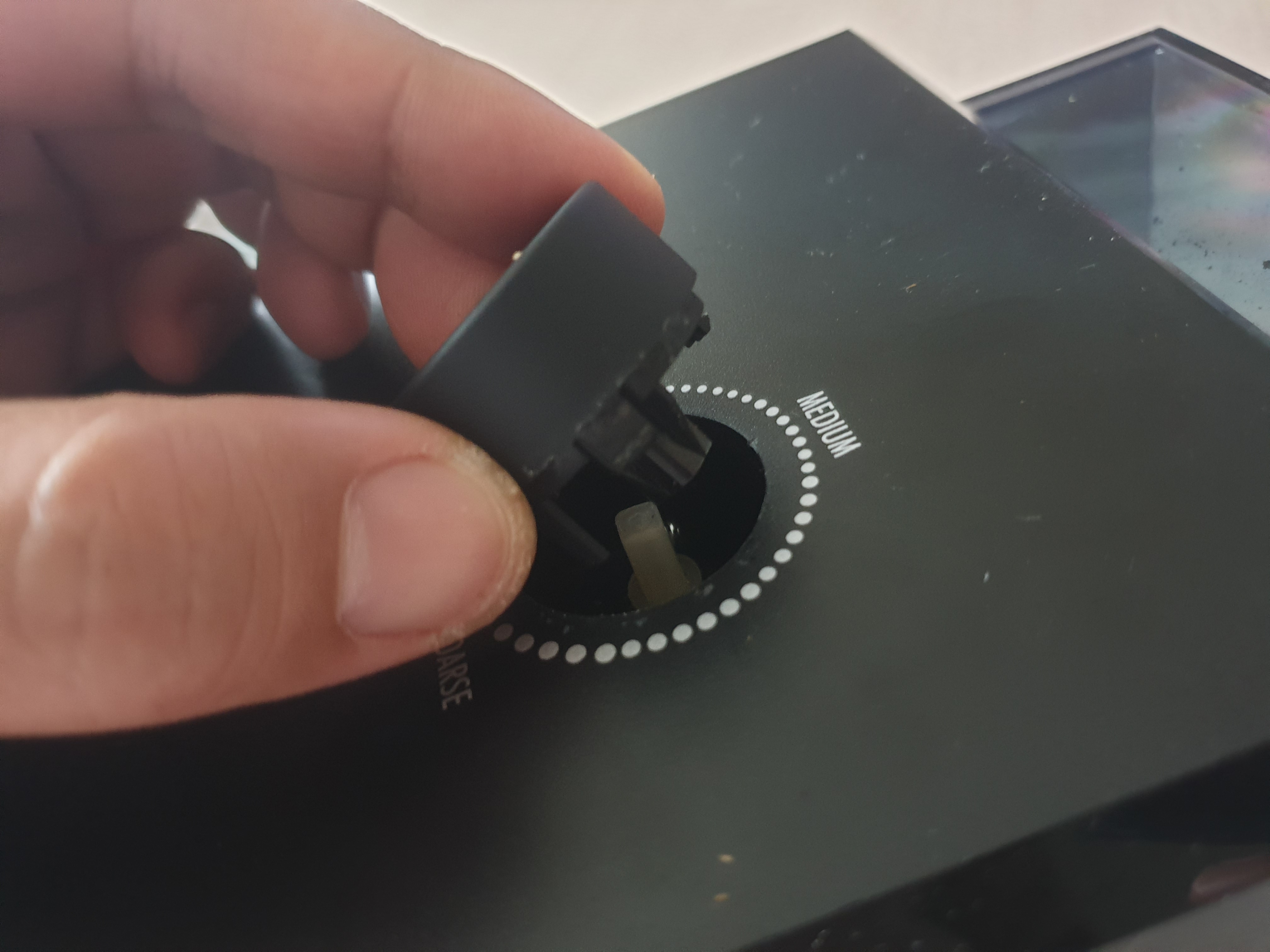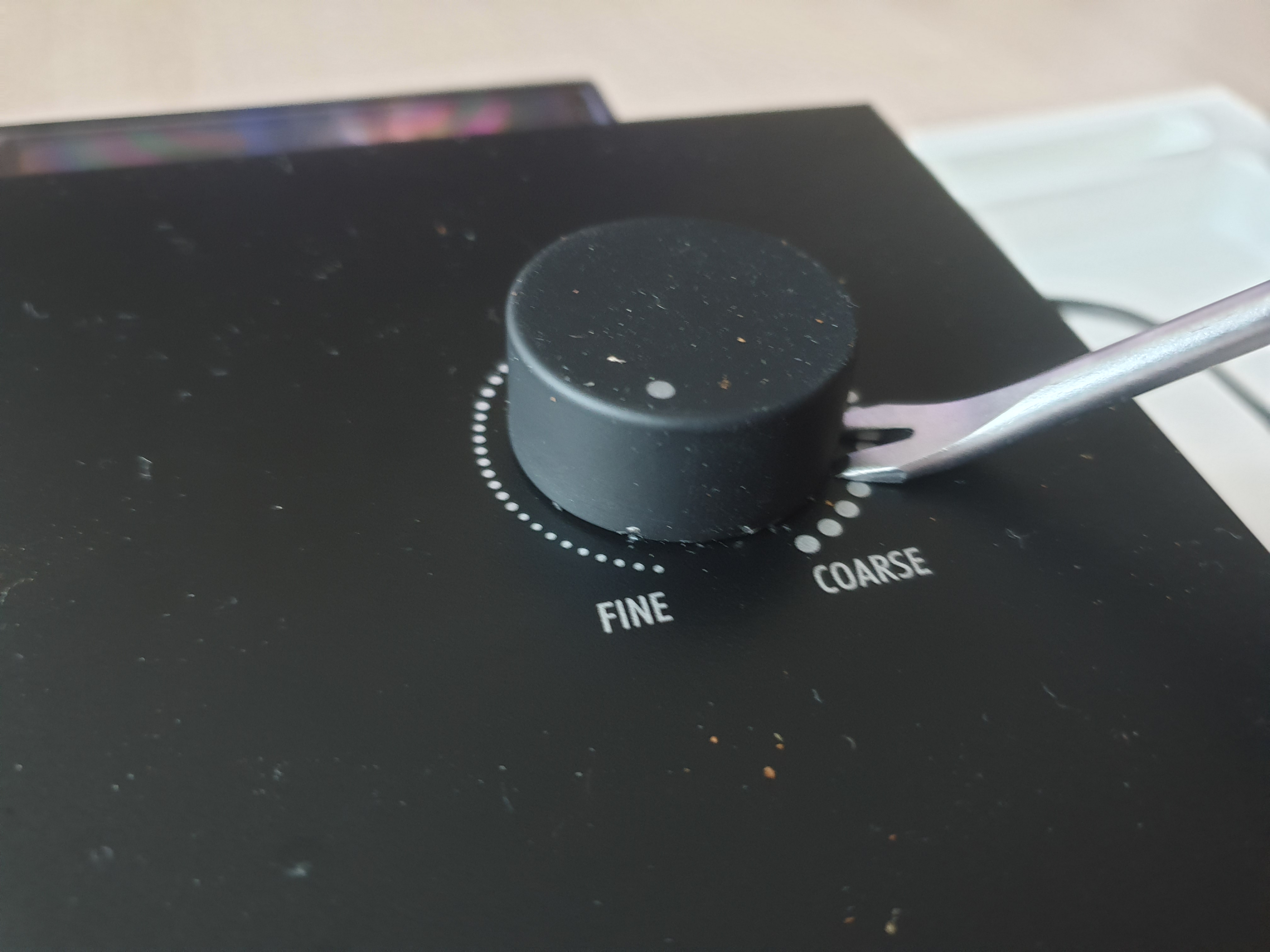 다이얼을 임시로 다시 꽂아놓으면 느낌이 온다. 저 다이얼이 가장 좌측을 가리킬때 기존의 위치를 기억해두자. 가장 Fine (고운) 상태의 맷돌의 상태를 튜닝하는 것이다. 더욱 고운쪽으로.