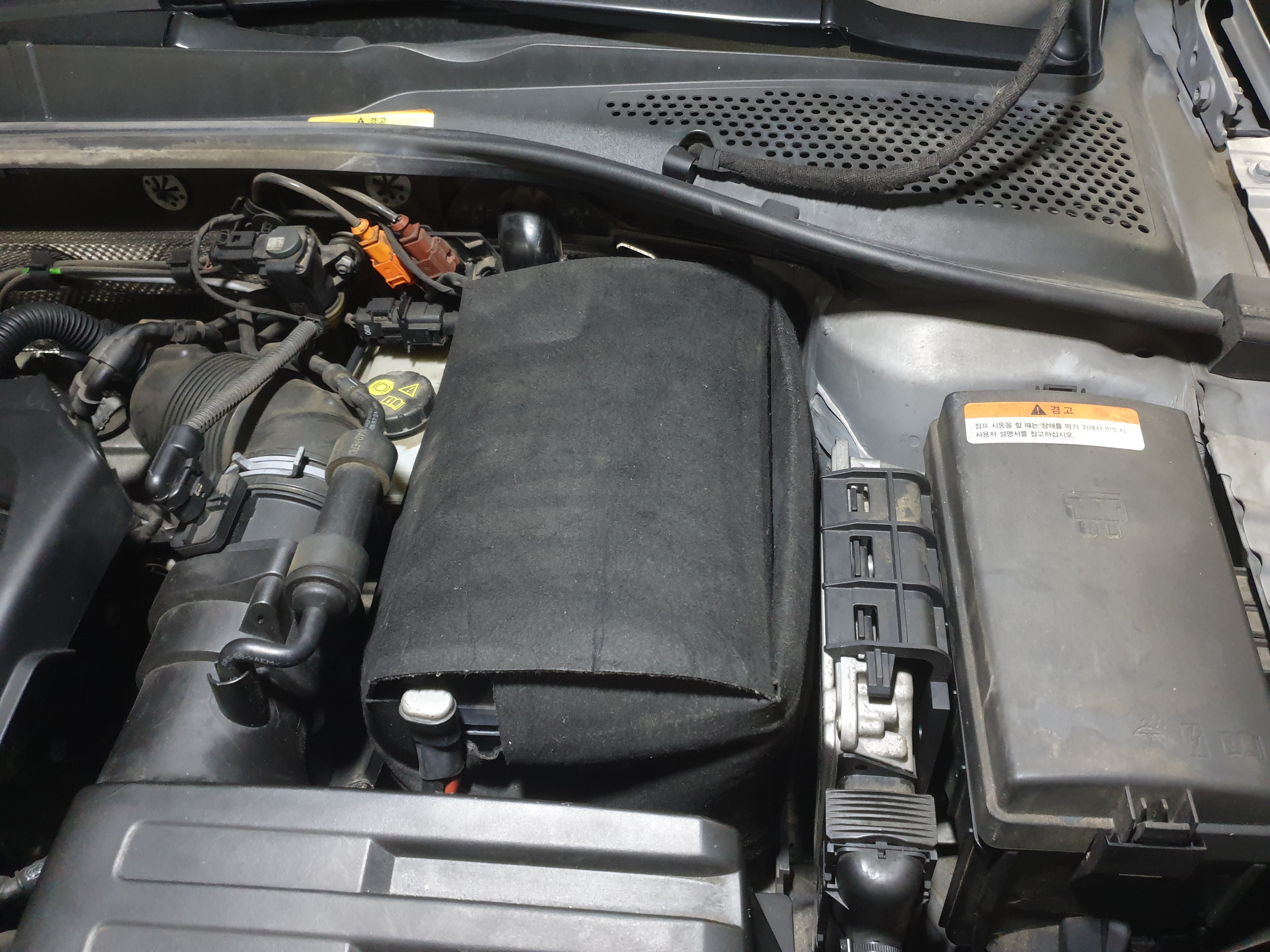 작업에 충분한 밝기가 제공되었다. 나름 깔끔하게 관리된 엔진룸. 우측 상단에 배터리가 보인다.