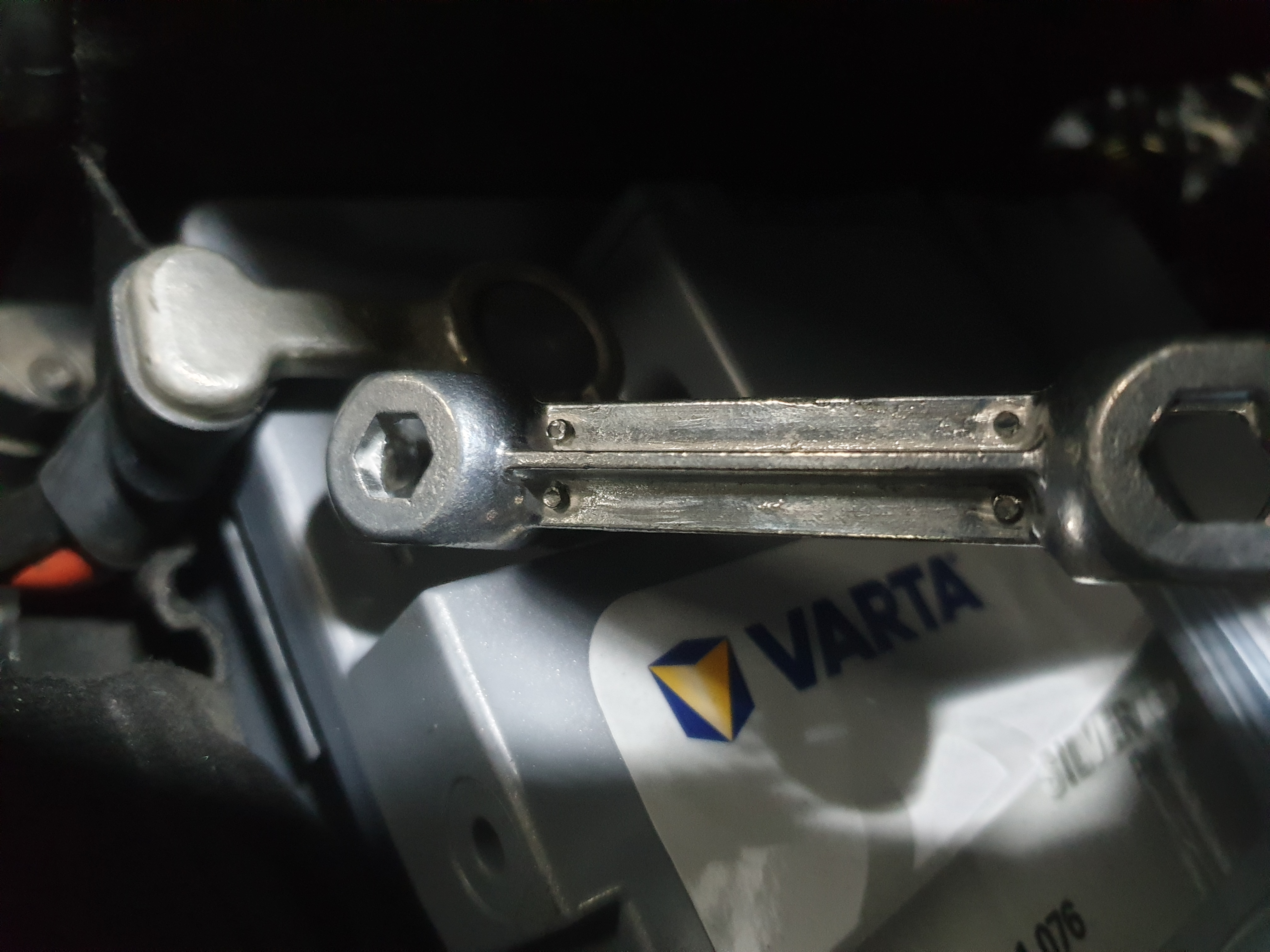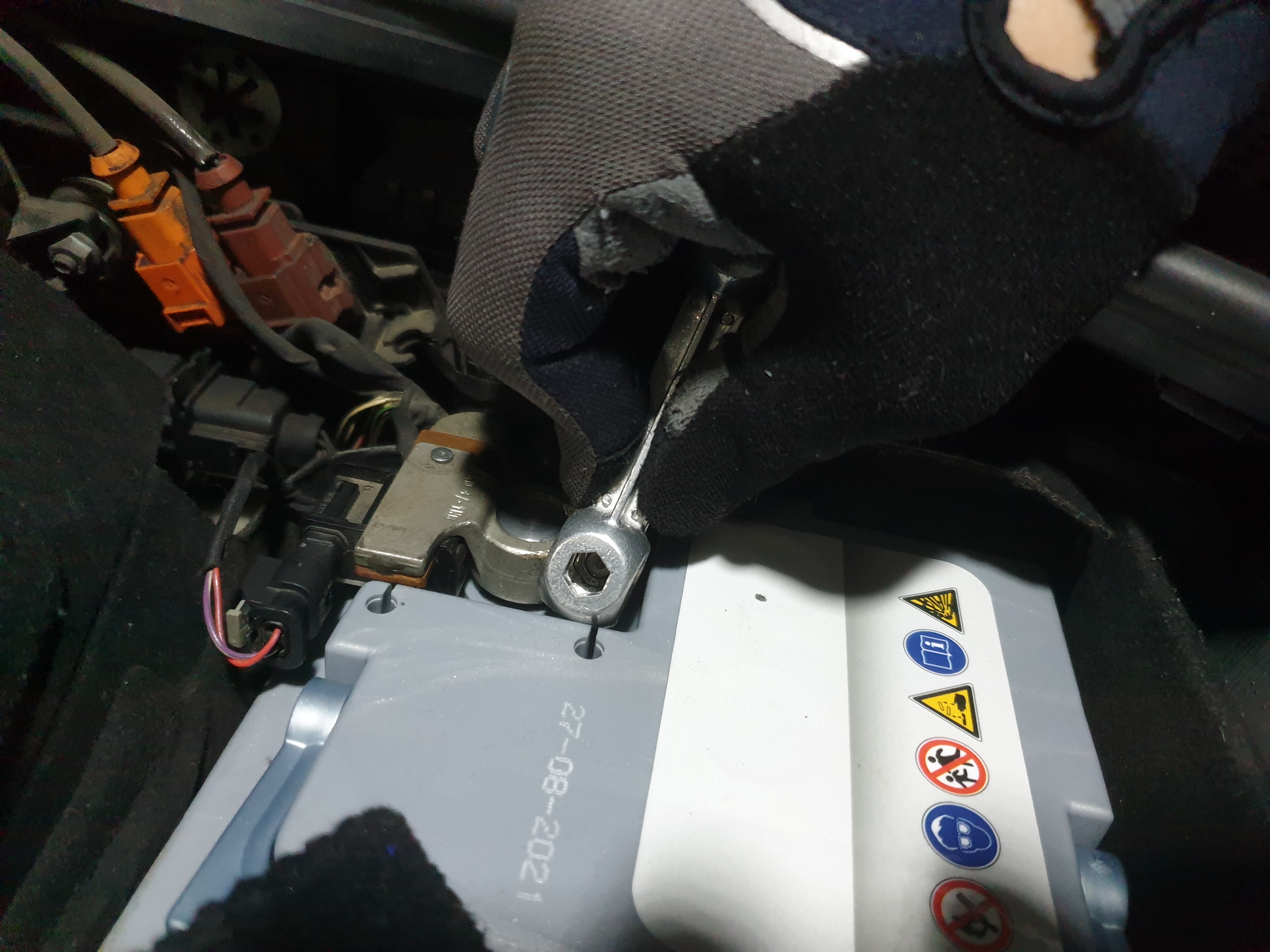 플러스쪽도 마찬가지 방법으로 분리해준다. 그리고 자세히 보면 깊숙한 곳에 배터리를 고정하고 있는 볼트가 보인다. 이걸 몽키스패너만으로 제거해야하는데 늘 이게 너무 힘들었다.