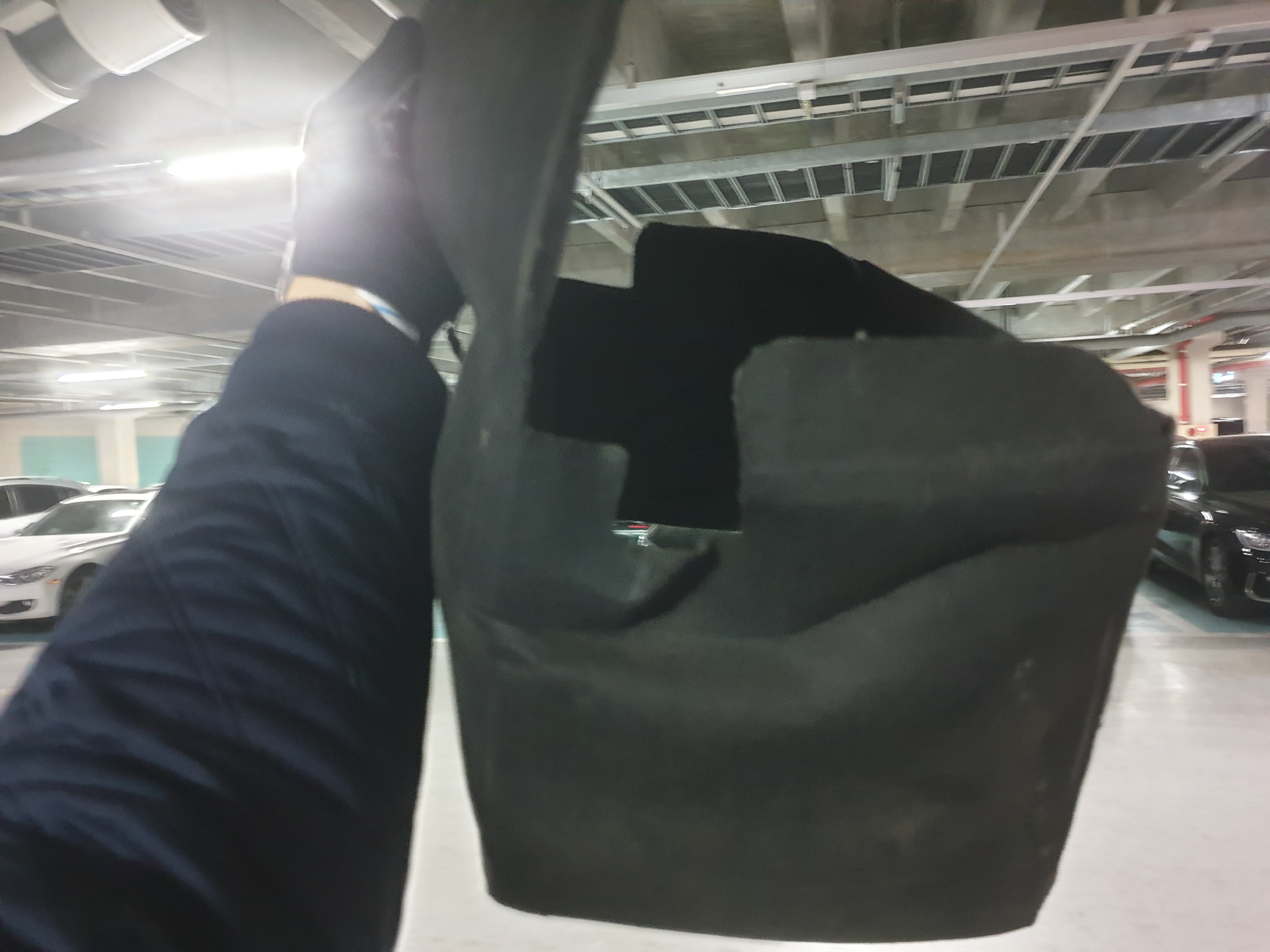 휑해진 자리. 원래는 배터리가 위치하는 곳. 단자가 다른쪽에 접촉될까봐 절연체 털장갑으로 감싸두었다.