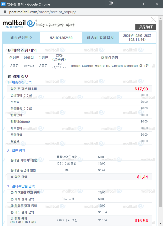 그래서 배송비는 16.54달러가 들었다 약 2만원.