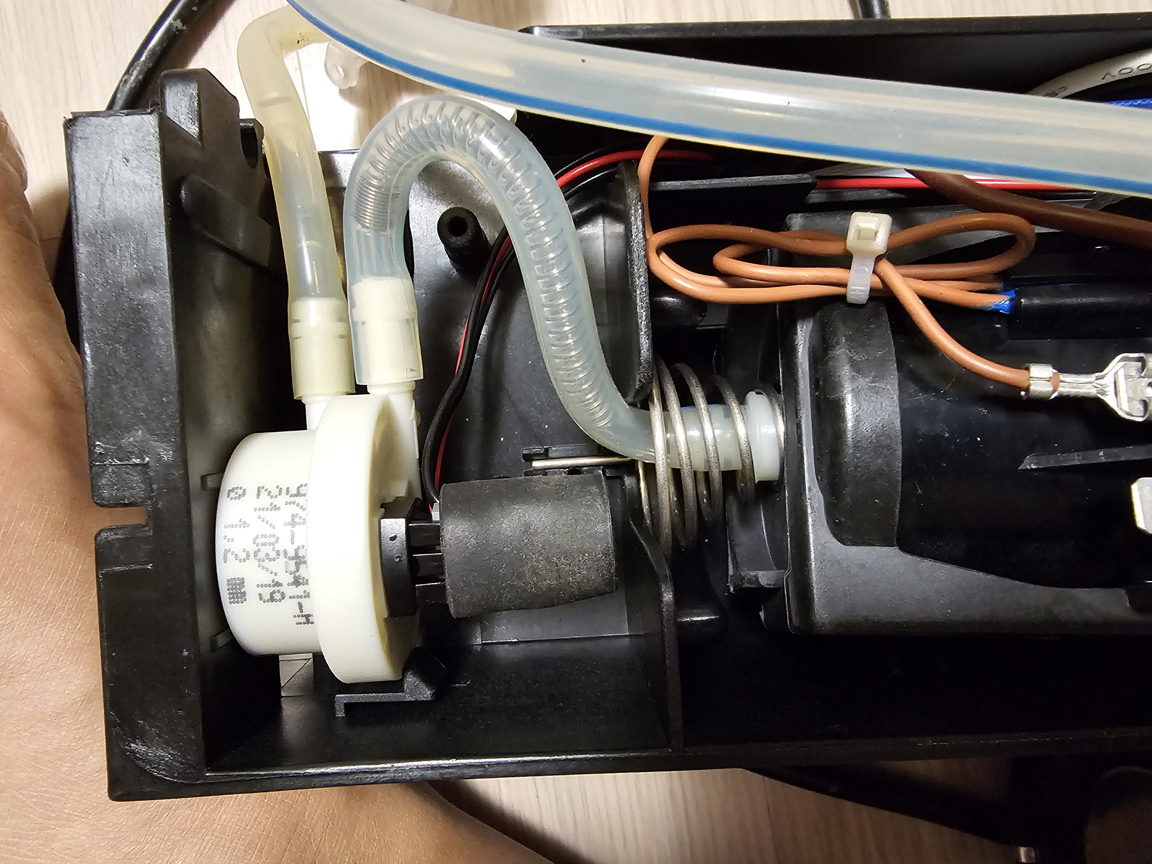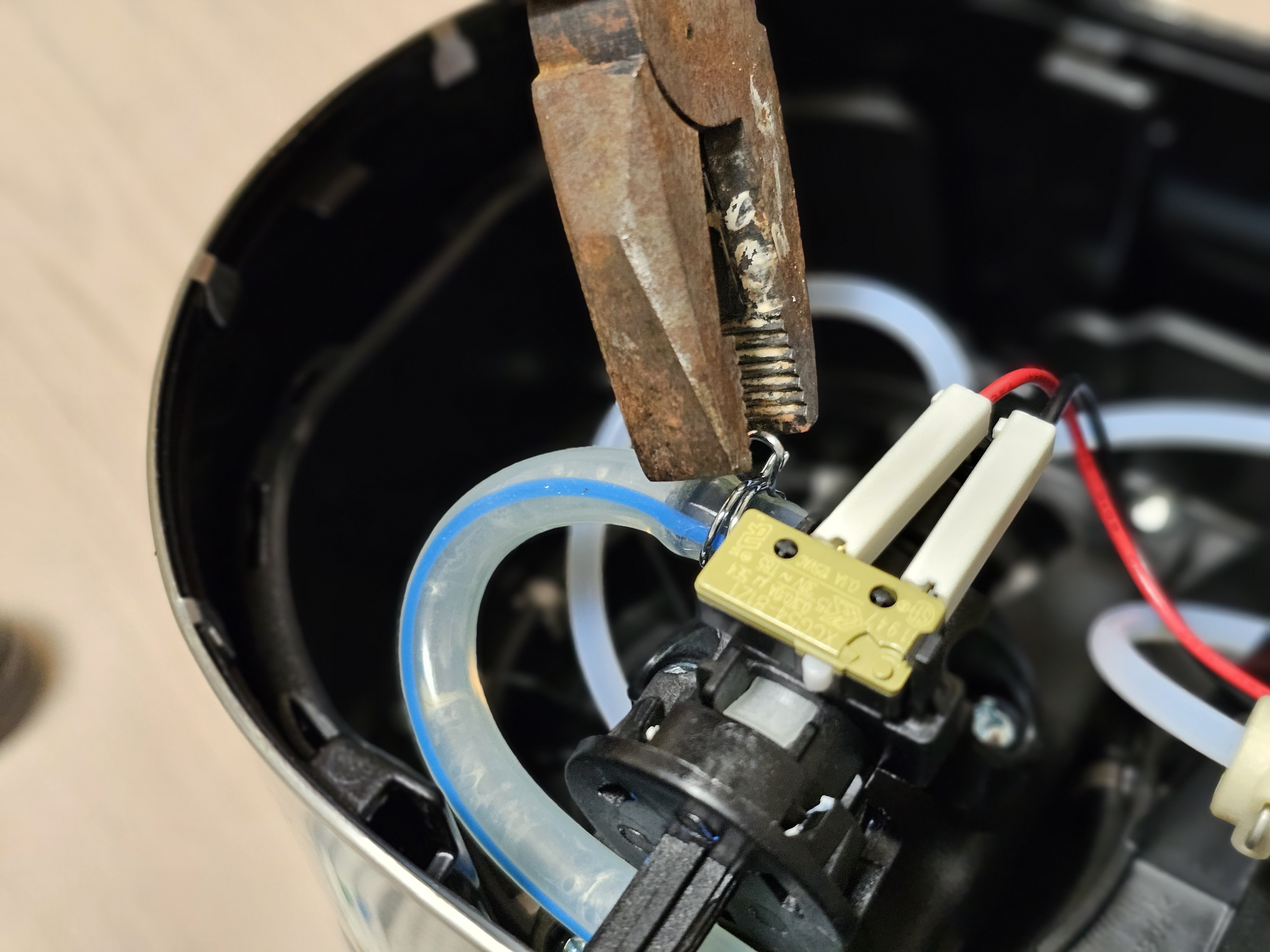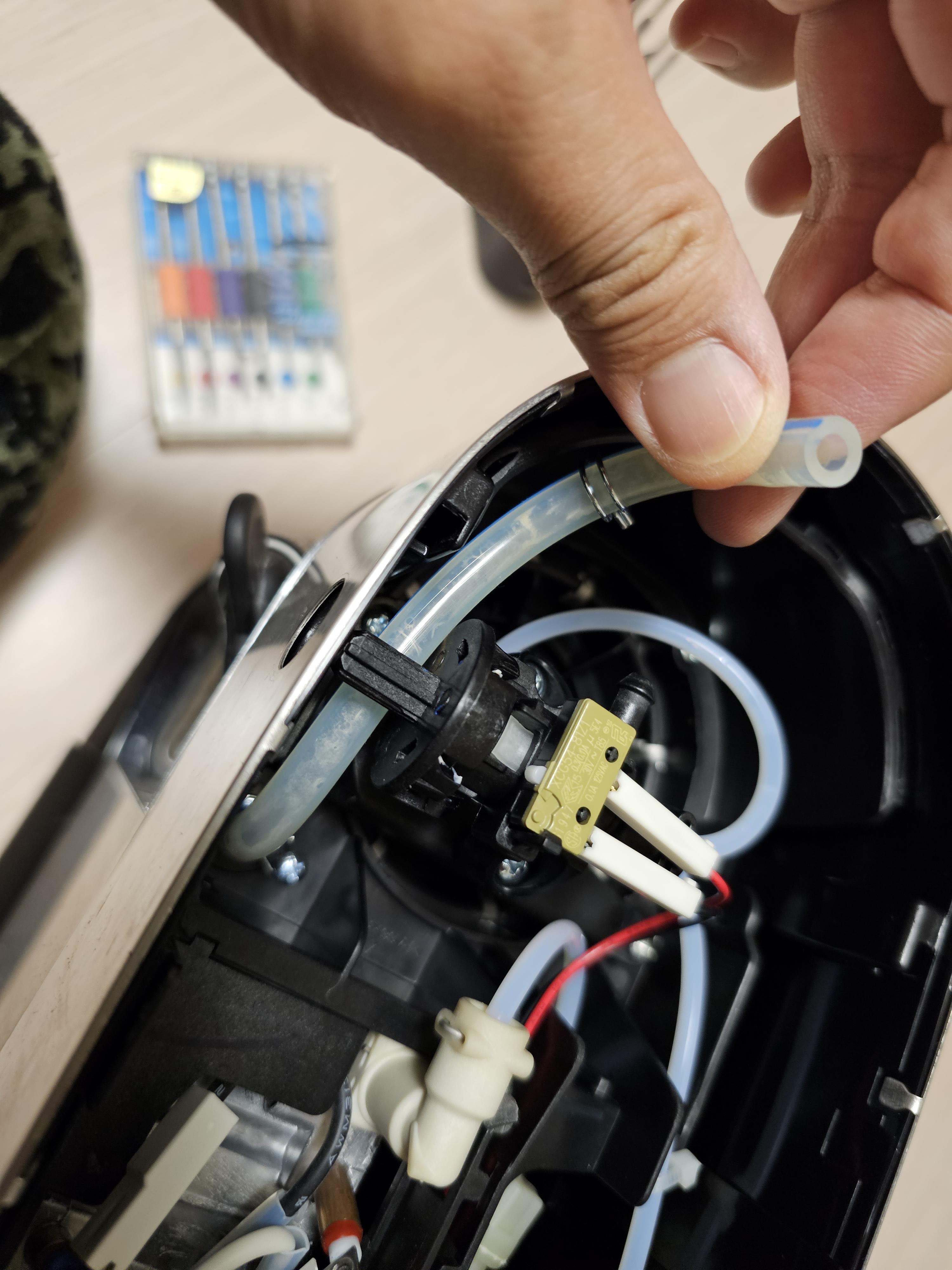 펜치로 상단부에 고정되어있는 클립을 먼저 제거해준다. 물이 순환하는 상황에서 기계 내부에 조금이라도 물이 새면 안되니 아주 단단하게 고정되어 있다. 펜치가 필요한 이유이다.